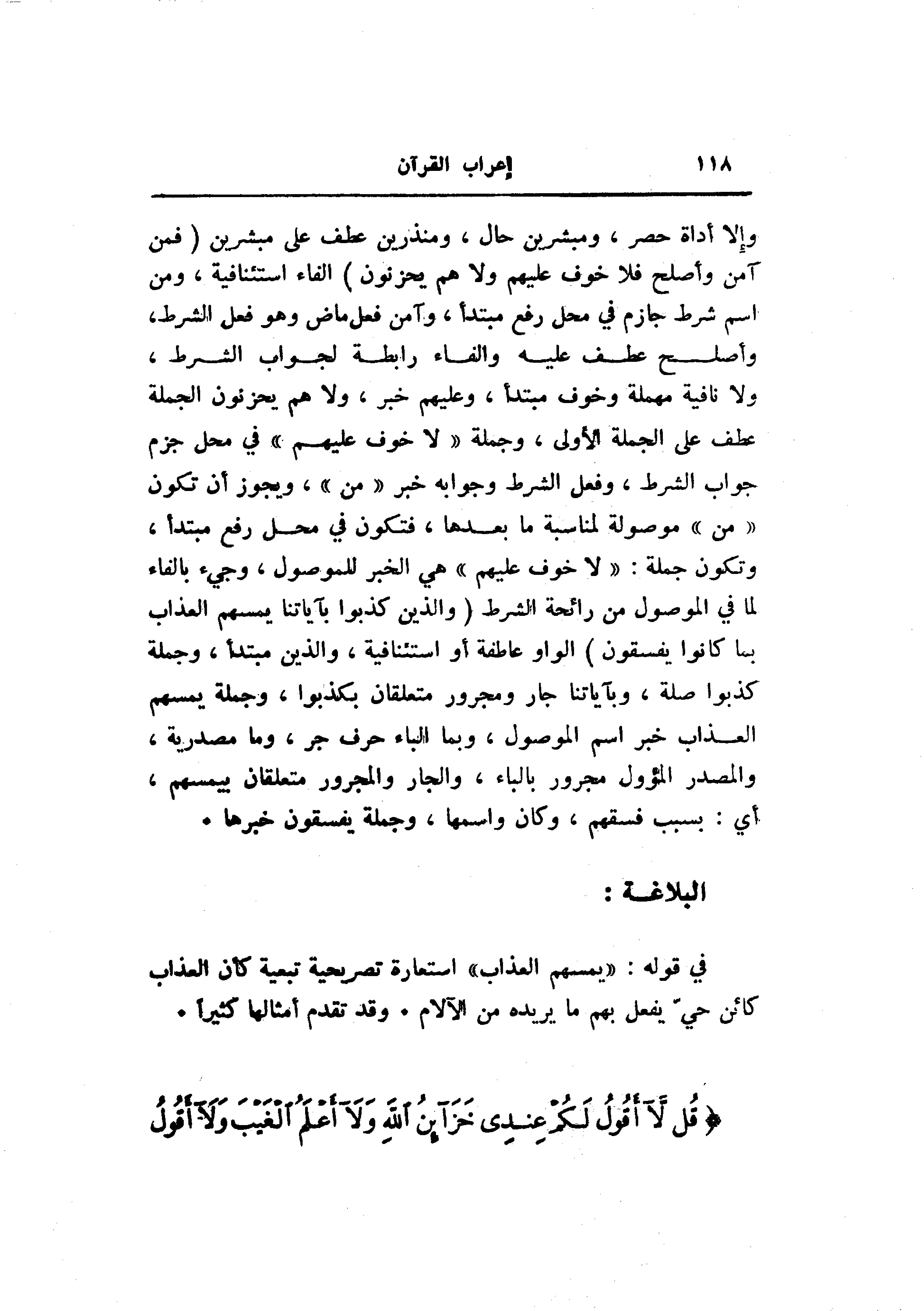 وإلا أداة حصر، ومبشرين حال، ومنذرين عطف على مبشرين (فَمَنْ آمَنَ وَأَصْلَحَ فَلا خَوْفٌ عَلَيْهِمْ وَلا هُمْ يَحْزَنُونَ) الفاء استئنافية، ومن اسم شرط جازم في محل رفع مبتدأ، وآمن فعل ماض وهو فعل الشرط، وأصلح عطف عليه والفاء رابطة لجواب الشرط، ولا نافية مهملة وخوف مبتدأ، وعليهم خبر، ولا هم يحزنون الجملة عطف على الجملة الأولى، وجملة «لا خوف عليهم» في محل جزم جواب الشرط، وفعل الشرط وجوابه خبر «من» ، ويجوز أن تكون «من» موصولة لمناسبة ما بعدها، فتكون في محل رفع مبتدأ، وتكون جملة: «لا خوف عليهم» هي الخبر للموصول، وجيء بالفاء لما في الموصول من رائحة الشرط (وَالَّذِينَ كَذَّبُوا بِآياتِنا يَمَسُّهُمُ الْعَذابُ بِما كانُوا يَفْسُقُونَ) الواو عاطفة أو استئنافية، والذين مبتدأ، وجملة كذبوا صلة، وبآياتنا جار ومجرور متعلقان بكذبوا، وجملة يمسهم العذاب خبر اسم الموصول، وبما الباء حرف جر، وما مصدرية، والمصدر المؤول مجرور بالباء، والجار والمجرور متعلقان بيمسهم، أي: بسبب فسقهم، وكان واسمها، وجملة يفسقون خبرها.