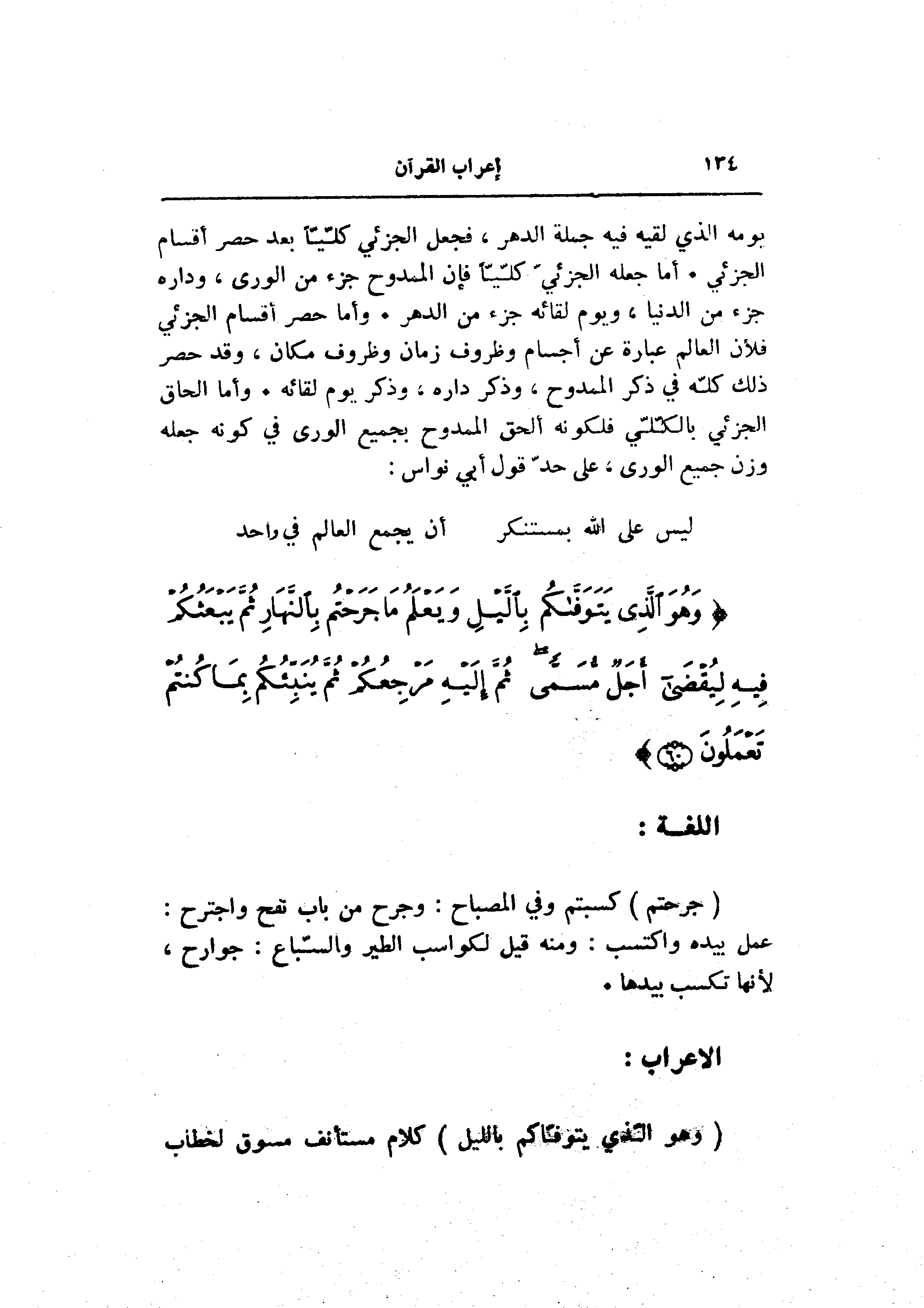 يومه الذي لقيه فيه جملة الدهر، فجعل الجزئي كلّيّا بعد حصر أقسام الجزئي. أما جعله الجزئيّ كلّيّا فإن الممدوح جزء من الورى، وداره جزء من الدنيا، ويوم لقائه جزء من الدهر. وأما حصر أقسام الجزئي فلأن العالم عبارة عن أجسام وظروف زمان وظروف مكان، وقد حصر ذلك كلّه في ذكر الممدوح، وذكر داره، وذكر يوم لقائه. وأما الحاق الجزئي بالكلّيّ فلكونه ألحق الممدوح بجميع الورى في كونه جعله وزن جميع الورى، على حدّ قول أبي نواس: