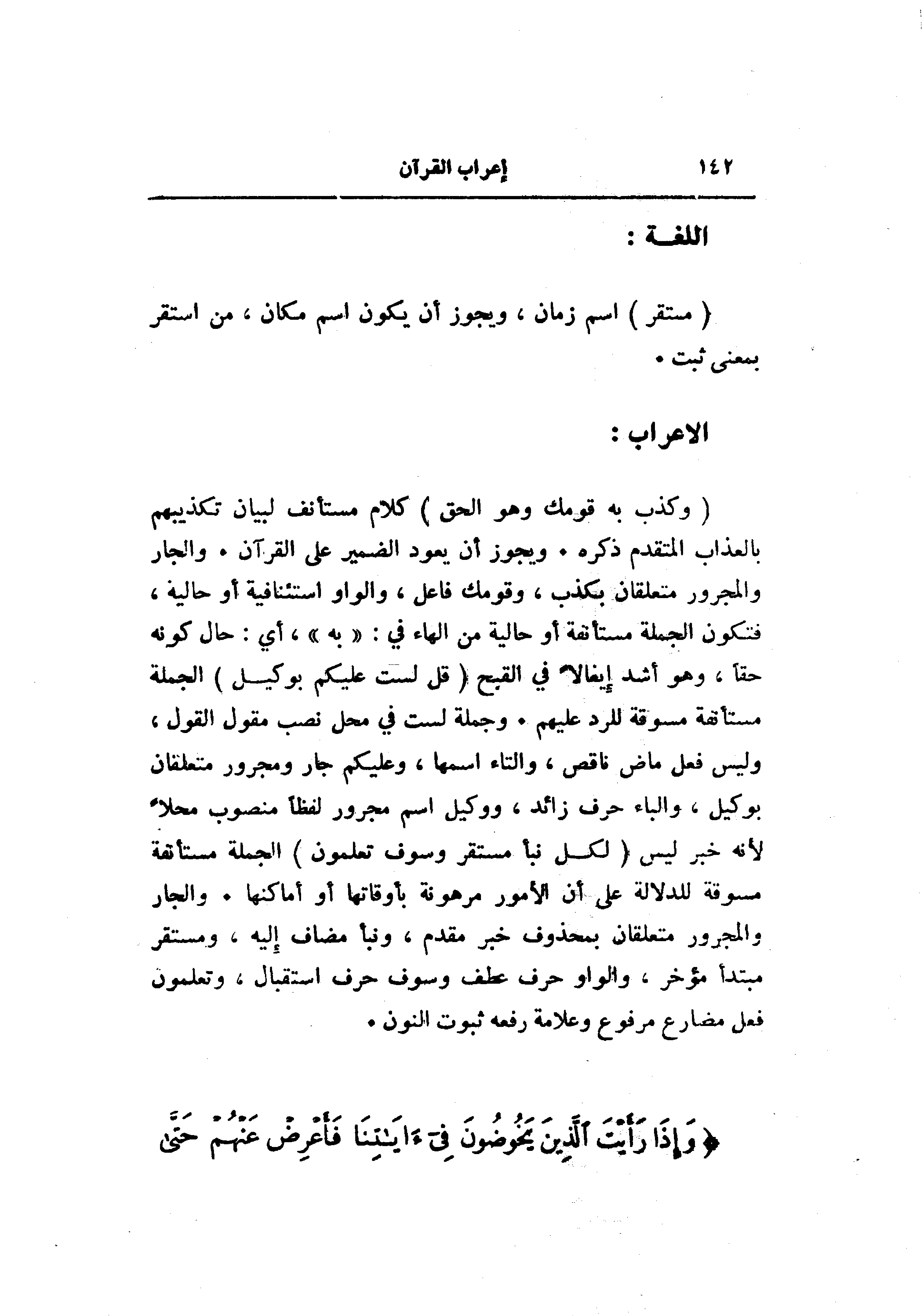 (وَكَذَّبَ بِهِ قَوْمُكَ وَهُوَ الْحَقُّ) كلام مستأنف لبيان تكذيبهم بالعذاب المتقدم ذكره. ويجوز أن يعود الضمير على القرآن. والجار والمجرور متعلقان بكذب، وقومك فاعل، والواو استئنافية أو حالية، فتكون الجملة مستأنفة أو حالية من الهاء في: «به» ، أي: حال كونه حقا، وهو أشد إيغالا في القبح (قُلْ لَسْتُ عَلَيْكُمْ بِوَكِيلٍ) الجملة مستأنفة مسوقة للرد عليهم. وجملة لست في محل نصب مقول القول، وليس فعل ماض ناقص، والتاء اسمها، وعليكم جار ومجرور متعلقان بوكيل، والباء حرف زائد، ووكيل اسم مجرور لفظا منصوب محلا لأنه خبر ليس (لِكُلِّ نَبَإٍ مُسْتَقَرٌّ وَسَوْفَ تَعْلَمُونَ) الجملة مستأنفة مسوقة للدلالة على أن الأمور مرهونة بأوقاتها أو أماكنها. والجار والمجرور متعلقان بمحذوف خبر مقدم، ونبأ مضاف إليه، ومستقر مبتدأ مؤخر، والواو حرف عطف وسوف حرف استقبال، وتعلمون فعل مضارع مرفوع وعلامة رفعه ثبوت النون.