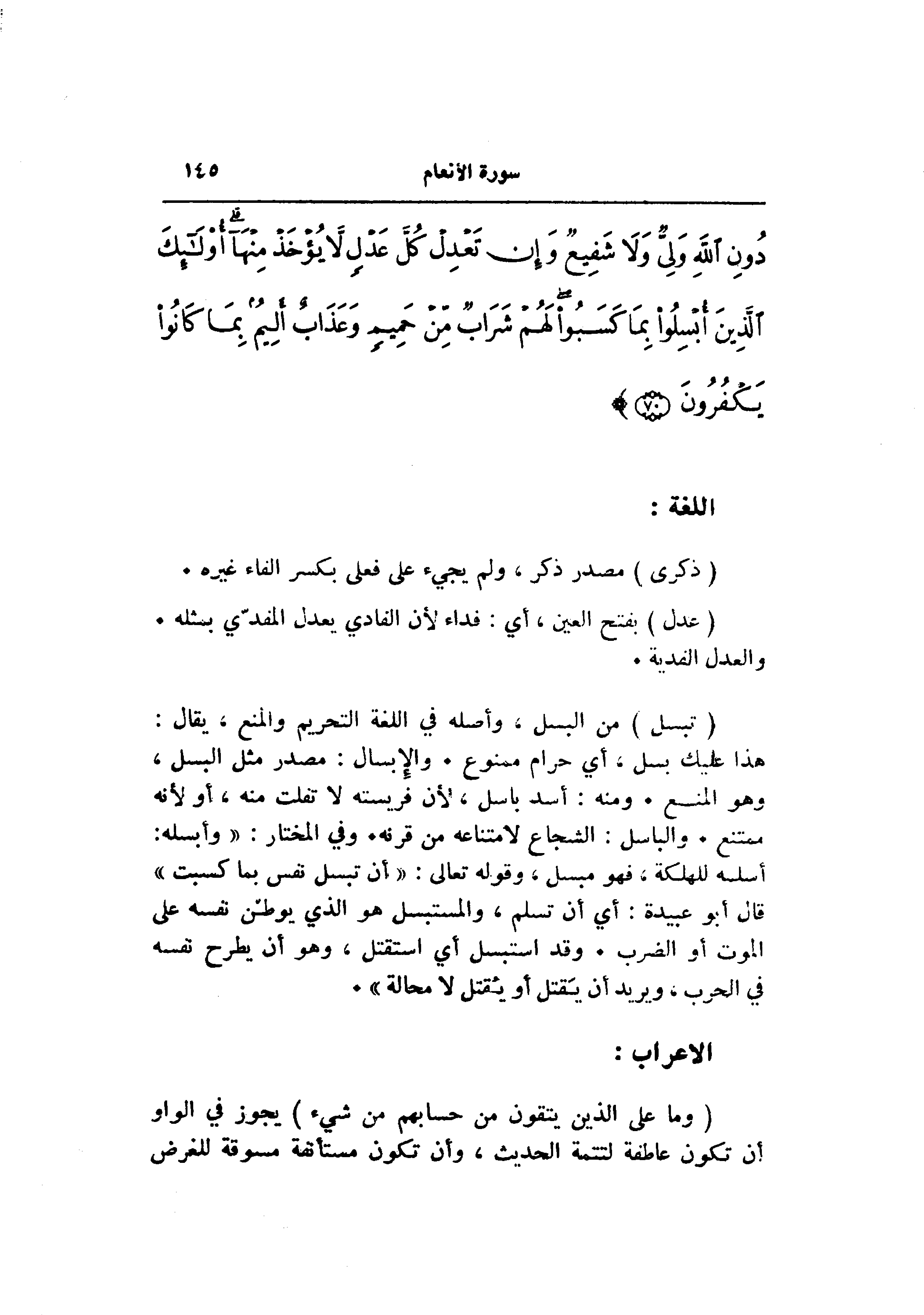 أسلسه للهلكة، فهو مبسل، وقوله تعالى: «أن تبسل نفس بما كسبت» قال أبو عبيدة: أي أن تسلم، والمستبسل هو الذي يوطّن نفسه على الموت أو الضرب. وقد استبسل أي استقتل، وهو أن يطرح نفسه في الحرب، ويريد أن يقتل أو يقتل لا محالة» .