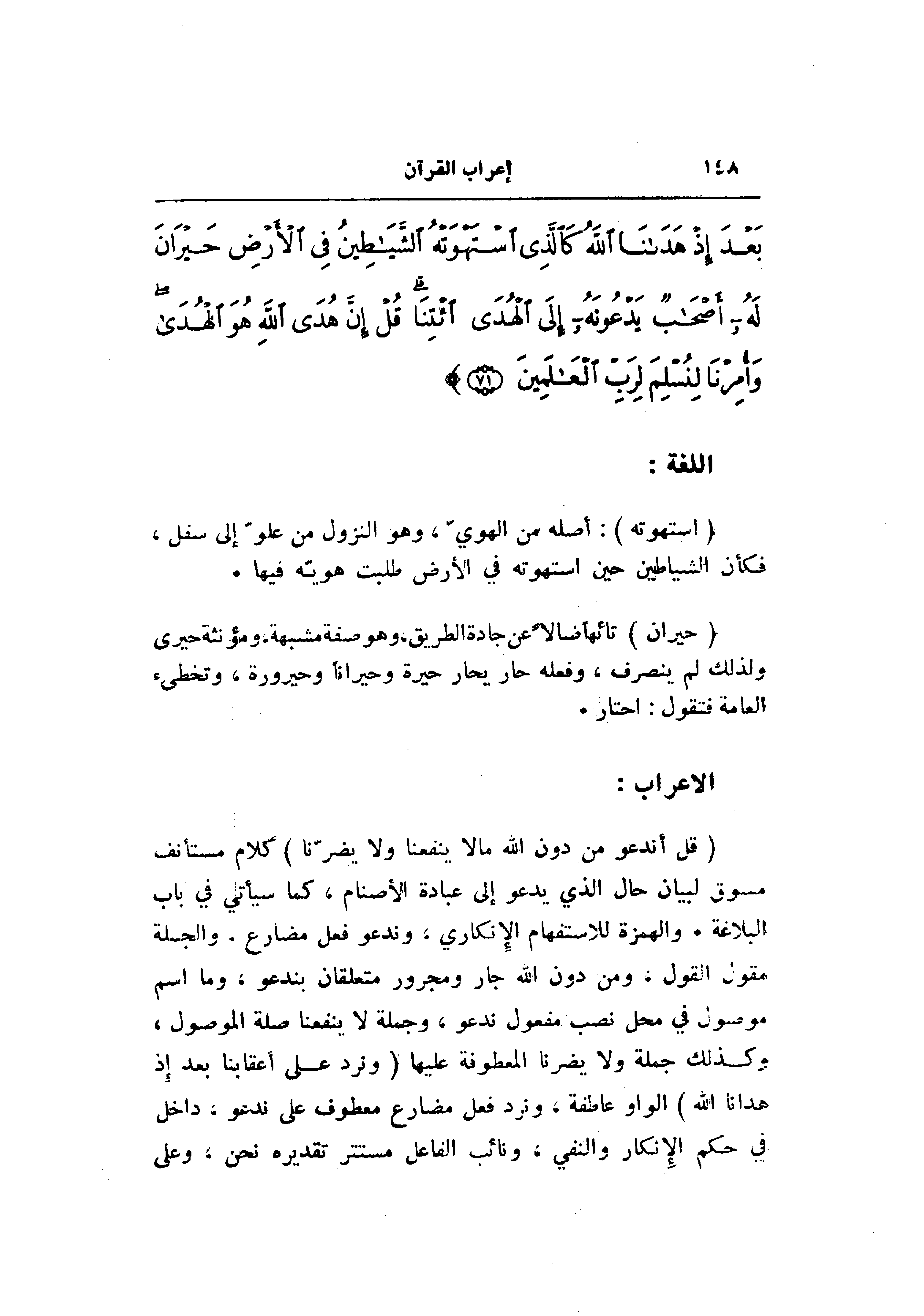 (قُلْ أَنَدْعُوا مِنْ دُونِ اللَّهِ ما لا يَنْفَعُنا وَلا يَضُرُّنا) كلام مستأنف مسوق لبيان حال الذي يدعو إلى عبادة الأصنام، كما سيأتي في باب البلاغة. والهمزة للاستفهام الإنكاري، وندعو فعل مضارع، والجملة مقول القول، ومن دون الله جار ومجرور متعلقان بندعو، وما اسم موصول في محل نصب مفعول ندعو، وجملة لا ينفعنا صلة الموصول، وكذلك جملة ولا يضرنا المعطوفة عليها (وَنُرَدُّ عَلى أَعْقابِنا بَعْدَ إِذْ هَدانَا اللَّهُ) الواو عاطفة، ونرد فعل مضارع معطوف على ندعو، داخل في حكم الإنكار والنفي، ونائب الفاعل مستتر تقديره نحن، وعلى
