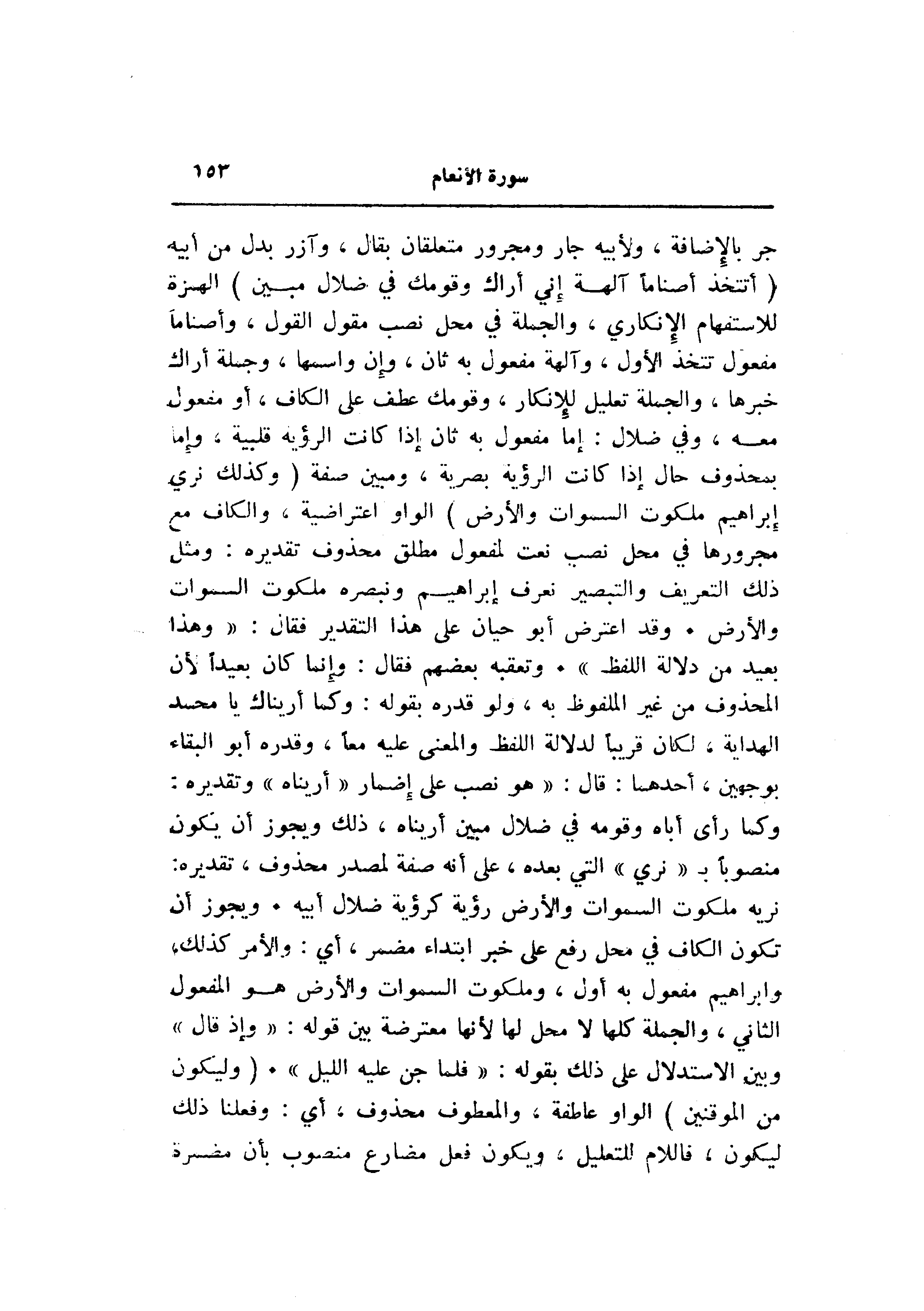 جر بالإضافة، ولأبيه جار ومجرور متعلقان بقال، وآزر بدل من أبيه (أَتَتَّخِذُ أَصْناماً آلِهَةً إِنِّي أَراكَ وَقَوْمَكَ فِي ضَلالٍ مُبِينٍ) الهمزة للاستفهام الإنكاري، والجملة في محل نصب مقول القول، وأصناما مفعول تتخذ الأول، وآلهة مفعول به ثان، وإن واسمها، وجملة أراك خبرها، والجملة تعليل للإنكار، وقومك عطف على الكاف، أو مفعول معه، وفي ضلال: إما مفعول به ثان إذا كانت الرؤية قلبية، وإما بمحذوف حال إذا كانت الرؤية بصرية، ومبين صفة (وَكَذلِكَ نُرِي إِبْراهِيمَ مَلَكُوتَ السَّماواتِ وَالْأَرْضِ) الواو اعتراضية، والكاف مع مجرورها في محل نصب نعت لمفعول مطلق محذوف تقديره: ومثل ذلك التعريف والتبصير نعرف إبراهيم ونبصره ملكوت السموات والأرض. وقد اعترض أبو حيان على هذا التقدير فقال: «وهذا بعيد من دلالة اللفظ» . وتعقبه بعضهم فقال: وإنما كان بعيدا لأن المحذوف من غير الملفوظ به، ولو قدره بقوله: وكما أريناك يا محمد الهداية، لكان قريبا لدلالة اللفظ والمعنى عليه معا، وقدره أبو البقاء بوجهين، أحدهما: قال: «هو نصب على إضمار «أريناه» وتقديره: