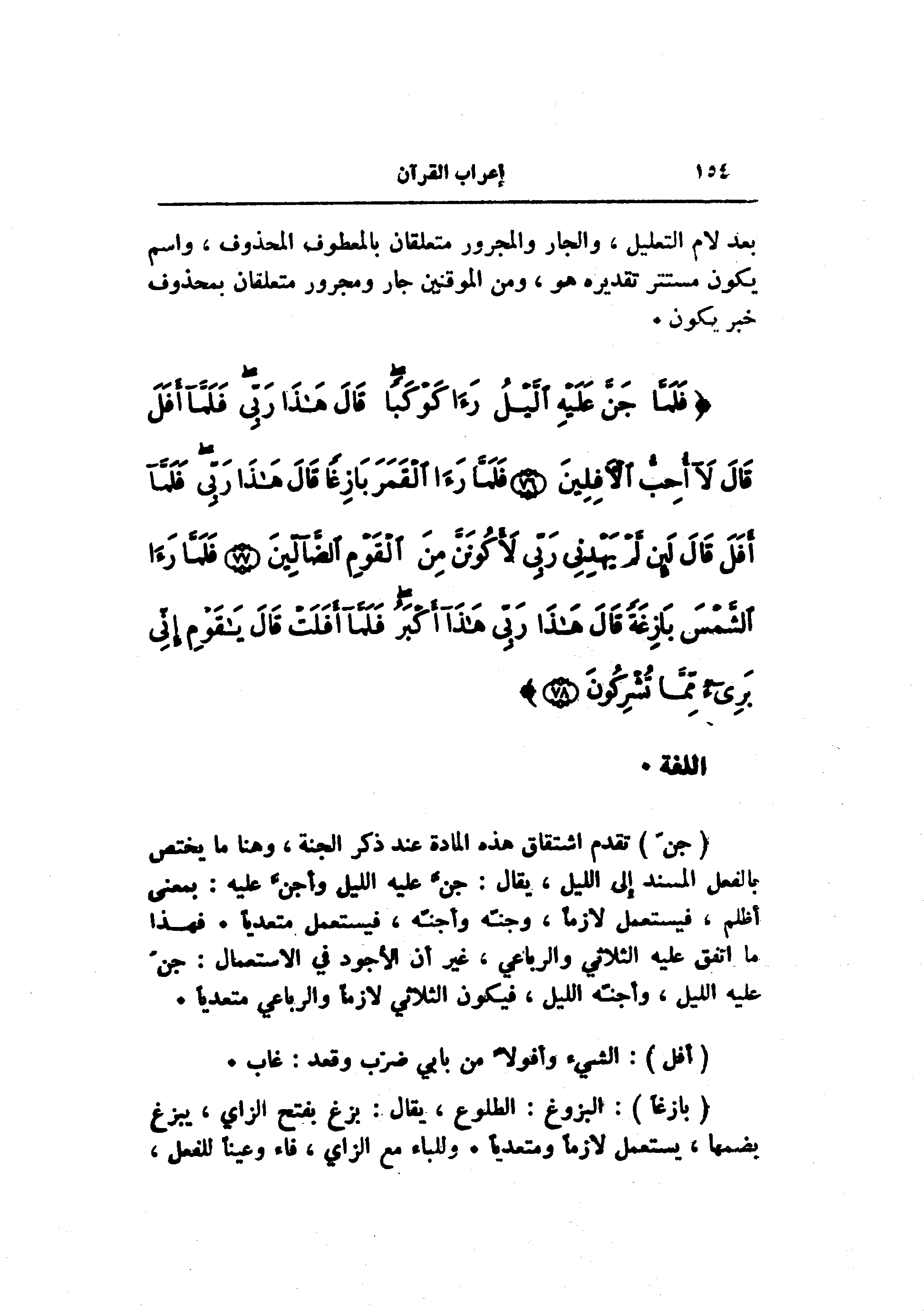فَلَمَّا جَنَّ عَلَيْهِ اللَّيْلُ رَأى كَوْكَباً قالَ هذا رَبِّي فَلَمَّا أَفَلَ قالَ لا أُحِبُّ الْآفِلِينَ (76) فَلَمَّا رَأَى الْقَمَرَ بازِغاً قالَ هذا رَبِّي فَلَمَّا أَفَلَ قالَ لَئِنْ لَمْ يَهْدِنِي رَبِّي لَأَكُونَنَّ مِنَ الْقَوْمِ الضَّالِّينَ (77) فَلَمَّا رَأَى الشَّمْسَ بازِغَةً قالَ هذا رَبِّي هذا أَكْبَرُ فَلَمَّا أَفَلَتْ قالَ يا قَوْمِ إِنِّي بَرِيءٌ مِمَّا تُشْرِكُونَ (78)