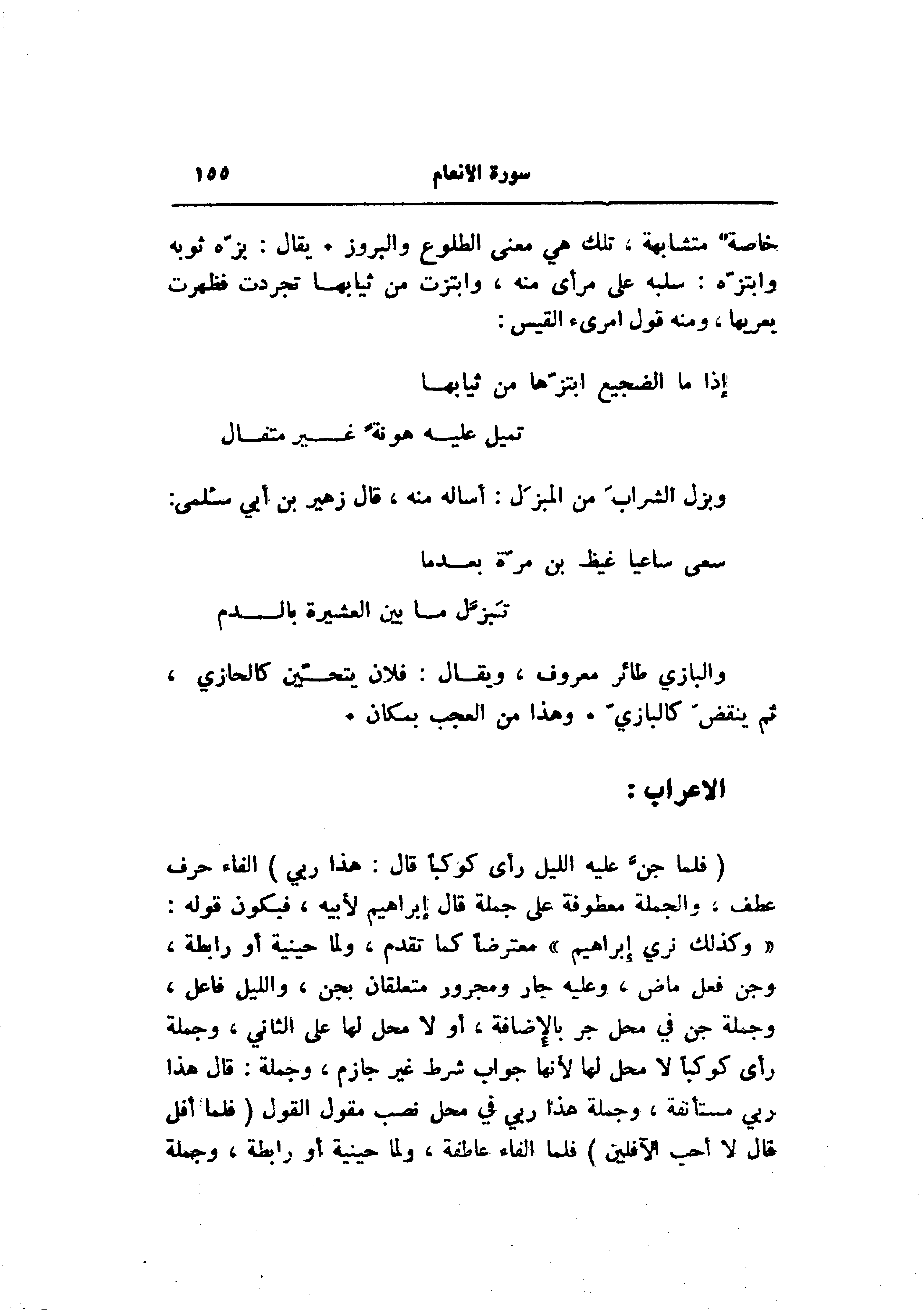 «وكذلك نري إبراهيم» معترضا كما تقدم، ولما حينية أو رابطة، وجن فعل ماض، وعليه جار ومجرور متعلقان بجن، والليل فاعل، وجملة جن في محل جر بالإضافة، أو لا محل لها على الثاني، وجملة رأى كوكبا لا محل لها لأنها جواب شرط غير جازم، وجملة: قال هذا ربي مستأنفة، وجملة هذا ربي في محل نصب مقول القول (فَلَمَّا أَفَلَ قالَ لا أُحِبُّ الْآفِلِينَ) فلما الفاء عاطفة، ولما حينية أو رابطة، وجملة