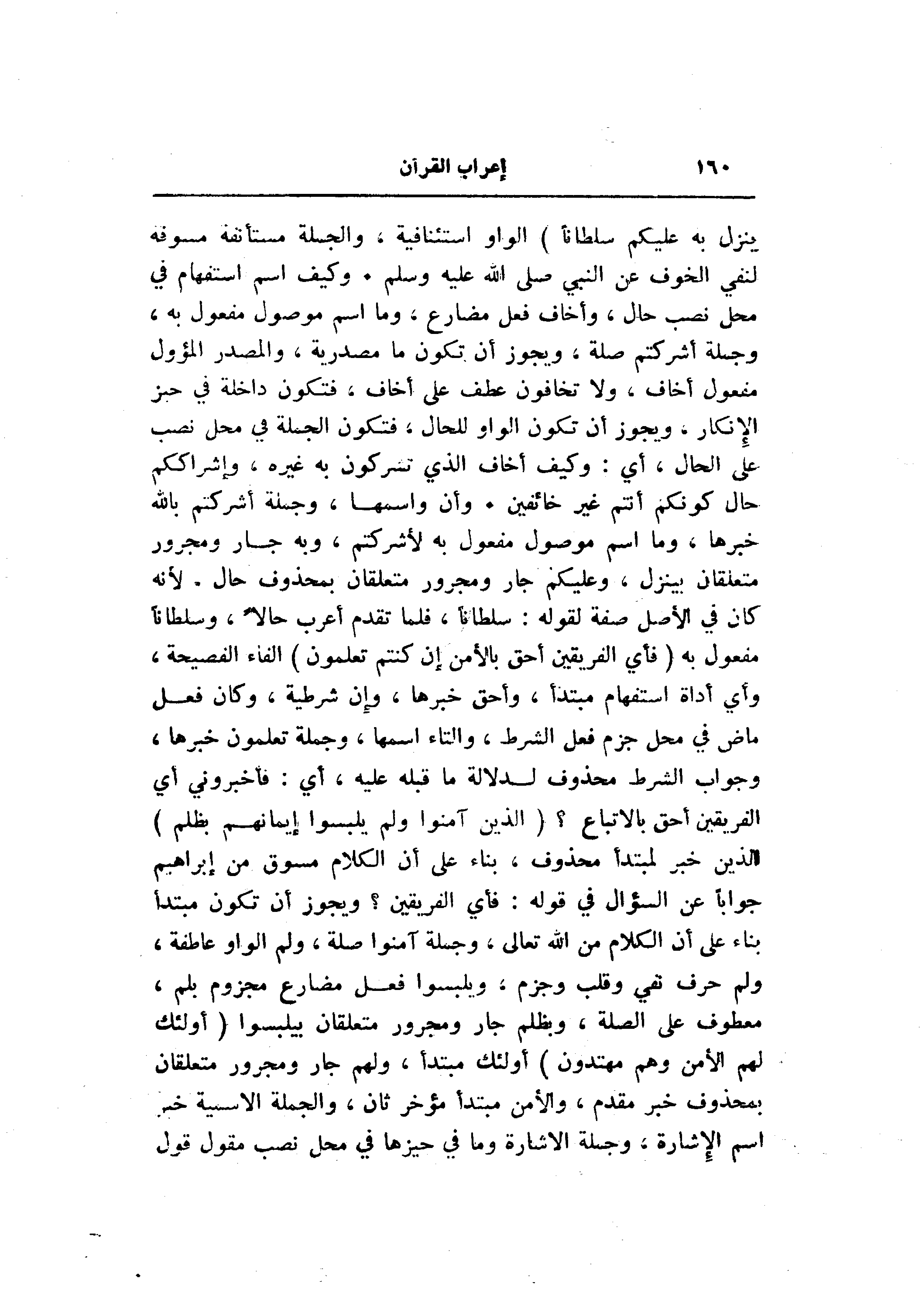 الواو استئنافية، والجملة مستأنفة مسوقة لنفي الخوف عن النبي صلى الله عليه وسلم. وكيف اسم استفهام في محل نصب حال، وأخاف فعل مضارع، وما اسم موصول مفعول به، وجملة أشركتم صلة، ويجوز أن تكون ما مصدرية، والمصدر المؤول مفعول أخاف، ولا تخافون عطف على أخاف، فتكون داخلة في حيز الإنكار، ويجوز أن تكون الواو للحال، فتكون الجملة في محل نصب على الحال، أي: وكيف أخاف الذي تشركون به غيره، وإشراككم حال كونكم أنتم غير خائفين. وأن واسمها، وجملة أشركتم بالله خبرها، وما اسم موصول مفعول به لأشركتم، وبه جار ومجرور متعلقان بينزل، وعليكم جار ومجرور متعلقان بمحذوف حال، لأنه كان في الأصل صفة لقوله: سلطانا، فلما تقدم أعرب حالا، وسلطانا مفعول به (فَأَيُّ الْفَرِيقَيْنِ أَحَقُّ بِالْأَمْنِ إِنْ كُنْتُمْ تَعْلَمُونَ) الفاء الفصيحة، وأي أداة استفهام مبتدأ، وأحق خبرها، وإن شرطية، وكان فعل ماض في محل جزم فعل الشرط، والتاء اسمها، وجملة تعلمون خبرها، وجواب الشرط محذوف لدلالة ما قبله عليه، أي: فأخبروني أي الفريقين أحق بالاتباع؟ (الَّذِينَ آمَنُوا وَلَمْ يَلْبِسُوا إِيمانَهُمْ بِظُلْمٍ) الذين خبر لمبتدأ محذوف، بناء على أن الكلام مسوق من إبراهيم جوابا عن السؤال في قوله: فأي الفريقين؟ ويجوز أن تكون مبتدأ بناء على أن الكلام من الله تعالى، وجملة آمنوا صلة، ولم الواو عاطفة، ولم حرف نفي وقلب وجزم، ويلبسوا فعل مضارع مجزوم بلم، معطوف على الصلة، وبظلم جار ومجرور متعلقان بيلبسوا (أُولئِكَ لَهُمُ الْأَمْنُ وَهُمْ مُهْتَدُونَ) أولئك مبتدأ، ولهم جار ومجرور متعلقان بمحذوف خبر مقدم، والأمن مبتدأ مؤخر ثان، والجملة الاسمية خبر اسم الإشارة، وجملة الاشارة وما في حيزها في محل نصب مقول قول