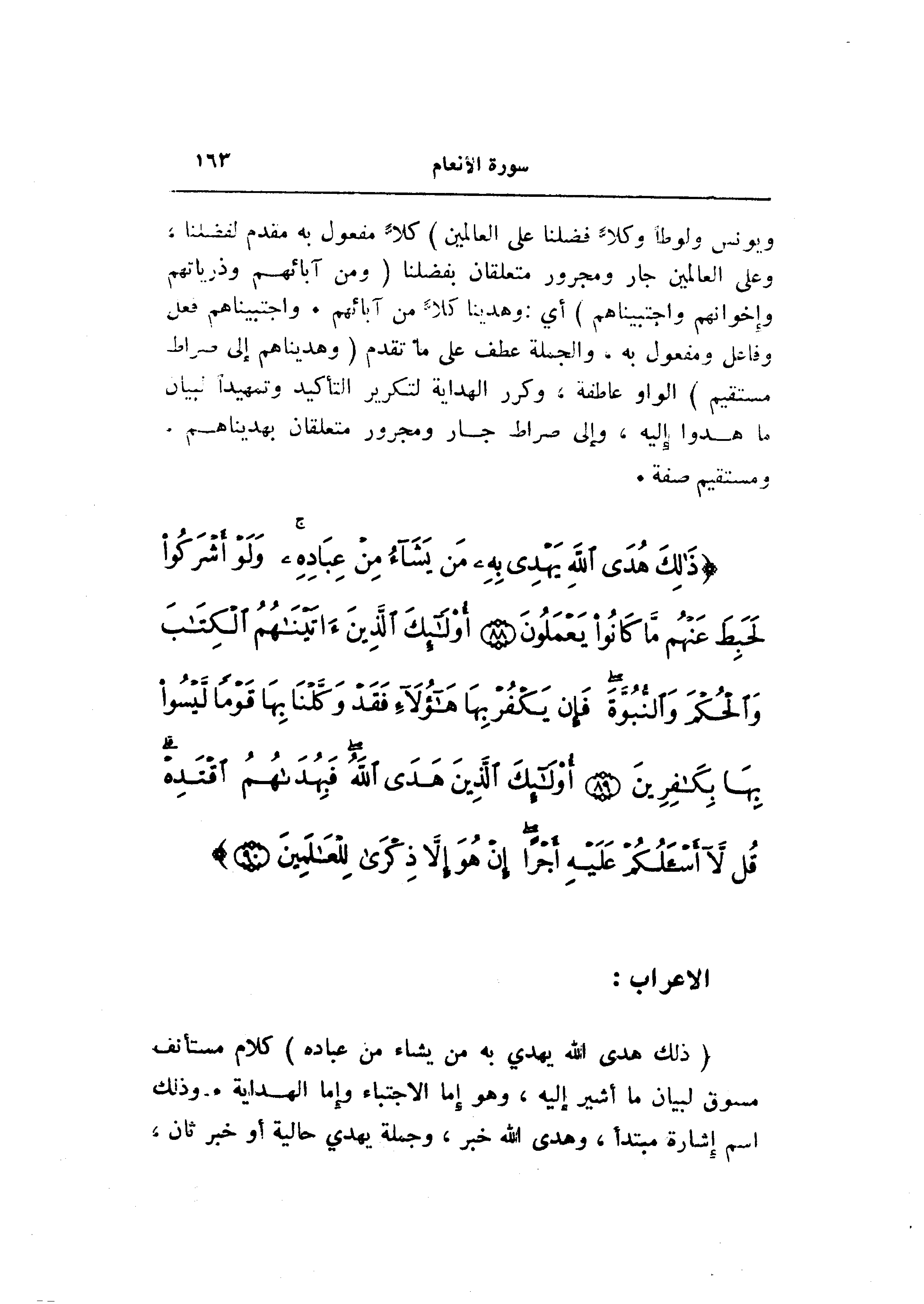 كلّا مفعول به مقدم لفضلنا، وعلى العالمين جار ومجرور متعلقان بفضلنا (وَمِنْ آبائِهِمْ وَذُرِّيَّاتِهِمْ وَإِخْوانِهِمْ وَاجْتَبَيْناهُمْ) أي: وهدينا كلّا من آبائهم. واجتبيناهم فعل وفاعل ومفعول به، والجملة عطف على ما تقدم (وَهَدَيْناهُمْ إِلى صِراطٍ مُسْتَقِيمٍ) الواو عاطفة، وكرر الهداية لتكرير التأكيد وتمهيدا لبيان ما هدوا إليه، وإلى صراط جار ومجرور متعلقان بهديناهم، ومستقيم صفة.