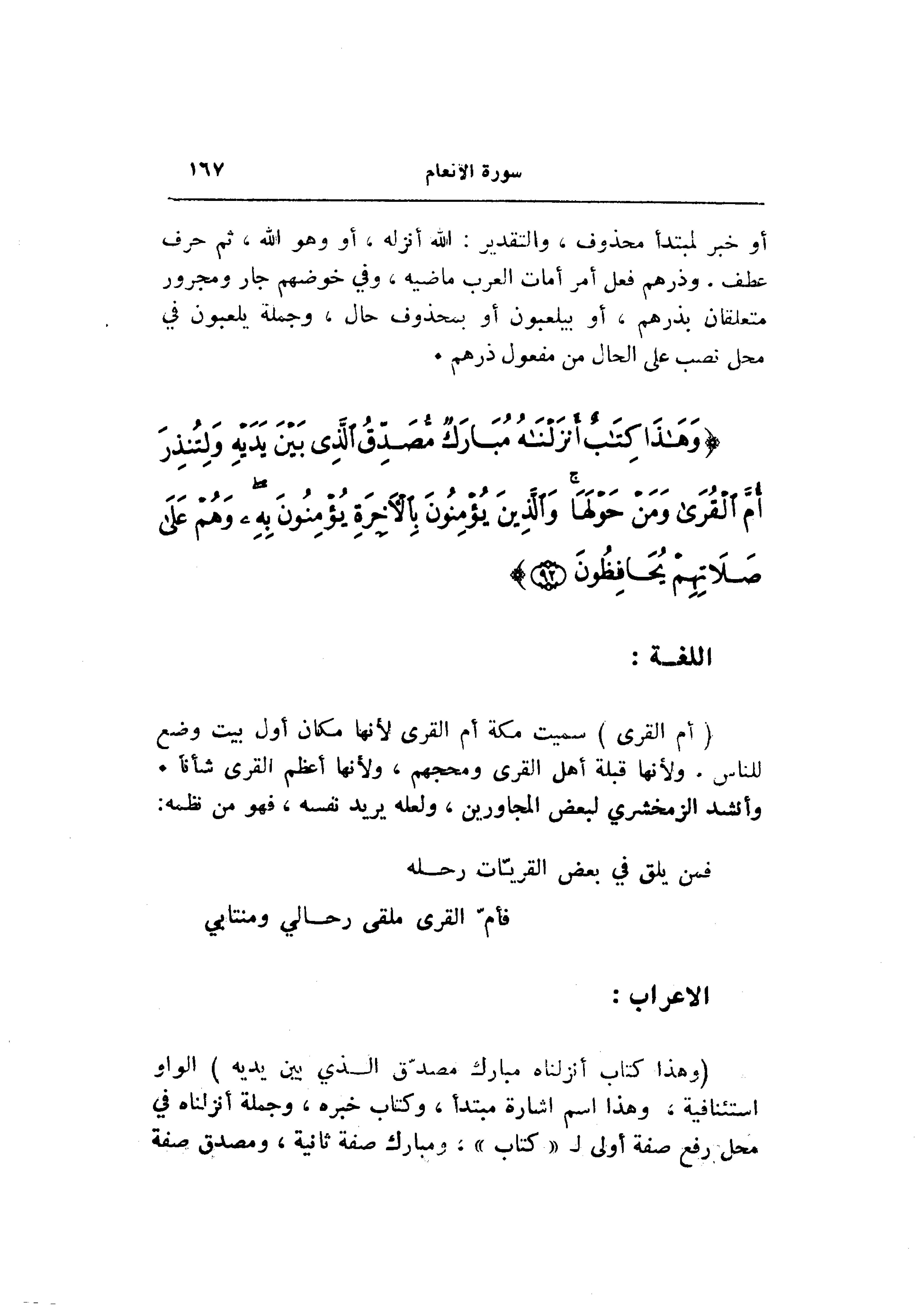 (وَهذا كِتابٌ أَنْزَلْناهُ مُبارَكٌ مُصَدِّقُ الَّذِي بَيْنَ يَدَيْهِ) الواو استئنافية، وهذا اسم اشارة مبتدأ، وكتاب خبره، وجملة أنزلناه في محل رفع صفة أولى ل «كتاب» ، ومبارك صفة ثانية، ومصدق صفة