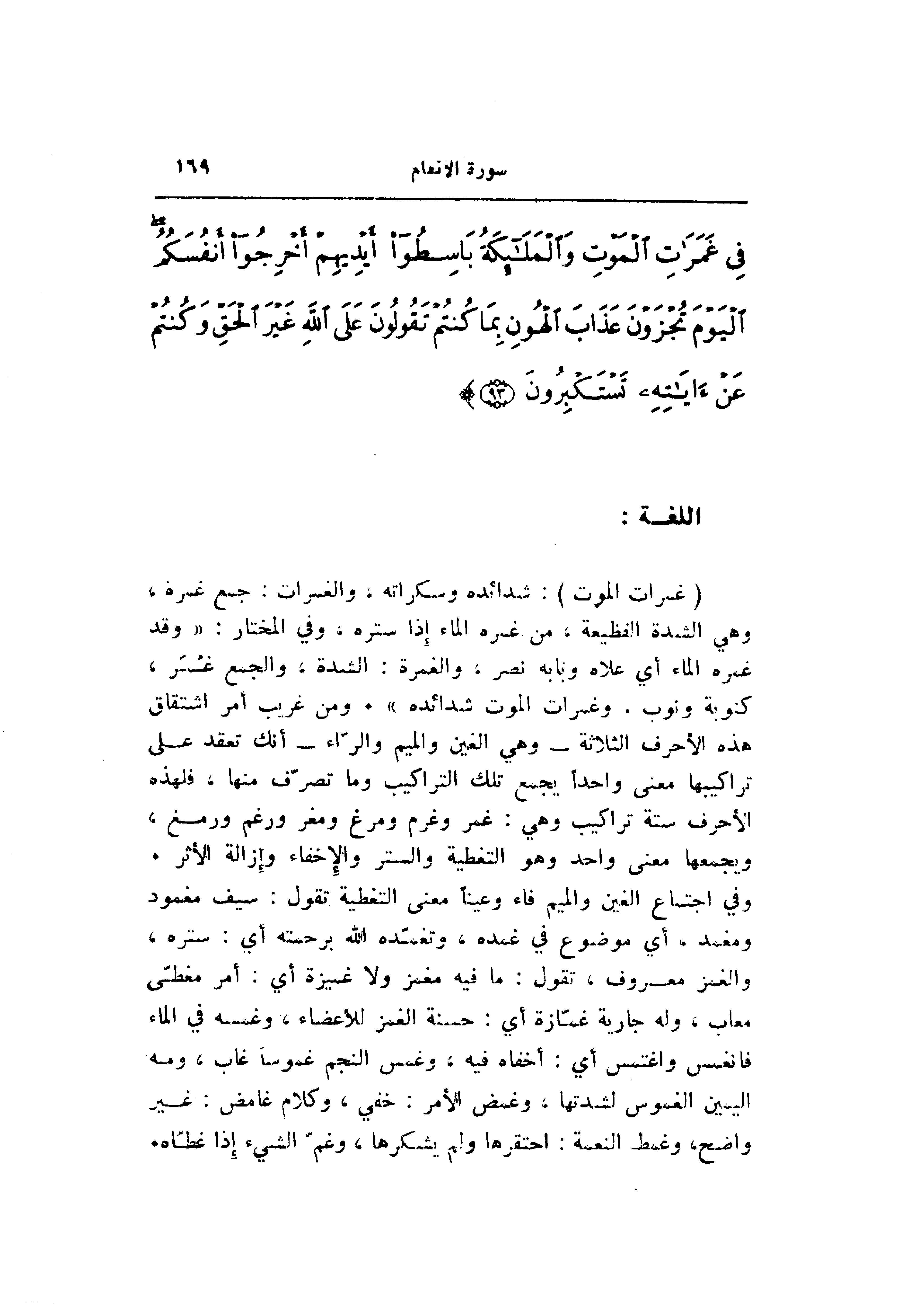 (غَمَراتِ الْمَوْتِ) : شدائده وسكراته، والغمرات: جمع غمرة، وهي الشدة الفظيعة، من غمره الماء إذا ستره، وفي المختار: «وقد غمره الماء أي علاه وبابه نصر، والغمرة: الشدة، والجمع غمر، كنوبة ونوب، وغمرات الموت شدائده» . ومن غريب أمر اشتقاق هذه الأحرف الثلاثة- وهي الغين والميم والرّاء- أنك تعقد على تراكيبها معنى واحدا يجمع تلك التراكيب وما تصرّف منها، فلهذه الأحرف ستة تراكيب وهي: غمر وغرم ومرغ ومغر ورغم ورمغ، ويجمعها معنى واحد وهو التغطية والستر والإخفاء وإزالة الأثر.