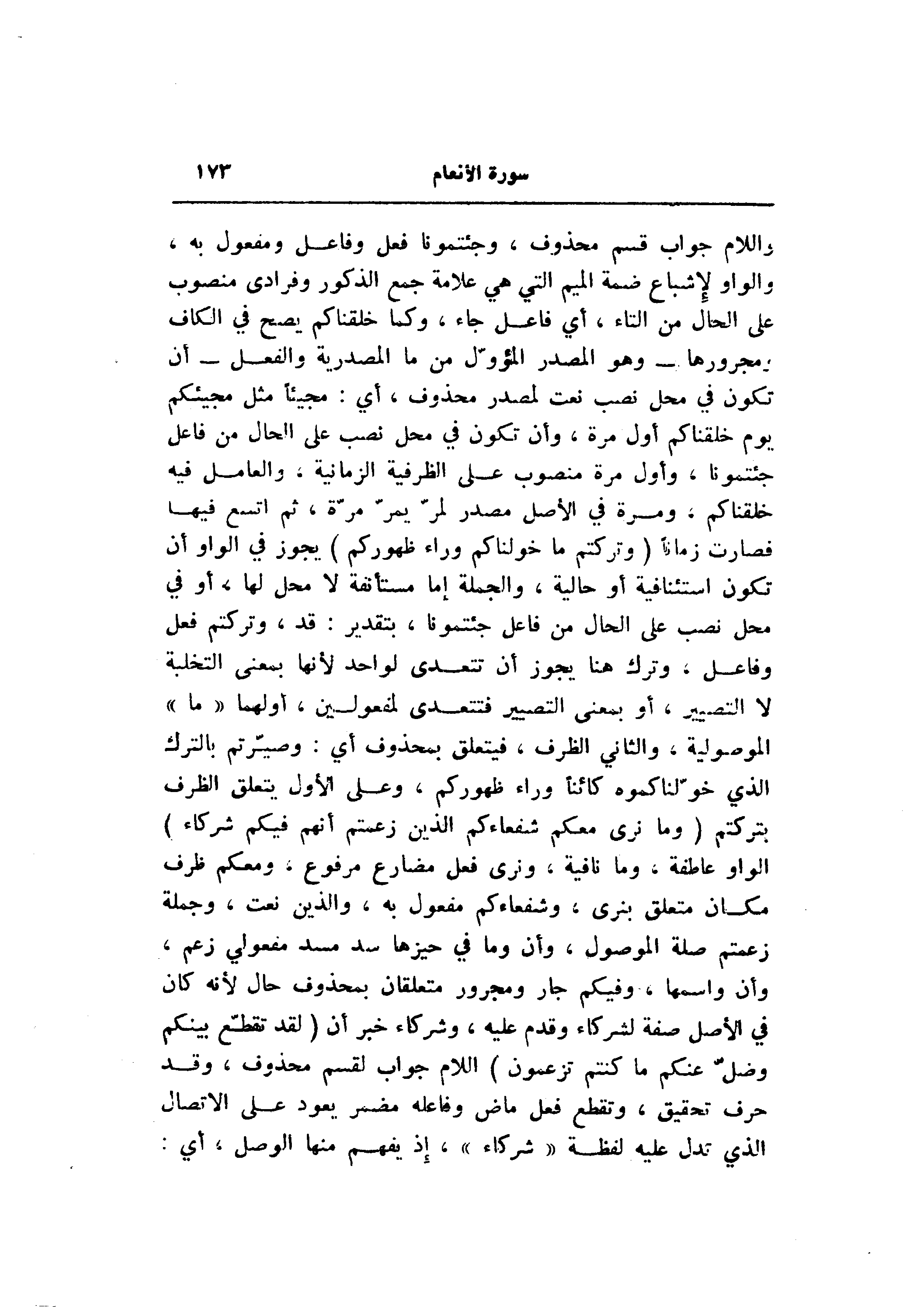 واللام جواب قسم محذوف، وجئتمونا فعل وفاعل ومفعول به، والواو لإشباع ضمة الميم التي هي علامة جمع الذكور وفرادى منصوب على الحال من التاء، أي فاعل جاء، وكما خلقناكم يصح في الكاف ومجرورها- وهو المصدر المؤوّل من ما المصدرية والفعل- أن تكون في محل نصب نعت لمصدر محذوف، أي: مجيئا مثل مجيئكم يوم خلقناكم أول مرة، وأن تكون في محل نصب على الحال من فاعل جئتمونا، وأول مرة منصوب على الظرفية الزمانية، والعامل فيه خلقناكم، ومرة في الأصل مصدر لمرّ يمرّ مرّة، ثم اتسع فيها فصارت زمانا (وَتَرَكْتُمْ ما خَوَّلْناكُمْ وَراءَ ظُهُورِكُمْ) يجوز في الواو أن تكون استئنافية أو حالية، والجملة إما مستأنفة لا محل لها، أو في محل نصب على الحال من فاعل جئتمونا، بتقدير: قد، وتركتم فعل وفاعل، وترك هنا يجوز أن تتعدى لواحد لأنها بمعنى التخلية لا التصيير، أو بمعنى التصيير فتتعدى لمفعولين، أولهما «ما» الموصولية، والثاني الظرف، فيتعلق بمحذوف أي: وصيّرتم بالترك الذي خوّلناكموه كائنا وراء ظهوركم، وعلى الأول يتعلق الظرف بتركتم (وَما نَرى مَعَكُمْ شُفَعاءَكُمُ الَّذِينَ زَعَمْتُمْ أَنَّهُمْ فِيكُمْ شُرَكاءُ) الواو عاطفة، وما نافية، ونرى فعل مضارع مرفوع، ومعكم ظرف مكان متعلق بنرى، وشفعاءكم مفعول به، والذين نعت، وجملة زعمتم صلة الموصول، وأن وما في حيزها سد مسد مفعولي زعم، وأن واسمها، وفيكم جار ومجرور متعلقان بمحذوف حال لأنه كان في الأصل صفة لشركاء وقدم عليه، وشركاء خبر أن (لَقَدْ تَقَطَّعَ بَيْنَكُمْ وَضَلَّ عَنْكُمْ ما كُنْتُمْ تَزْعُمُونَ) اللام جواب لقسم محذوف، وقد حرف تحقيق، وتقطع فعل ماض وفاعله مضمر يعود على الاتصال الذي تدل عليه لفظة «شركاء» ، إذ يفهم منها الوصل، أي: