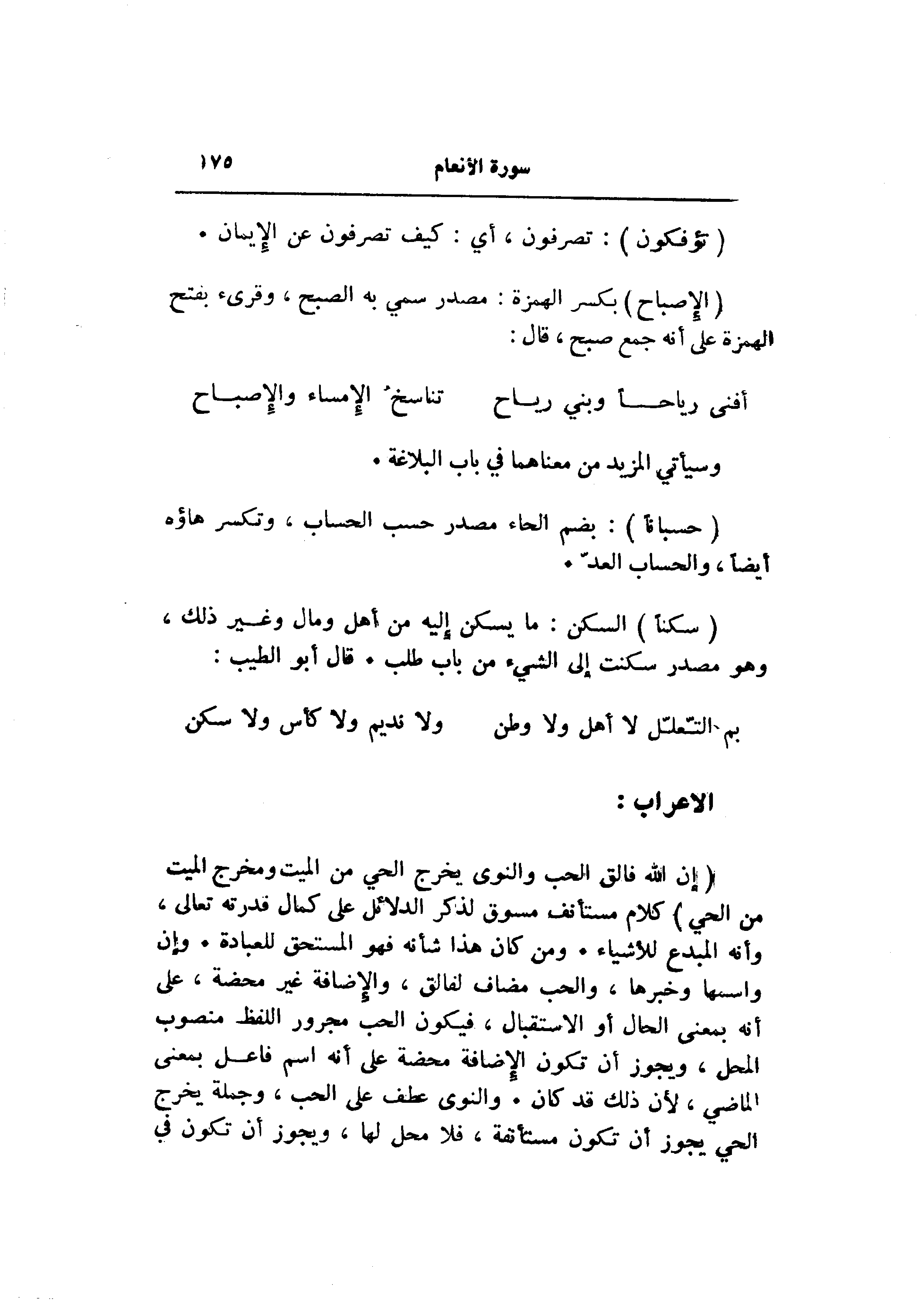 (إِنَّ اللَّهَ فالِقُ الْحَبِّ وَالنَّوى يُخْرِجُ الْحَيَّ مِنَ الْمَيِّتِ وَمُخْرِجُ الْمَيِّتِ مِنَ الْحَيِّ) كلام مستأنف مسوق لذكر الدلائل على كمال قدرته تعالى، وأنه المبدع للأشياء. ومن كان هذا شأنه فهو المستحق للعبادة. وإن واسمها وخبرها، والحب مضاف لفالق، والإضافة غير محضة، على أنه بمعنى الحال أو الاستقبال، فيكون الحب مجرور اللفظ منصوب المحل، ويجوز أن تكون الإضافة محضة على أنه اسم فاعل بمعنى الماضي، لأن ذلك قد كان. والنوى عطف على الحب، وجملة يخرج الحي يجوز أن تكون مستأنفة، فلا محل لها، ويجوز أن تكون في