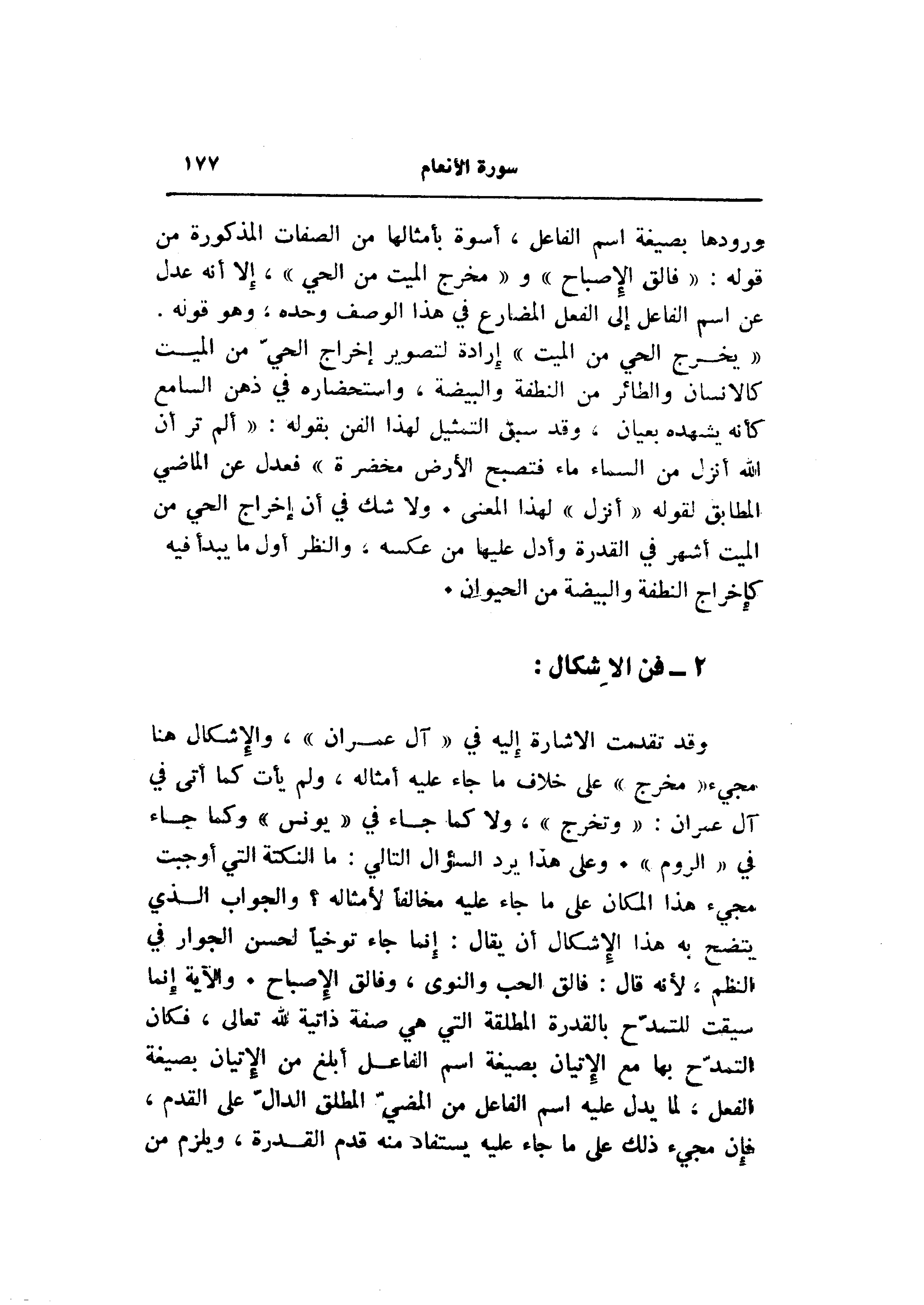 وقد تقدمت الاشارة إليه في «آل عمران» ، والإشكال هنا مجيء «مخرج» على خلاف ما جاء عليه أمثاله، ولم يأت كما أتى في آل عمران: «وتخرج» ، ولا كما جاء في «يونس» وكما جاء في «الروم» . وعلى هذا يرد السؤال التالي: ما النكتة التي أوجبت مجيء هذا المكان على ما جاء عليه مخالفا لأمثاله؟ والجواب الذي يتضح به هذا الإشكال أن يقال: إنما جاء توخيا لحسن الجوار في النظم، لأنه قال: فالق الحب والنوى، وفالق الإصباح. والآية إنما سيقت للتمدّح بالقدرة المطلقة التي هي صفة ذاتية لله تعالى، فكان التمدّح بها مع الإتيان بصيغة اسم الفاعل أبلغ من الإتيان بصيغة الفعل، لما يدل عليه اسم الفاعل من المضيّ المطلق الدالّ على القدم، فإن مجيء ذلك على ما جاء عليه يستفاد منه قدم القدرة، ويلزم من