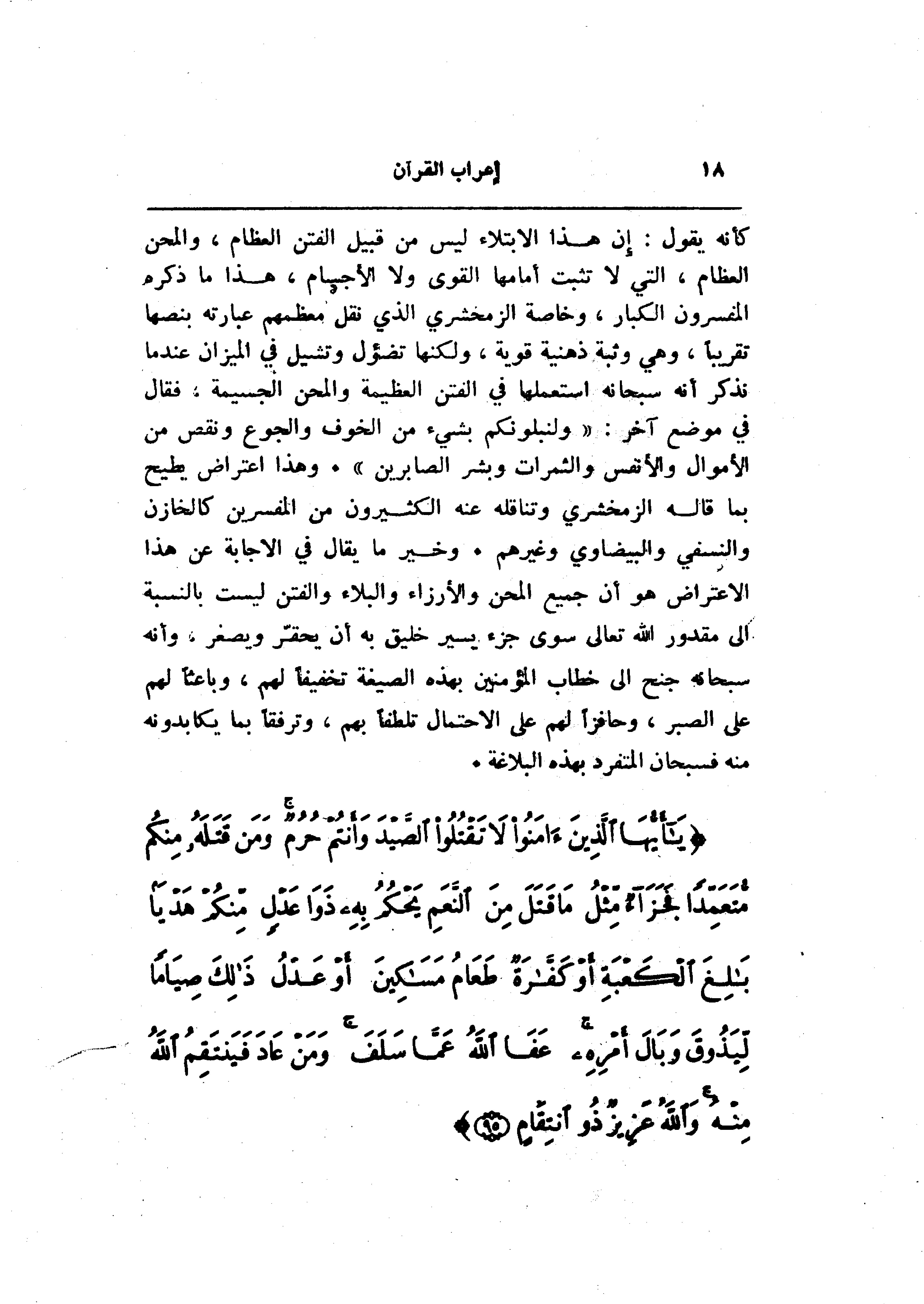 كأنه يقول: إن هذا الابتلاء ليس من قبيل الفتن العظام، والمحن العظام، التي لا تثبت أمامها القوى ولا الأجسام، هذا ما ذكره المفسرون الكبار، وخاصة الزمخشري الذي نقل معظمهم عبارته بنصها تقريبا، وهي وثبة ذهنية قوية، ولكنها تضؤل وتشيل في الميزان عند ما نذكر أنه سبحانه استعملها في الفتن العظيمة والمحن الجسيمة، فقال في موضع آخر: «ولنبلونكم بشيء من الخوف والجوع ونقص من الأموال والأنفس والثمرات وبشر الصابرين» . وهذا اعتراض يطيح بما قاله الزمخشري وتناقله عنه الكثيرون من المفسرين كالخازن والنسفي والبيضاوي وغيرهم. وخير ما يقال في الاجابة عن هذا الاعتراض هو أن جميع المحن والأرزاء والبلاء والفتن ليست بالنسبة الى مقدور الله تعالى سوى جزء يسير خليق به أن يحقّر ويصغر، وأنه سبحانه جنح الى خطاب المؤمنين بهذه الصيغة تخفيفا لهم، وباعثا لهم على الصبر، وحافزا لهم على الاحتمال تلطفا بهم، وترفقا بما يكابدونه منه فسبحان المتفرد بهذه البلاغة.