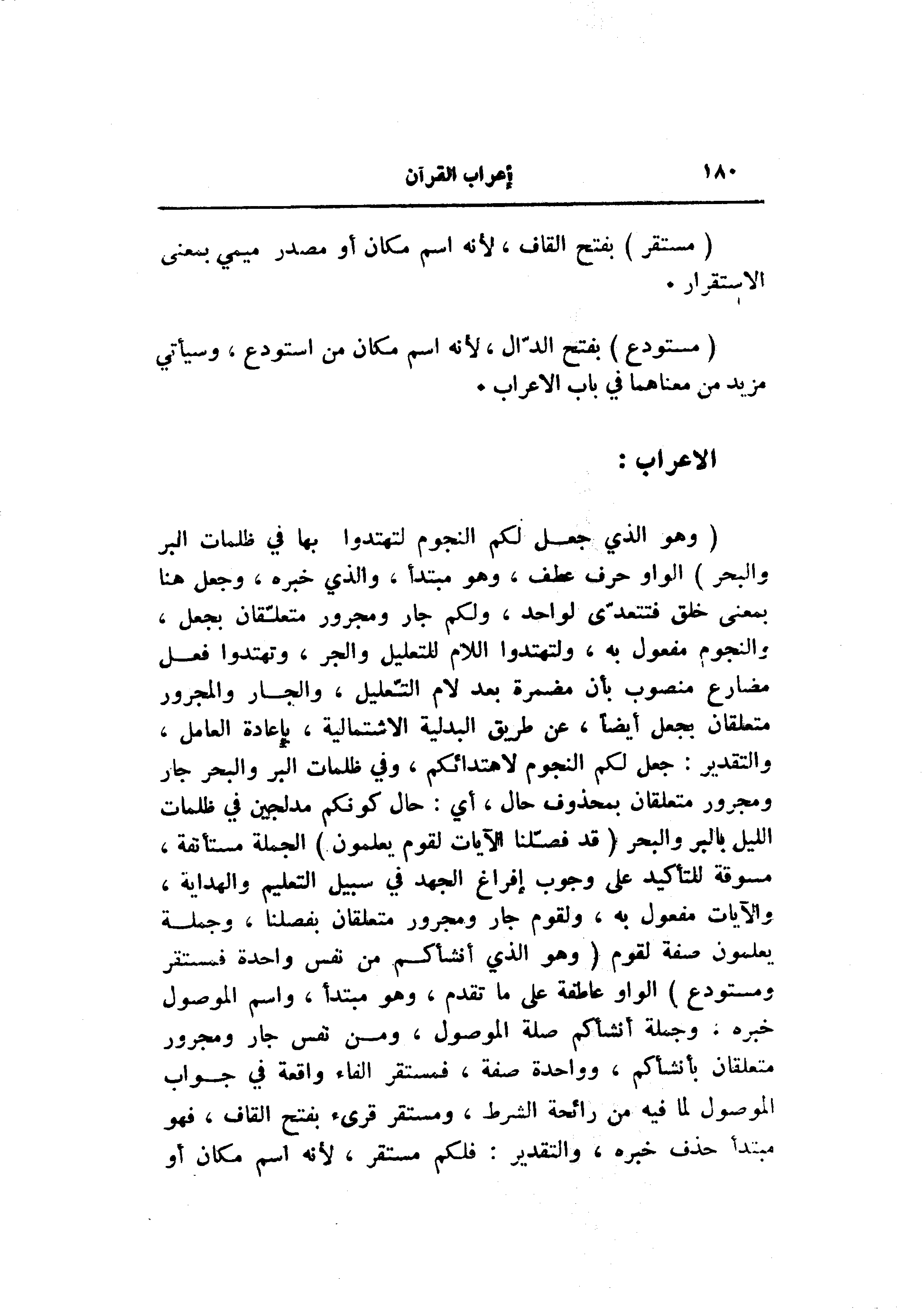 (وَهُوَ الَّذِي جَعَلَ لَكُمُ النُّجُومَ لِتَهْتَدُوا بِها فِي ظُلُماتِ الْبَرِّ وَالْبَحْرِ) الواو حرف عطف، وهو مبتدأ، والذي خبره، وجعل هنا بمعنى خلق فتتعدّى لواحد، ولكم جار ومجرور متعلّقان بجعل، والنجوم مفعول به، ولتهتدوا اللام للتعليل والجر، وتهتدوا فعل مضارع منصوب بأن مضمرة بعد لام التّعليل، والجار والمجرور متعلقان بجعل أيضا، عن طريق البدلية الاشتمالية، بإعادة العامل، والتقدير: جعل لكم النجوم لاهتدائكم، وفي ظلمات البر والبحر جار ومجرور متعلقان بمحذوف حال، أي: حال كونكم مدلجين في ظلمات الليل بالبر والبحر (قَدْ فَصَّلْنَا الْآياتِ لِقَوْمٍ يَعْلَمُونَ) الجملة مستأنفة، مسوقة للتأكيد على وجوب إفراغ الجهد في سبيل التعليم والهداية، والآيات مفعول به، ولقوم جار ومجرور متعلقان بفصلنا، وجملة يعلمون صفة لقوم (وَهُوَ الَّذِي أَنْشَأَكُمْ مِنْ نَفْسٍ واحِدَةٍ فَمُسْتَقَرٌّ وَمُسْتَوْدَعٌ) الواو عاطفة على ما تقدم، وهو مبتدأ، واسم الموصول خبره، وجملة أنشأكم صلة الموصول، ومن نفس جار ومجرور متعلقان بأنشأكم، وواحدة صفة، فمستقر الفاء واقعة في جواب الموصول لما فيه من رائحة الشرط، ومستقر قرئ بفتح القاف، فهو مبتدأ حذف خبره، والتقدير: فلكم مستقر، لأنه اسم مكان أو