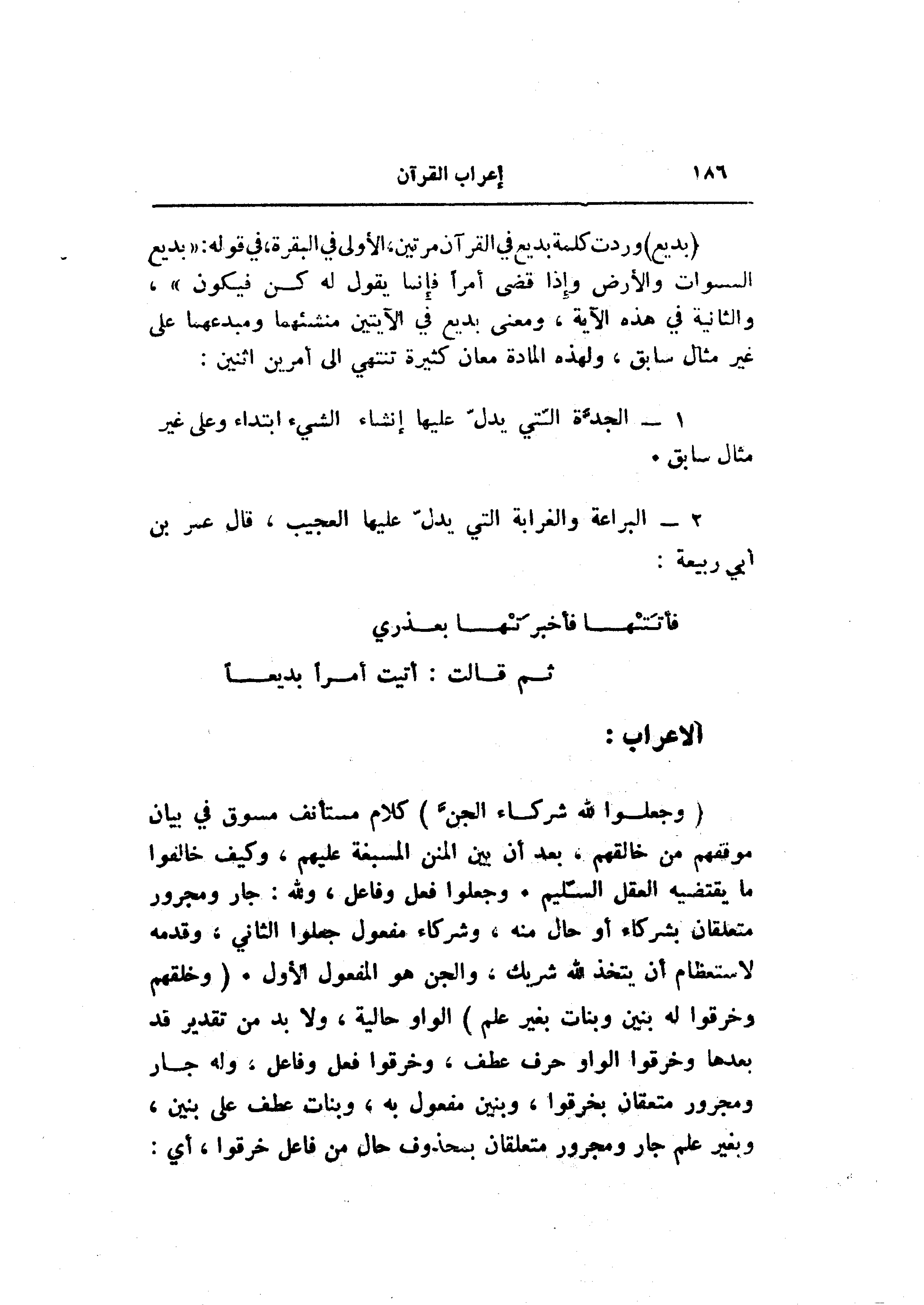 1- الجدّة الّتي يدلّ عليها إنشاء الشيء ابتداء وعلى غير مثال سابق.