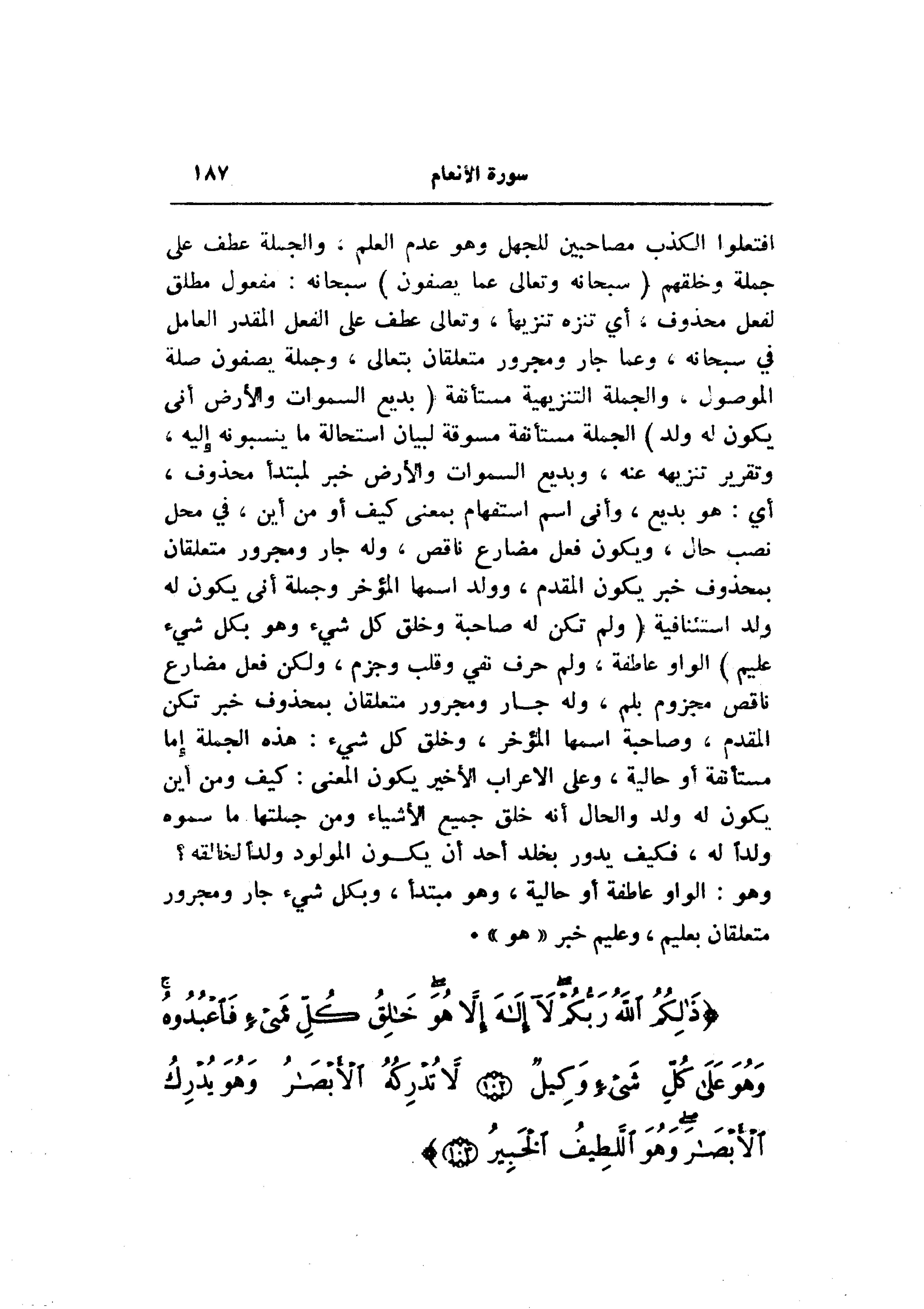 افتعلوا الكذب مصاحبين للجهل وهو عدم العلم، والجملة عطف على جملة وخلقهم (سُبْحانَهُ وَتَعالى عَمَّا يَصِفُونَ) سبحانه: مفعول مطلق لفعل محذوف، أي تنزه تنزيها، وتعالى عطف على الفعل المقدر العامل في سبحانه، وعما جار ومجرور متعلقان بتعالى، وجملة يصفون صلة الموصول، والجملة التنزيهية مستأنفة (بَدِيعُ السَّماواتِ وَالْأَرْضِ أَنَّى يَكُونُ لَهُ وَلَدٌ) الجملة مستأنفة مسوقة لبيان استحالة ما ينسونه إليه، وتقرير تنزيهه عنه، وبديع السموات والأرض خبر لمبتدأ محذوف، أي: هو بديع، وأنى اسم استفهام بمعنى كيف أو من أين، في محل نصب حال، ويكون فعل مضارع ناقص، وله جار ومجرور متعلقان بمحذوف خبر يكون المقدم، وولد اسمها المؤخر وجملة أنى يكون له ولد استئنافية (وَلَمْ تَكُنْ لَهُ صاحِبَةٌ وَخَلَقَ كُلَّ شَيْءٍ وَهُوَ بِكُلِّ شَيْءٍ عَلِيمٌ) الواو عاطفة، ولم حرف نفي وقلب وجزم، ولكن فعل مضارع ناقص مجزوم بلم، وله جار ومجرور متعلقان بمحذوف خبر تكن المقدم، وصاحبة اسمها المؤخر، وخلق كل شيء: هذه الجملة إما مستأنفة أو حالية، وعلى الإعراب الأخير يكون المعنى: كيف ومن أين يكون له ولد والحال أنه خلق جميع الأشياء ومن جملتها ما سموه ولدا له، فكيف يدور بخلد أحد أن يكون المولود ولدا لخالقه؟