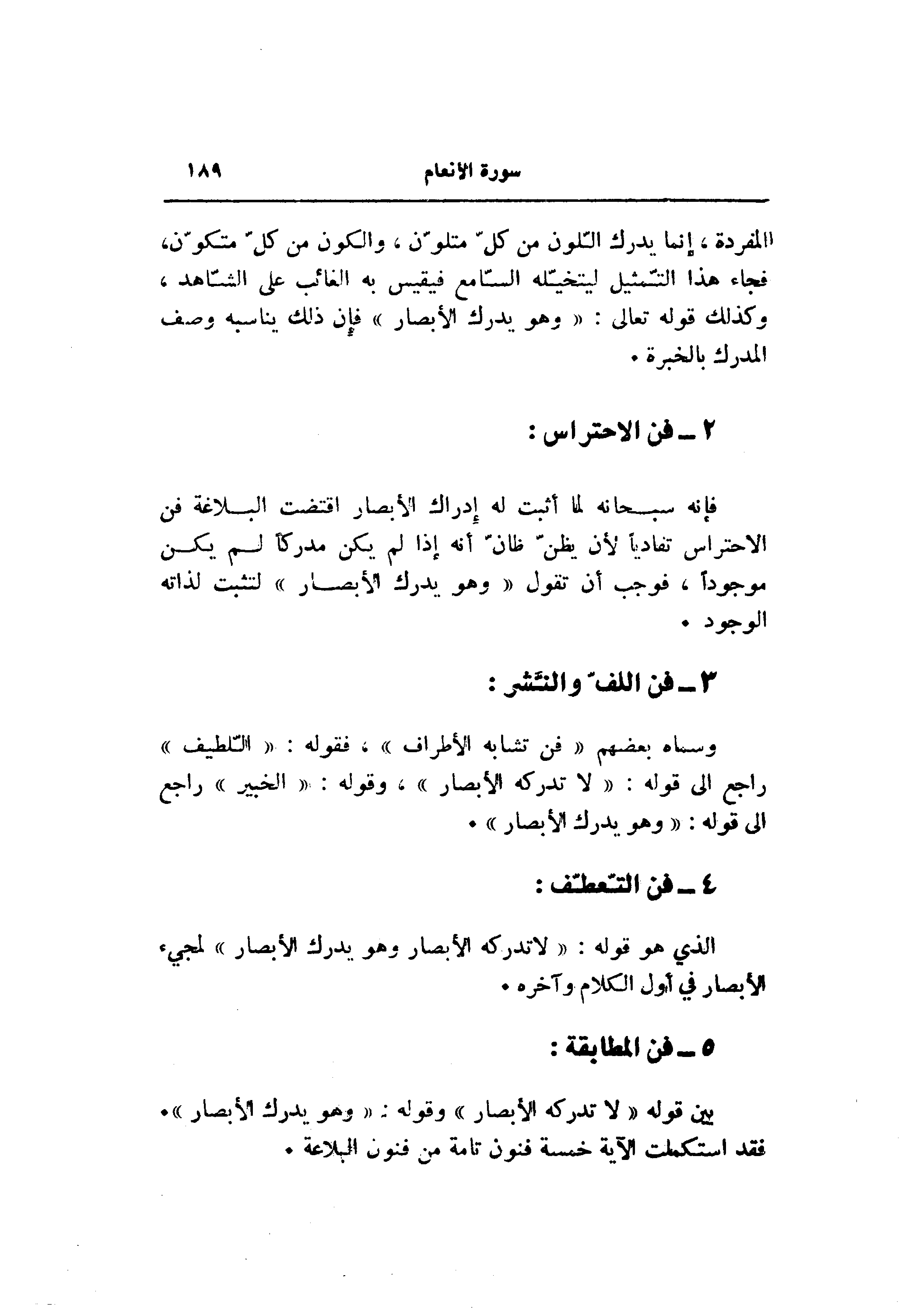 فإنه سبحانه لما أثبت له إدراك الأبصار اقتضت البلاغة فن الاحتراس تفاديا لأن يظنّ ظانّ أنه إذا لم يكن مدركا لم يكن موجودا، فوجب أن تقول «وهو يدرك الأبصار» لتثبت لذاته الوجود.
