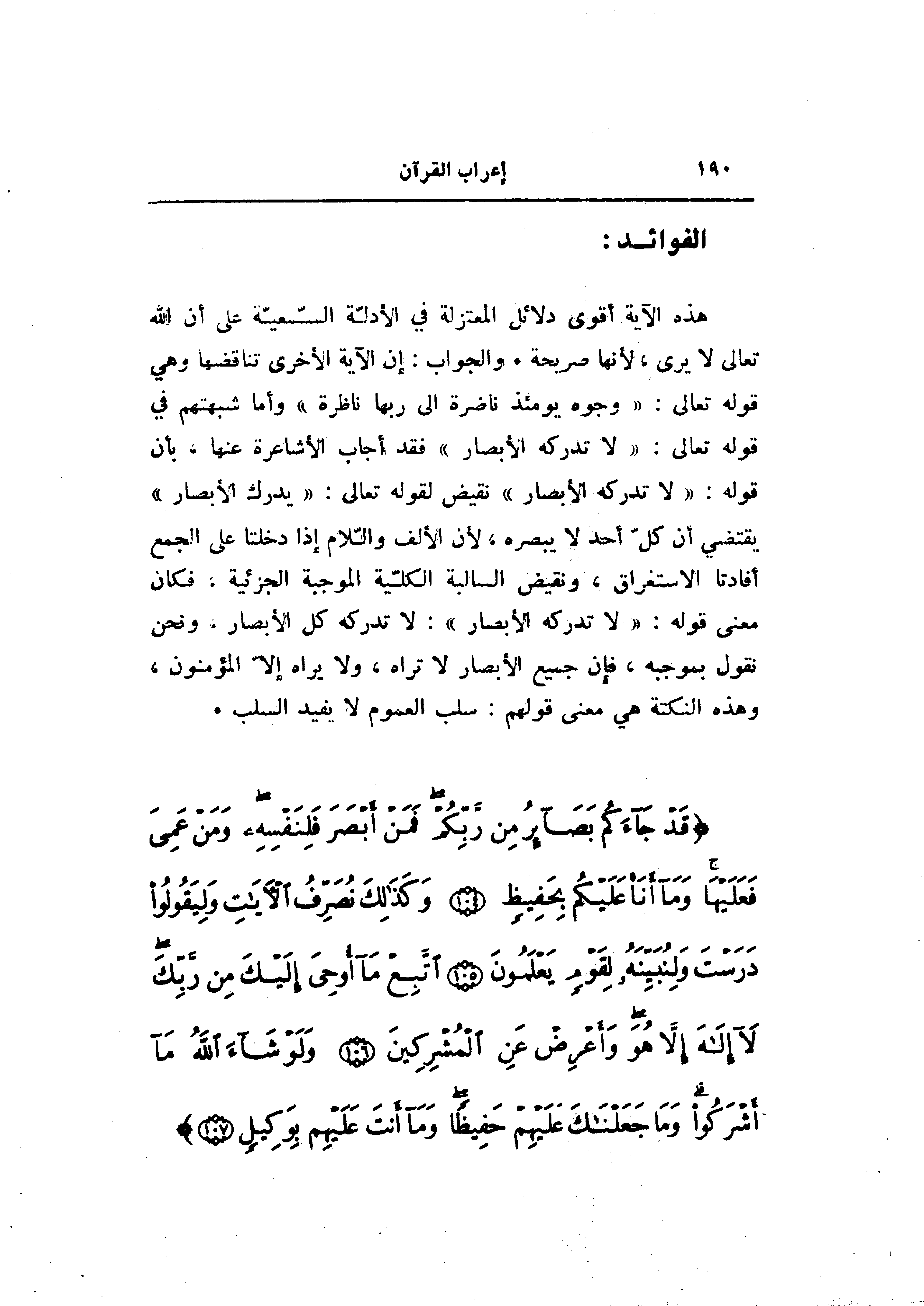 هذه الآية أقوى دلائل المعتزلة في الأدلّة السّمعيّة على أن الله تعالى لا يرى، لأنها صريحة. والجواب: إن الآية الأخرى تناقضها وهي قوله تعالى: «وجوه يومئذ ناضرة الى ربها ناظرة» وأما شبهتهم في قوله تعالى: «لا تدركه الأبصار» فقد أجاب الأشاعرة عنها، بأن قوله: «لا تدركه الأبصار» نقيض لقوله تعالى: «يدرك الأبصار» يقتضي أن كلّ أحد لا يبصره، لأن الألف واللّام إذا دخلتا على الجمع أفادتا الاستغراق، ونقيض السالبة الكلّية الموجبة الجزئية، فكان معنى قوله: «لا تدركه الأبصار» : لا تدركه كل الأبصار، ونحن نقول بموجبه، فإن جميع الأبصار لا تراه، ولا يراه إلّا المؤمنون، وهذه النكتة هي معنى قولهم: سلب العموم لا يفيد السلب.