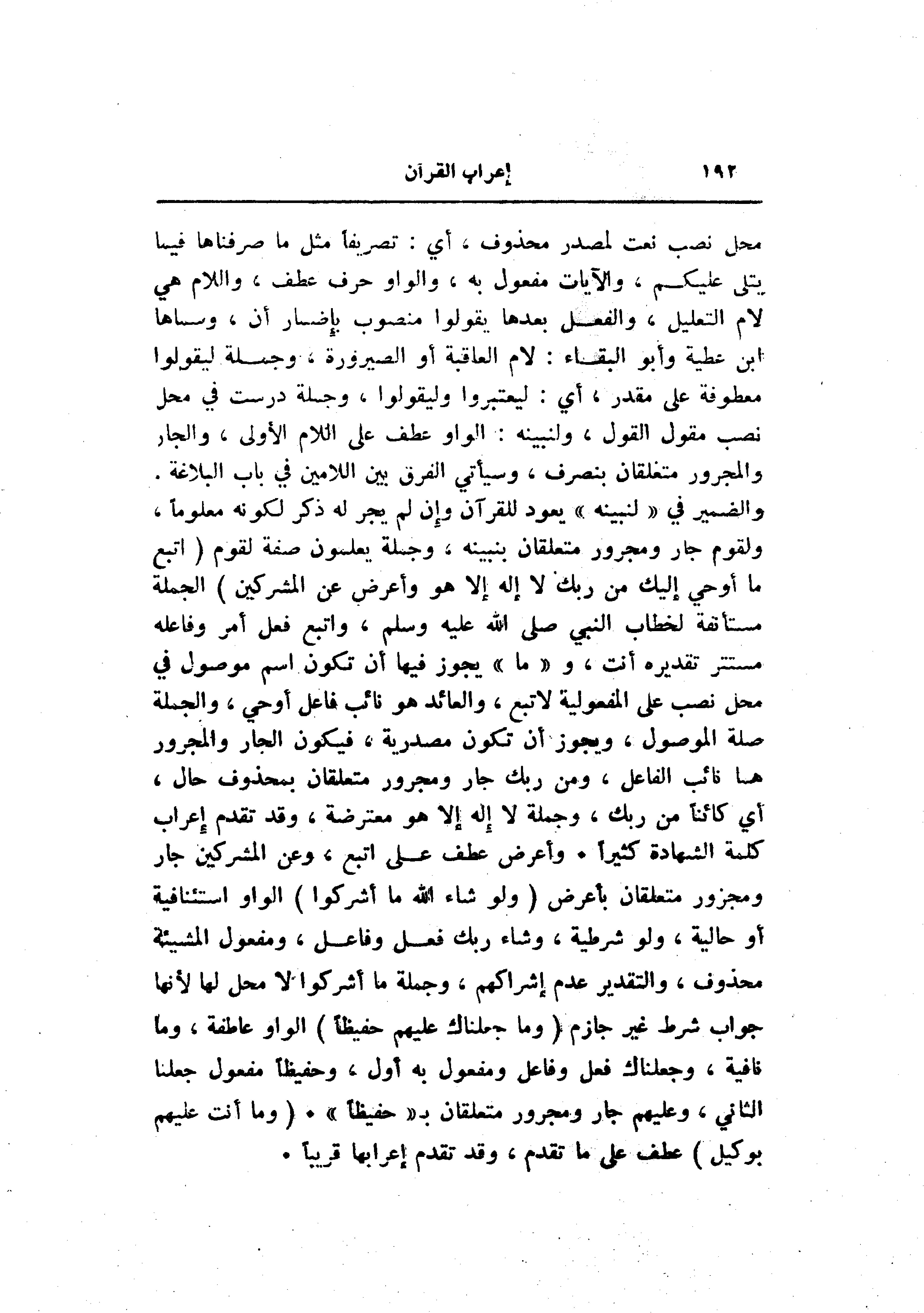 والضمير في «لنبينه» يعود للقرآن وإن لم يجر له ذكر لكونه معلوما، ولقوم جار ومجرور متعلقان بنبينه، وجملة يعلمون صفة لقوم (اتَّبِعْ ما أُوحِيَ إِلَيْكَ مِنْ رَبِّكَ لا إِلهَ إِلَّا هُوَ وَأَعْرِضْ عَنِ الْمُشْرِكِينَ) الجملة مستأنفة لخطاب النبي صلى الله عليه وسلم، واتبع فعل أمر وفاعله مستتر تقديره أنت، و «ما» يجوز فيها أن تكون اسم موصول في محل نصب على المفعولية لاتبع، والعائد هو نائب فاعل أوحي، والجملة صلة الموصول، ويجوز أن تكون مصدرية، فيكون الجار والمجرور هما نائب الفاعل، ومن ربك جار ومجرور متعلقان بمحذوف حال، أي كائنا من ربك، وجملة لا إله إلا هو معترضة، وقد تقدم إعراب كلمة الشهادة كثيرا. وأعرض عطف على اتبع، وعن المشركين جار ومجزور متعلقان بأعرض (وَلَوْ شاءَ اللَّهُ ما أَشْرَكُوا) الواو استئنافية أو حالية، ولو شرطية، وشاء ربك فعل وفاعل، ومفعول المشيئة محذوف، والتقدير عدم إشراكهم، وجملة ما أشركوا لا محل لها لأنها جواب شرط غير جازم (وَما جَعَلْناكَ عَلَيْهِمْ حَفِيظاً) الواو عاطفة، وما نافية، وجعلناك فعل وفاعل ومفعول به أول، وحفيظا مفعول جعلنا الثاني، وعليهم جار ومجرور متعلقان ب «حفيظا» . (وَما أَنْتَ عَلَيْهِمْ بِوَكِيلٍ) عطف على ما تقدم، وقد تقدم إعرابها قريبا.