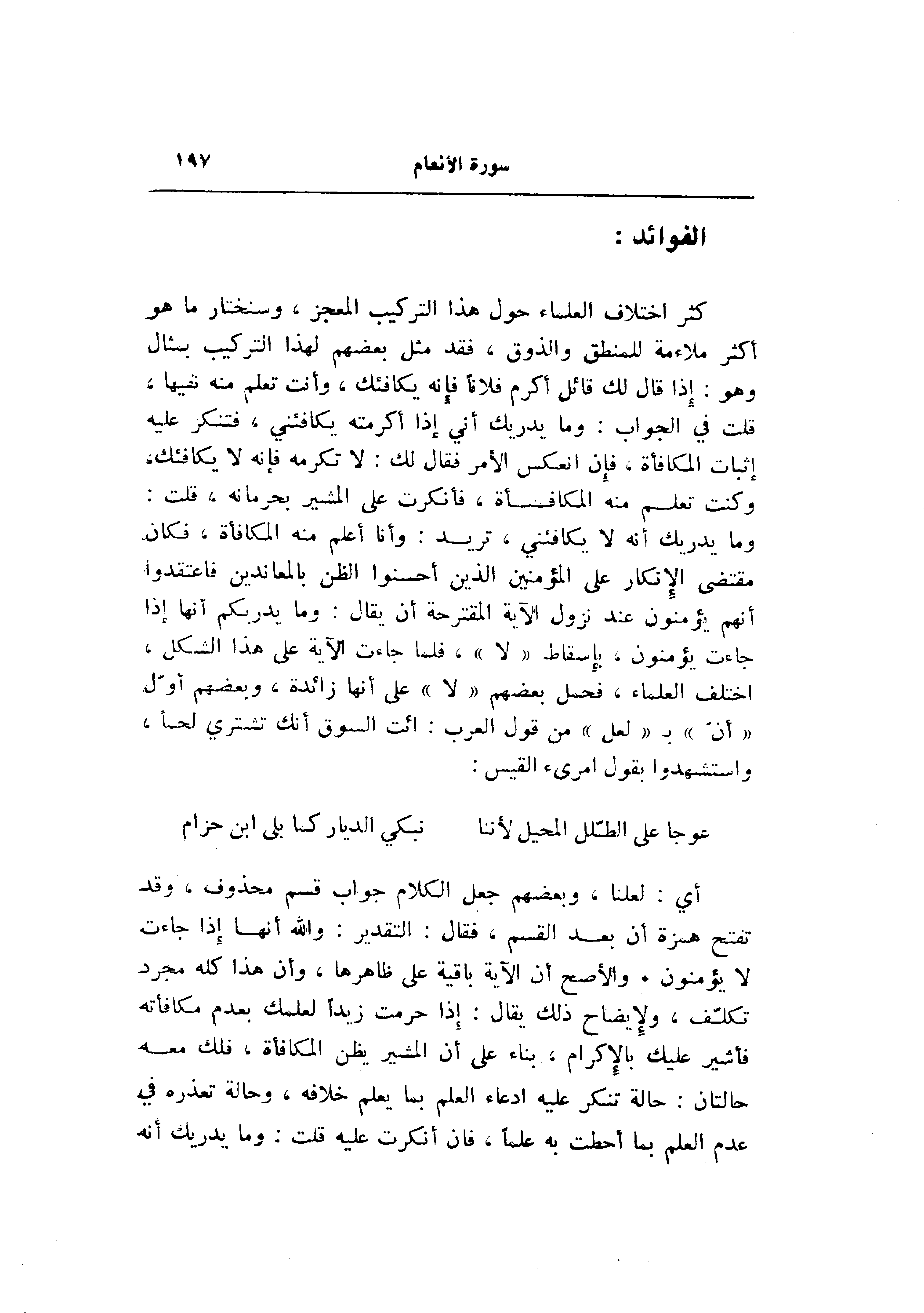 وما يدريك أنه لا يكافئني، تريد: وأنا أعلم منه المكافأة، فكان مقتضى الإنكار على المؤمنين الذين أحسنوا الظن بالمعاندين فاعتقدوا أنهم يؤمنون عند نزول الآية المقترحة أن يقال: وما يدريكم أنها إذا جاءت يؤمنون، بإسقاط «لا» ، فلما جاءت الآية على هذا الشكل، اختلف العلماء، فحمل بعضهم «لا» على أنها زائدة، وبعضهم أوّل «أنّ» ب «لعل» من قول العرب: أئت السوق أنك تشتري لحما، واستشهدوا بقول امرئ القيس: