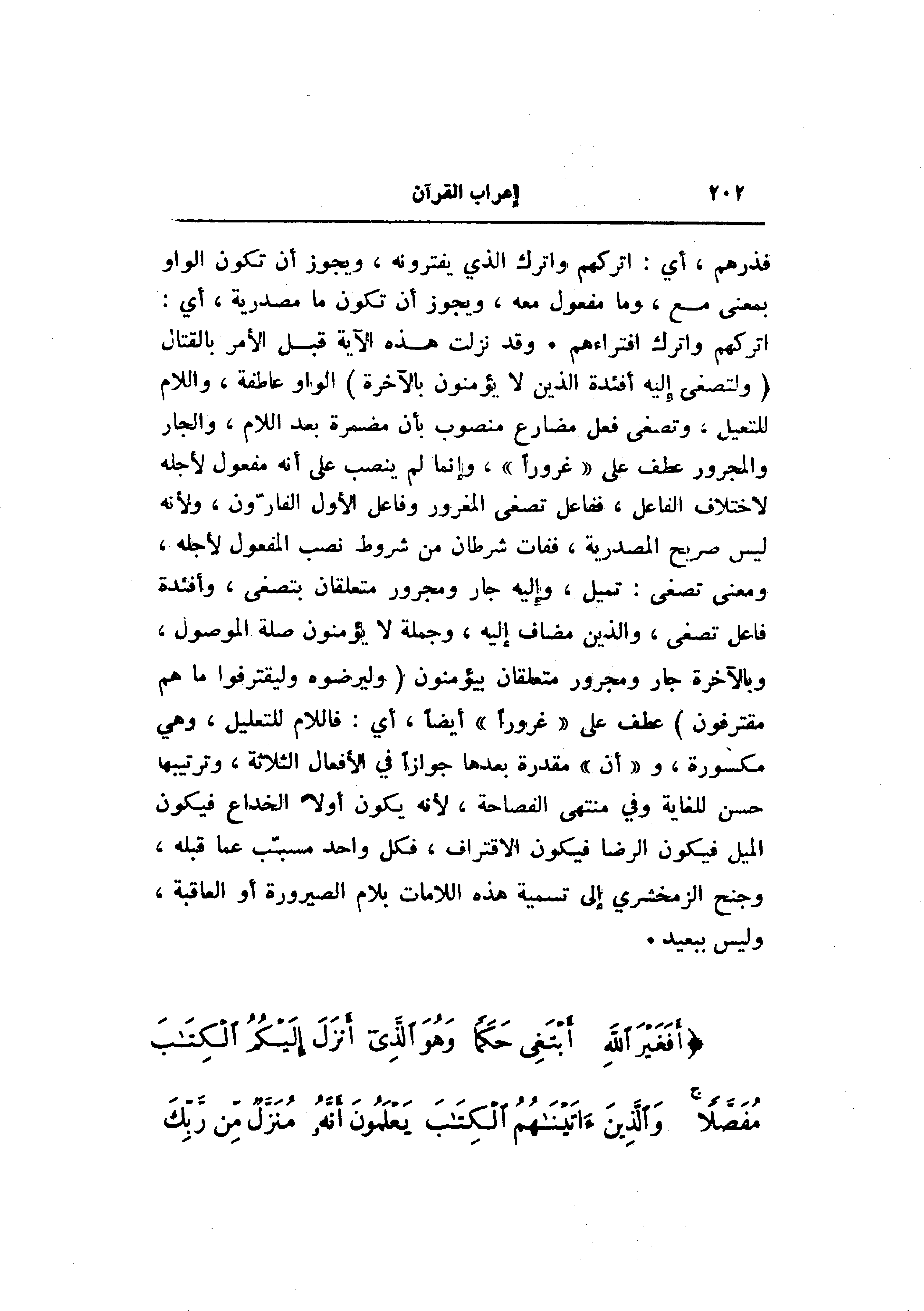 اتركهم واترك افتراءهم. وقد نزلت هذه الآية قبل الأمر بالقتال (وَلِتَصْغى إِلَيْهِ أَفْئِدَةُ الَّذِينَ لا يُؤْمِنُونَ بِالْآخِرَةِ) الواو عاطفة، واللام للتعليل، وتصغى فعل مضارع منصوب بأن مضمرة بعد اللام، والجار والمجرور عطف على «غرورا» ، وإنما لم ينصب على أنه مفعول لأجله لاختلاف الفاعل، ففاعل تصغى المغرور وفاعل الأول الفارّون، ولأنه ليس صريح المصدرية، ففات شرطان من شروط نصب المفعول لأجله، ومعنى تصغى: تميل، وإليه جار ومجرور متعلقان بتصغى، وأفئدة فاعل تصغى، والذين مضاف إليه، وجملة لا يؤمنون صلة الموصول، وبالآخرة جار ومجرور متعلقان بيؤمنون (وَلِيَرْضَوْهُ وَلِيَقْتَرِفُوا ما هُمْ مُقْتَرِفُونَ) عطف على «غرورا» أيضا، أي: فاللام للتعليل، وهي مكسورة، و «أن» مقدرة بعدها جوازا في الأفعال الثلاثة، وترتيبها حسن للغاية وفي منتهى الفصاحة، لأنه يكون أولا الخداع فيكون الميل فيكون الرضا فيكون الاقتراف، فكل واحد مسبّب عما قبله، وجنح الزمخشري إلى تسمية هذه اللامات بلام الصيرورة أو العاقبة، وليس ببعيد.
