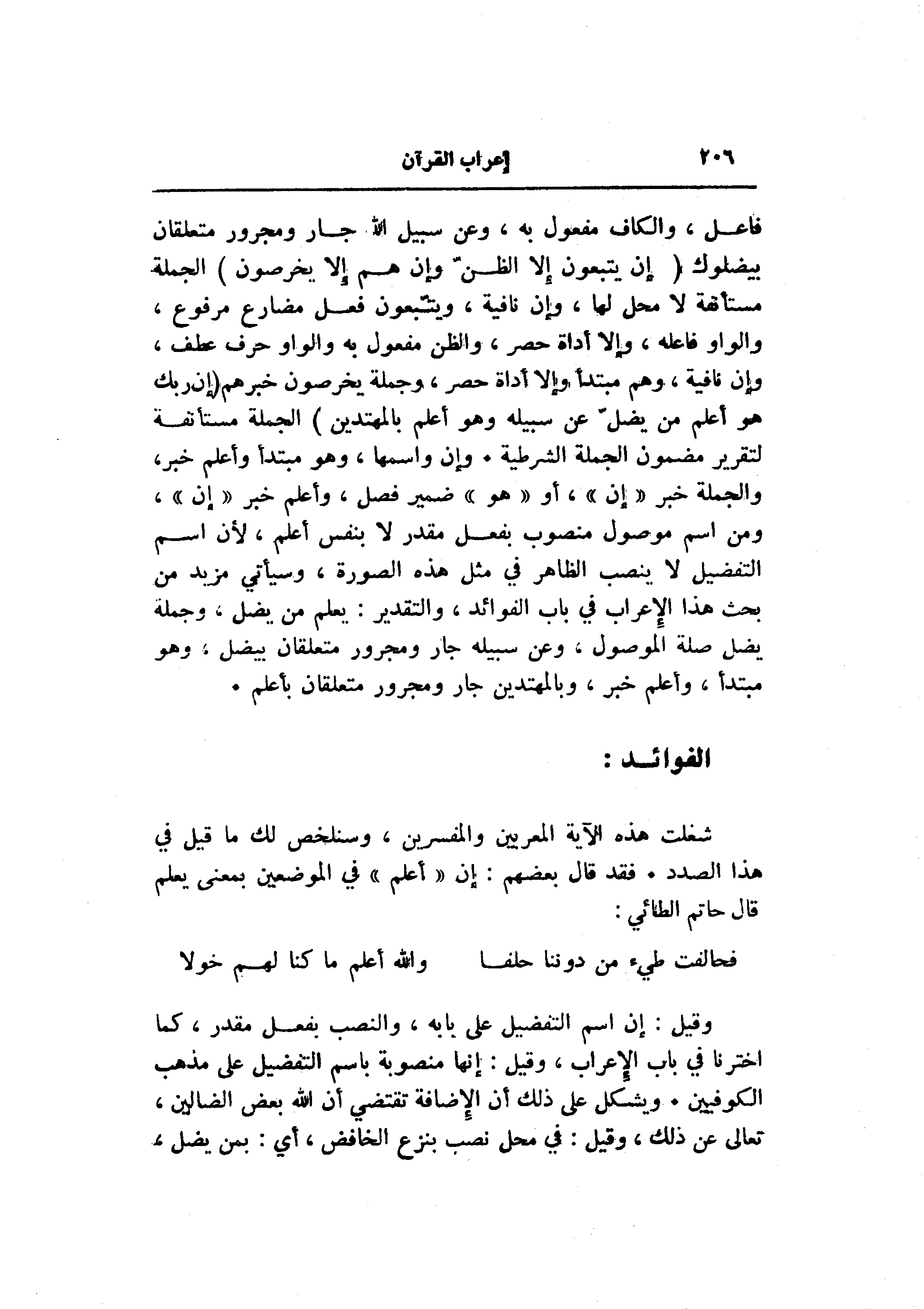 فاعل، والكاف مفعول به، وعن سبيل الله جار ومجرور متعلقان بيضلوك (إِنْ يَتَّبِعُونَ إِلَّا الظَّنَّ وَإِنْ هُمْ إِلَّا يَخْرُصُونَ) الجملة مستأنفة لا محل لها وإن نافية، ويتّبعون فعل مضارع مرفوع، والواو فاعله، وإلا أداة حصر، والظن مفعول به والواو حرف عطف، وإن نافية، وهم مبتدأ وإلا أداة حصر، وجملة يخرصون خبرهم (إِنَّ رَبَّكَ هُوَ أَعْلَمُ مَنْ يَضِلُّ عَنْ سَبِيلِهِ وَهُوَ أَعْلَمُ بِالْمُهْتَدِينَ) الجملة مستأنفة لتقرير مضمون الجملة الشرطية. وإن واسمها، وهو مبتدأ وأعلم خبر، والجملة خبر «إن» ، أو «هو» ضمير فصل، وأعلم خبر «إن» ، ومن اسم موصول منصوب بفعل مقدر لا بنفس أعلم، لأن اسم التفضيل لا ينصب الظاهر في مثل هذه الصورة وسيأتي مزيد من بحث هذا الإعراب في باب الفوائد، والتقدير: يعلم من يضل، وجملة يضل صلة الموصول، وعن سبيله جار ومجرور متعلقان بيضل، وهو مبتدأ، وأعلم خبر وبالمهتدين جار ومجرور متعلقان بأعلم.