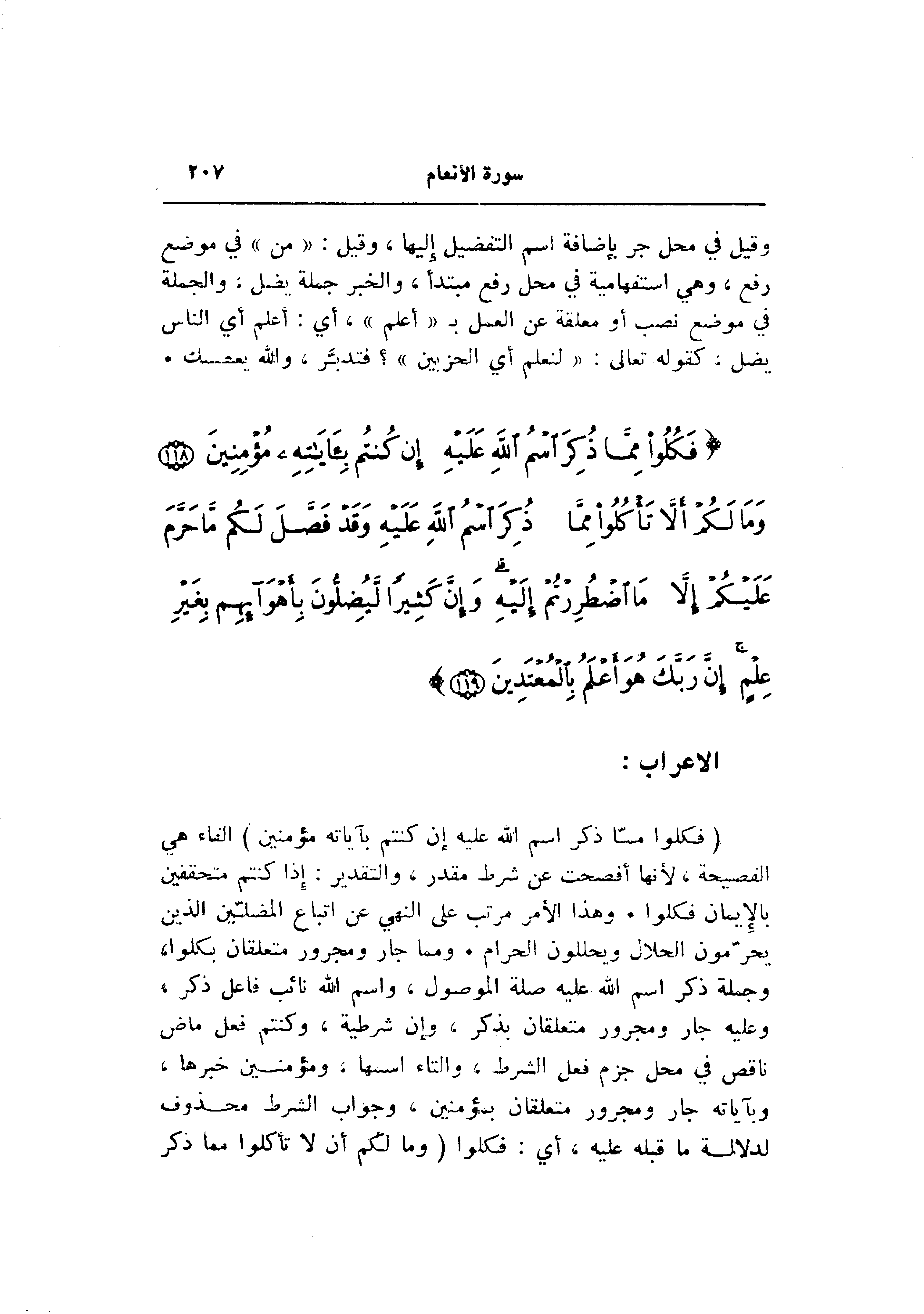 (فَكُلُوا مِمَّا ذُكِرَ اسْمُ اللَّهِ عَلَيْهِ إِنْ كُنْتُمْ بِآياتِهِ مُؤْمِنِينَ) الفاء هي الفصيحة، لأنها أفصحت عن شرط مقدر، والتقدير: إذا كنتم متحقفين بالإيمان فكلوا. وهذا الأمر مرتب على النهي عن اتباع المضلّين الذين يحرّمون الحلال ويحللون الحرام. ومما جار ومجرور متعلقان بكلوا، وجملة ذكر اسم الله عليه صلة الموصول، واسم الله نائب فاعل ذكر، وعليه جار ومجرور متعلقان بذكر، وإن شرطية، وكنتم فعل ماض ناقص في محل جزم فعل الشرط، والتاء اسمها، ومؤمنين خبرها، وبآياته جار ومجرور متعلقان بمؤمنين، وجواب الشرط محذوف لدلالة ما قبله عليه، أي: فكلوا (وَما لَكُمْ أَلَّا تَأْكُلُوا مِمَّا ذُكِرَ اسْمُ اللَّهِ عَلَيْهِ)
