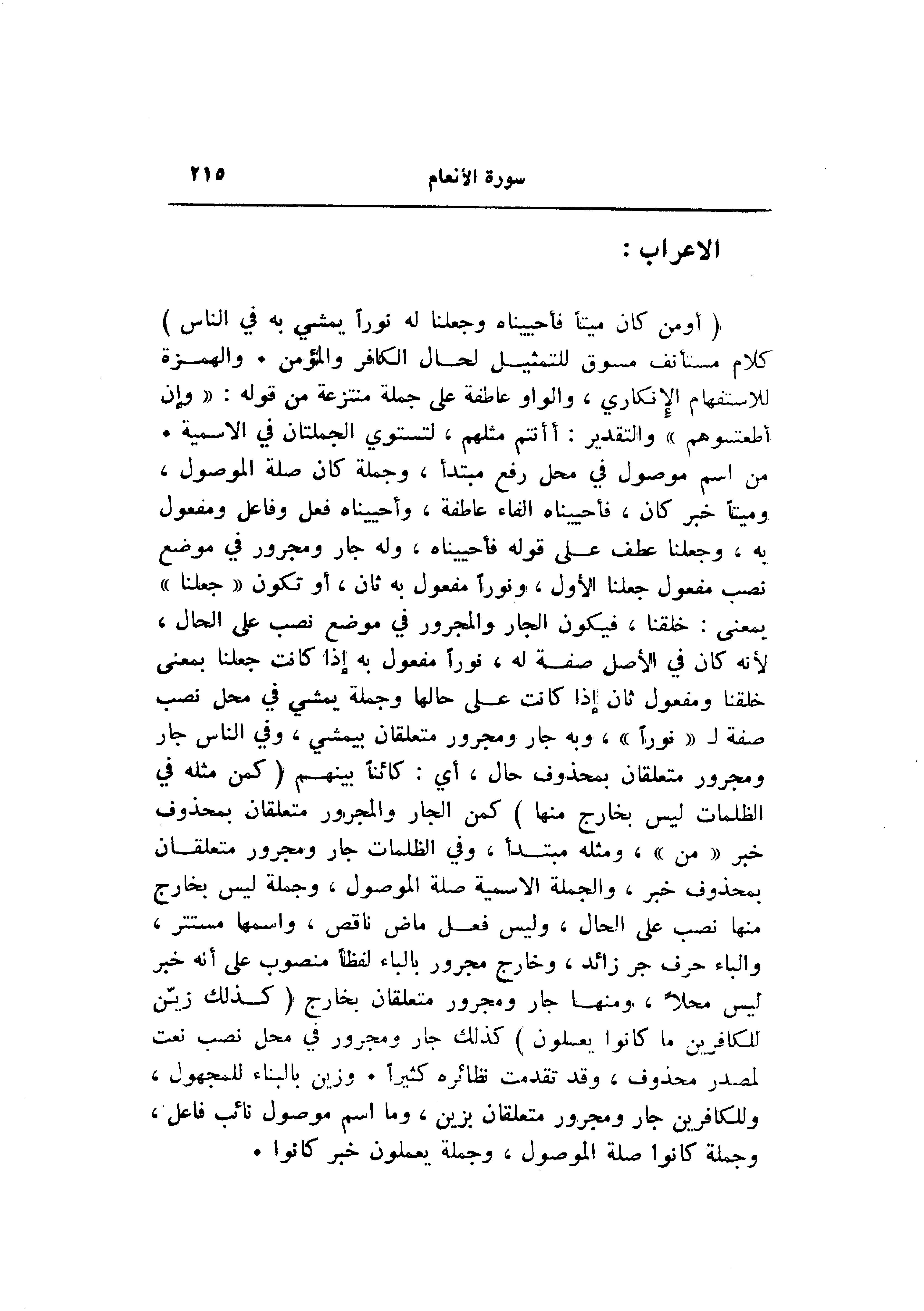 من اسم موصول في محل رفع مبتدأ، وجملة كان صلة الموصول، وميتا خبر كان، فأحييناه الفاء عاطفة، وأحييناه فعل وفاعل ومفعول به، وجعلنا عطف على قوله فأحييناه، وله جار ومجرور في موضع نصب مفعول جعلنا الأول، ونورا مفعول به ثان، أو تكون «جعلنا» بمعنى: خلقنا، فيكون الجار والمجرور في موضع نصب على الحال، لأنه كان في الأصل صفة له، نورا مفعول به إذا كانت جعلنا بمعنى خلقنا ومفعول ثان إذا كانت على حالها وجملة يمشي في محل نصب صفة ل «نورا» ، وبه جار ومجرور متعلقان بيمشي، وفي الناس جار ومجرور متعلقان بمحذوف حال، أي: كائنا بينهم (كَمَنْ مَثَلُهُ فِي الظُّلُماتِ لَيْسَ بِخارِجٍ مِنْها) كمن الجار والمجرور متعلقان بمحذوف خبر «من» ، ومثله مبتدأ، وفي الظلمات جار ومجرور متعلقان بمحذوف خبر، والجملة الاسمية صلة الموصول، وجملة ليس بخارج منها نصب على الحال، وليس فعل ماض ناقص، واسمها مستتر، والباء حرف جر زائد، وخارج مجرور بالباء لفظا منصوب على أنه خبر ليس محلا، ومنها جار ومجرور متعلقان بخارج (كَذلِكَ زُيِّنَ لِلْكافِرِينَ ما كانُوا يَعْمَلُونَ) كذلك جار ومجرور في محل نصب نعت لمصدر محذوف، وقد تقدمت نظائره كثيرا. وزين بالبناء للمجهول، وللكافرين جار ومجرور متعلقان بزين، وما اسم موصول نائب فاعل، وجملة كانوا صلة الموصول، وجملة يعملون خبر كانوا.