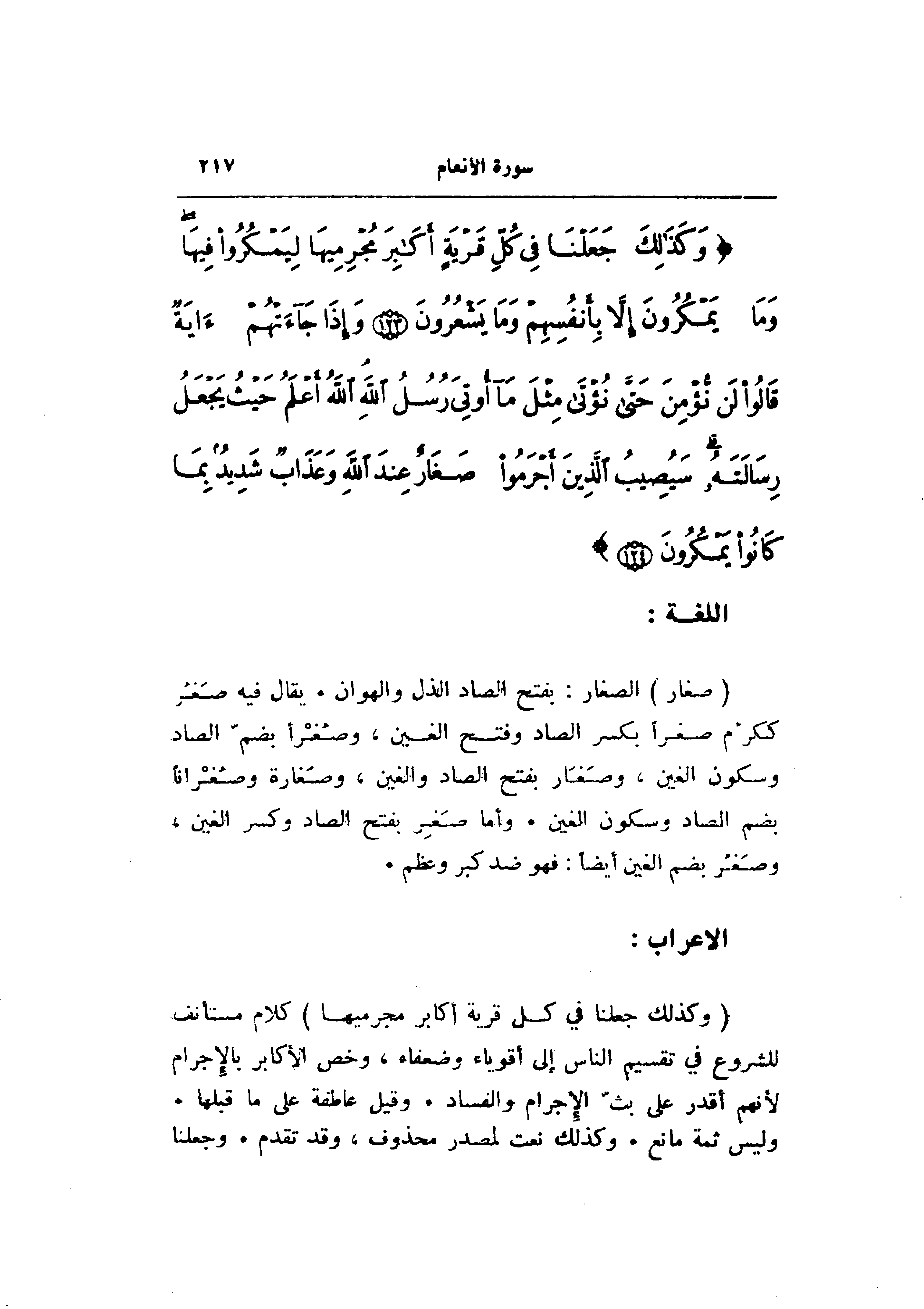 (وَكَذلِكَ جَعَلْنا فِي كُلِّ قَرْيَةٍ أَكابِرَ مُجْرِمِيها) كلام مستأنف للشروع في تقسيم الناس إلى أقوياء وضعفاء، وخص الأكابر بالإجرام لأنهم أقدر على بثّ الإجرام والفساد. وقيل عاطفة على ما قبلها.