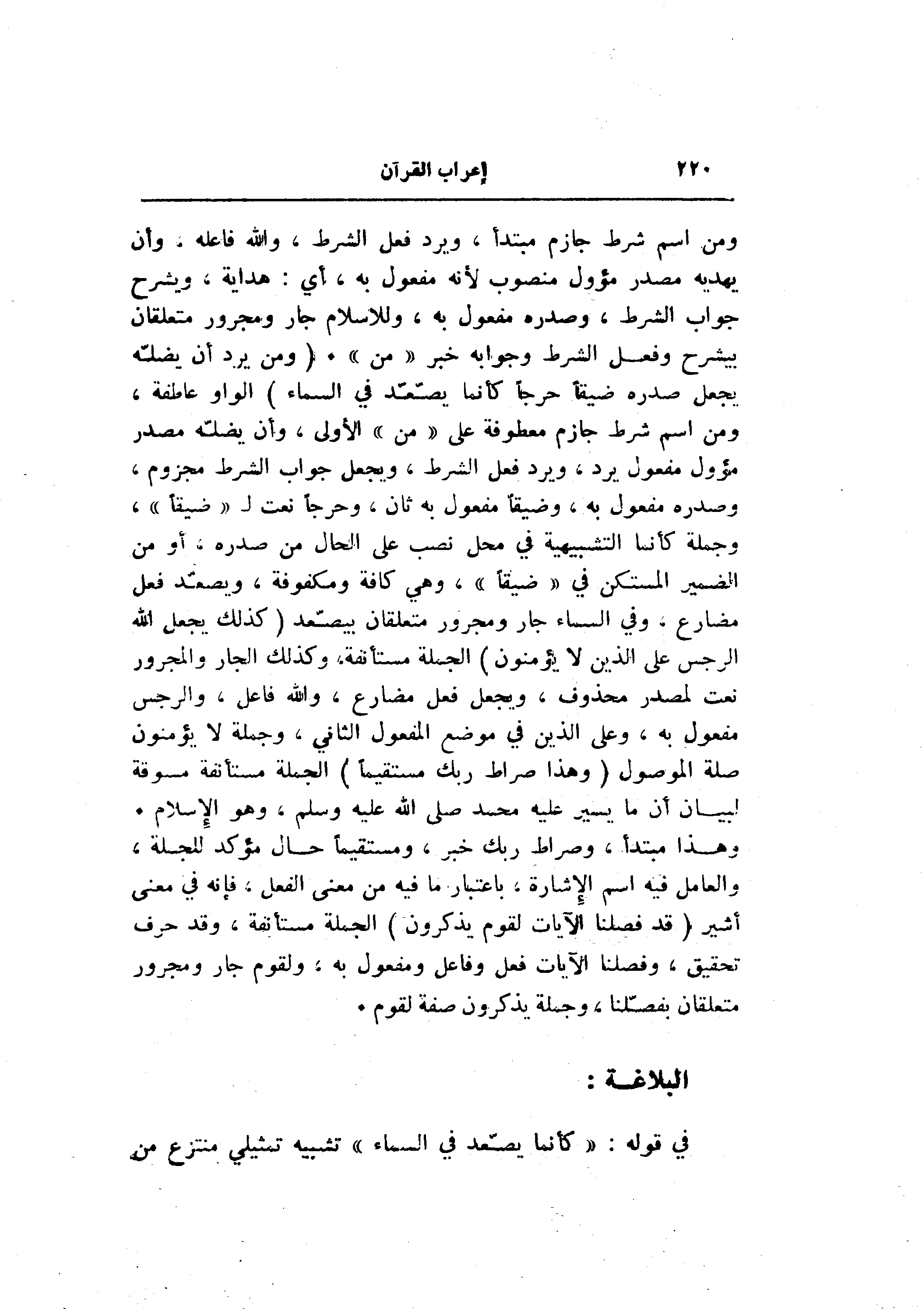 ومن اسم شرط جازم مبتدأ، ويرد فعل الشرط، والله فاعله، وأن يهديه مصدر مؤول منصوب لأنه مفعول به، أي: هداية، ويشرح جواب الشرط، وصدره مفعول به، وللاسلام جار ومجرور متعلقان بيشرح وفعل الشرط وجوابه خبر «من» . (وَمَنْ يُرِدْ أَنْ يُضِلَّهُ يَجْعَلْ صَدْرَهُ ضَيِّقاً حَرَجاً كَأَنَّما يَصَّعَّدُ فِي السَّماءِ) الواو عاطفة، ومن اسم شرط جازم معطوفة على «من» الأولى، وأن يضلّه مصدر مؤول مفعول يرد، ويرد فعل الشرط، ويجعل جواب الشرط مجزوم، وصدره مفعول به، وضيقا مفعول به ثان، وحرجا نعت ل «ضيقا» ، وجملة كأنما التشبيهية في محل نصب على الحال من صدره، أو من الضمير المستكن في «ضيقا» ، وهي كافة ومكفوفة، ويصعّد فعل مضارع، وفي السماء جار ومجرور متعلقان بيصّعد (كَذلِكَ يَجْعَلُ اللَّهُ الرِّجْسَ عَلَى الَّذِينَ لا يُؤْمِنُونَ) الجملة مستأنفة، وكذلك الجار والمجرور نعت لمصدر محذوف، ويجعل فعل مضارع، والله فاعل، والرجس مفعول به، وعلى الذين في موضع المفعول الثاني، وجملة لا يؤمنون صلة الموصول (وَهذا صِراطُ رَبِّكَ مُسْتَقِيماً) الجملة مستأنفة مسوقة لبيان أن ما يسير عليه محمد صلى الله عليه وسلم، وهو الإسلام.