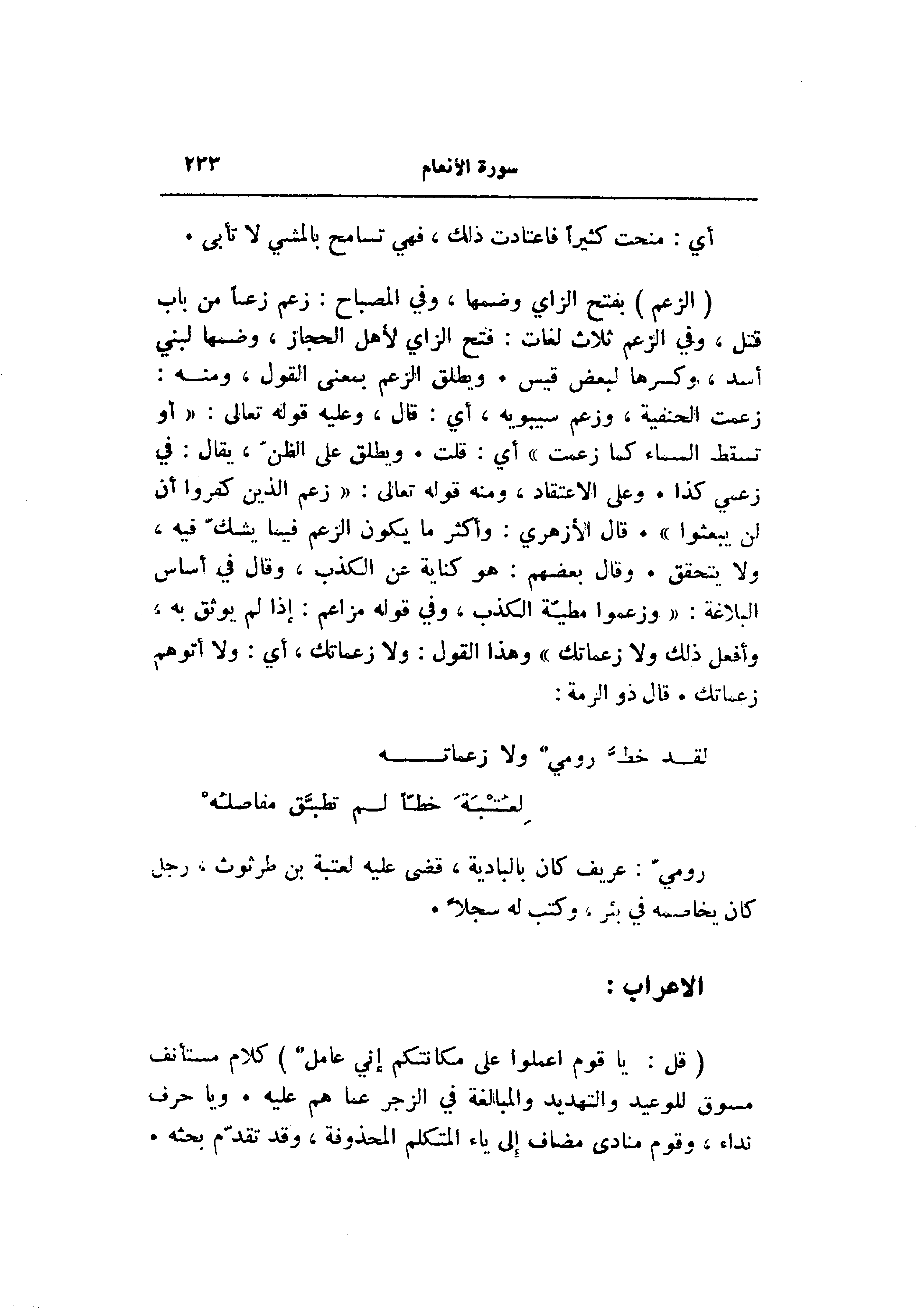 زعمت الحنفية، وزعم سيبويه، أي: قال، وعليه قوله تعالى: «أو تسقط السماء كما زعمت» أي: قلت. ويطلق على الظنّ، يقال: في زعمي كذا. وعلى الاعتقاد، ومنه قوله تعالى: «زعم الذين كفروا أن لن يبعثوا» . قال الأزهري: وأكثر ما يكون الزعم فيما يشكّ فيه، ولا يتحقق. وقال بعضهم: هو كناية عن الكذب، وقال في أساس البلاغة: «وزعموا مطيّة الكذب، وفي قوله مزاعم: إذا لم يوثق به، وأفعل ذلك ولا زعماتك» وهذا القول: ولا زعماتك، أي: ولا أتوهم زعماتك. قال ذو الرمة:
