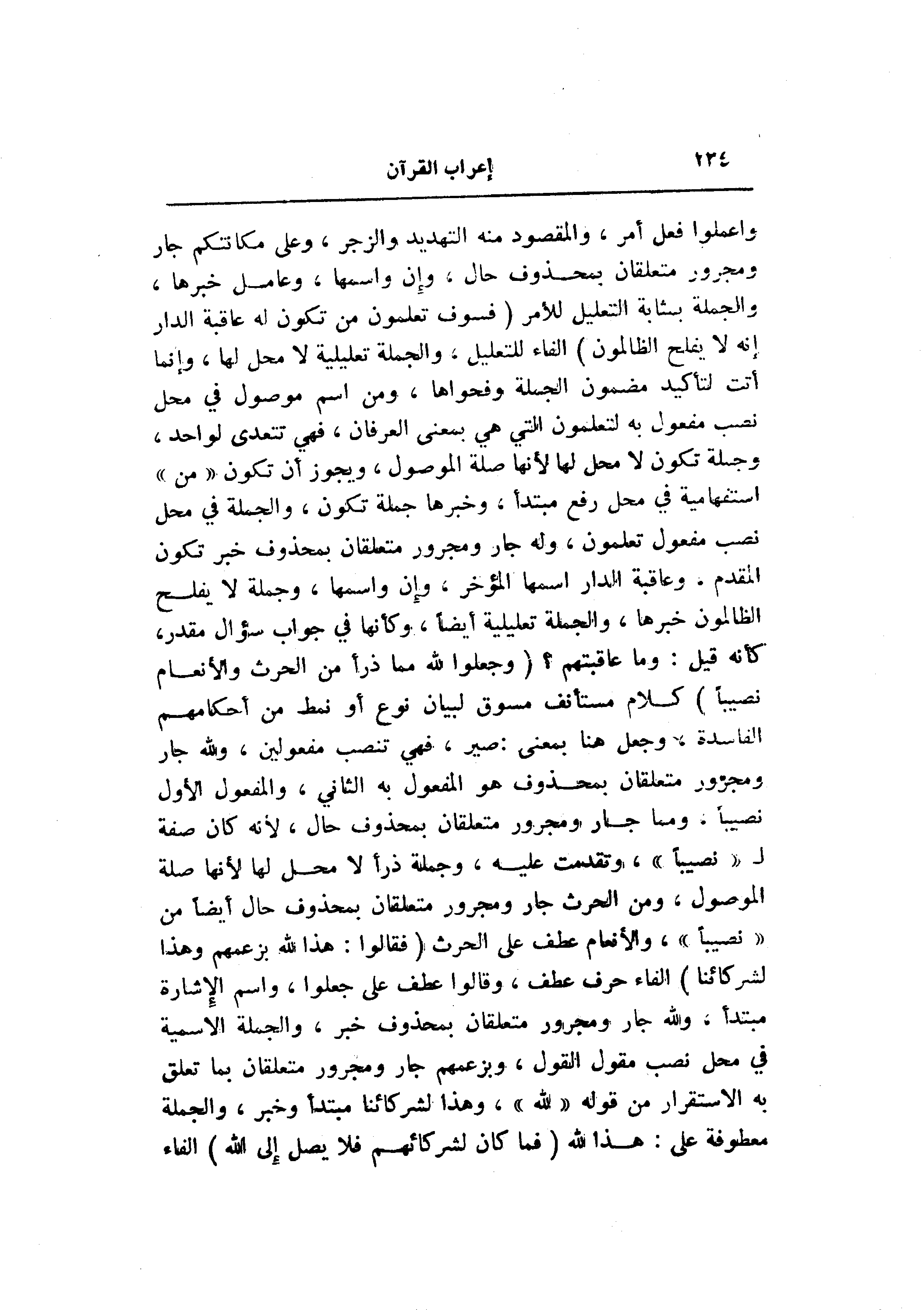 واعملوا فعل أمر، والمقصود منه التهديد والزجر، وعلى مكانتكم جار ومجرور متعلقان بمحذوف حال، وإن واسمها، وعامل خبرها، والجملة بمثابة التعليل للأمر (فَسَوْفَ تَعْلَمُونَ مَنْ تَكُونُ لَهُ عاقِبَةُ الدَّارِ إِنَّهُ لا يُفْلِحُ الظَّالِمُونَ) الفاء للتعليل، والجملة تعليلية لا محل لها، وإنما أتت لتأكيد مضمون الجملة وفحواها، ومن اسم موصول في محل نصب مفعول به لتعلمون التي هي بمعنى العرفان، فهي تتعدى لواحد، وجملة تكون لا محل لها لأنها صلة الموصول، ويجوز أن تكون «من» استفهامية في محل رفع مبتدأ، وخبرها جملة تكون، والجملة في محل نصب مفعول تعلمون، وله جار ومجرور متعلقان بمحذوف خبر تكون المقدم، وعاقبة الدار اسمها المؤخر، وإن واسمها، وجملة لا يفلح الظالمون خبرها، والجملة تعليلية أيضا، وكأنها في جواب سؤال مقدر، كأنه قيل: وما عاقبتهم؟ (وَجَعَلُوا لِلَّهِ مِمَّا ذَرَأَ مِنَ الْحَرْثِ وَالْأَنْعامِ نَصِيباً) كلام مستأنف مسوق لبيان نوع أو نمط من أحكامهم الفاسدة، وجعل هنا بمعنى: صير، فهي تنصب مفعولين، ولله جار ومجرور متعلقان بمحذوف هو المفعول به الثاني، والمفعول الأول نصيبا، ومما جار ومجرور متعلقان بمحذوف حال، لأنه كان صفة ل «نصيبا» ، وتقدمت عليه، وجملة ذرأ لا محل لها لأنها صلة الموصول، ومن الحرث جار ومجرور متعلقان بمحذوف حال أيضا من «نصيبا» ، والأنعام عطف على الحرث (فَقالُوا: هذا لِلَّهِ بِزَعْمِهِمْ وَهذا لِشُرَكائِنا) الفاء حرف عطف، وقالوا عطف على جعلوا، واسم الإشارة مبتدأ، والله جار ومجرور متعلقان بمحذوف خبر، والجملة الاسمية في محل نصب مقول القول، وبزعمهم جار ومجرور متعلقان بما تعلق به الاستقرار من قوله «لله» ، وهذا لشركائنا مبتدأ وخبر، والجملة معطوفة على: هذا لله (فَما كانَ لِشُرَكائِهِمْ فَلا يَصِلُ إِلَى اللَّهِ) الفاء