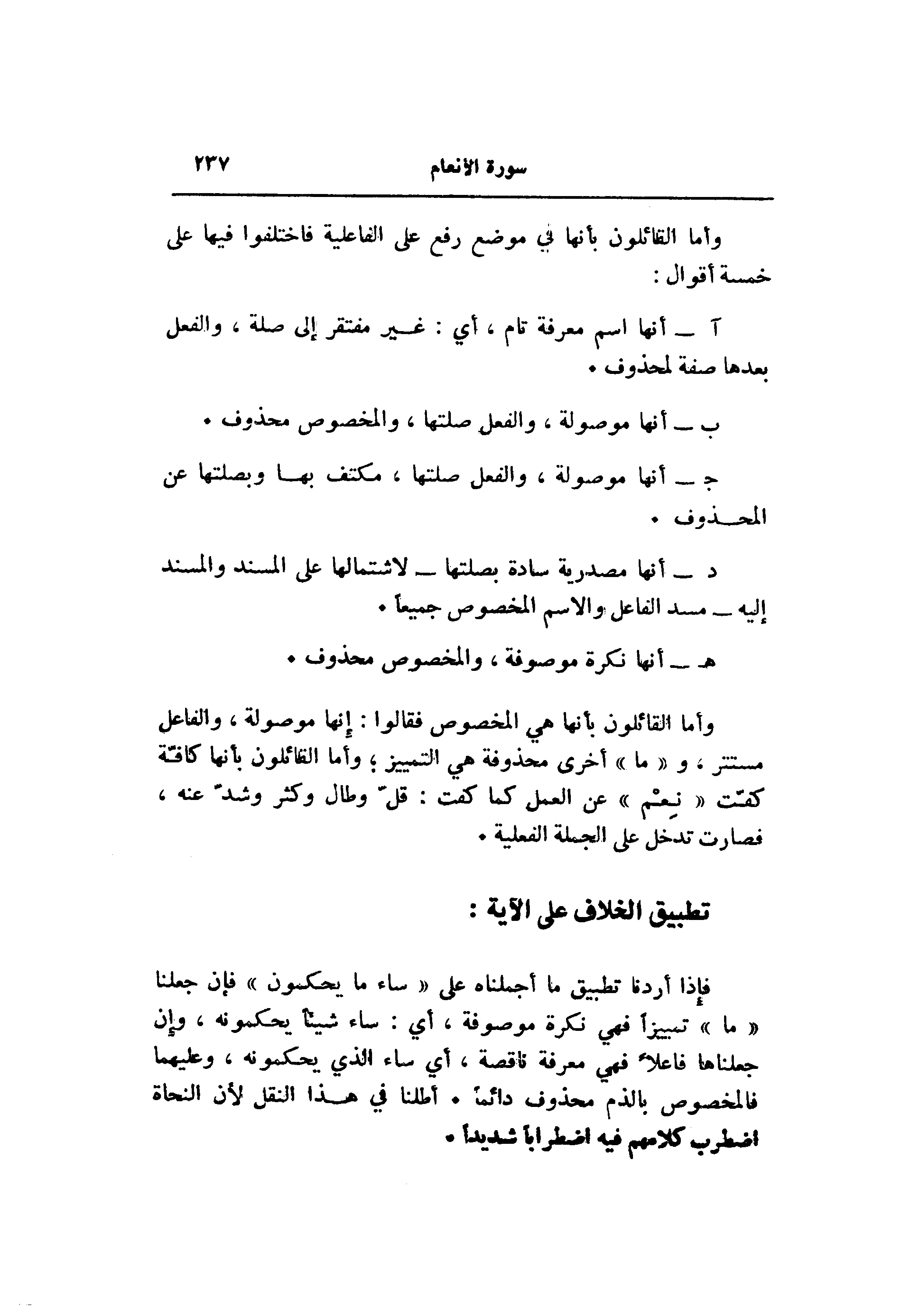 فإذا أردنا تطبيق ما أجملناه على «ساء ما يحكمون» فإن جعلنا «ما» تمييزا فهي نكرة موصوفة، أي: ساء شيئا يحكمونه، وإن جعلناها فاعلا فهي معرفة ناقصة، أي ساء الذي يحكمونه، وعليهما فالمخصوص بالذم محذوف دائما. أطلنا في هذا النقل لأن النحاة اضطرب كلامهم فيه اضطرابا شديدا.