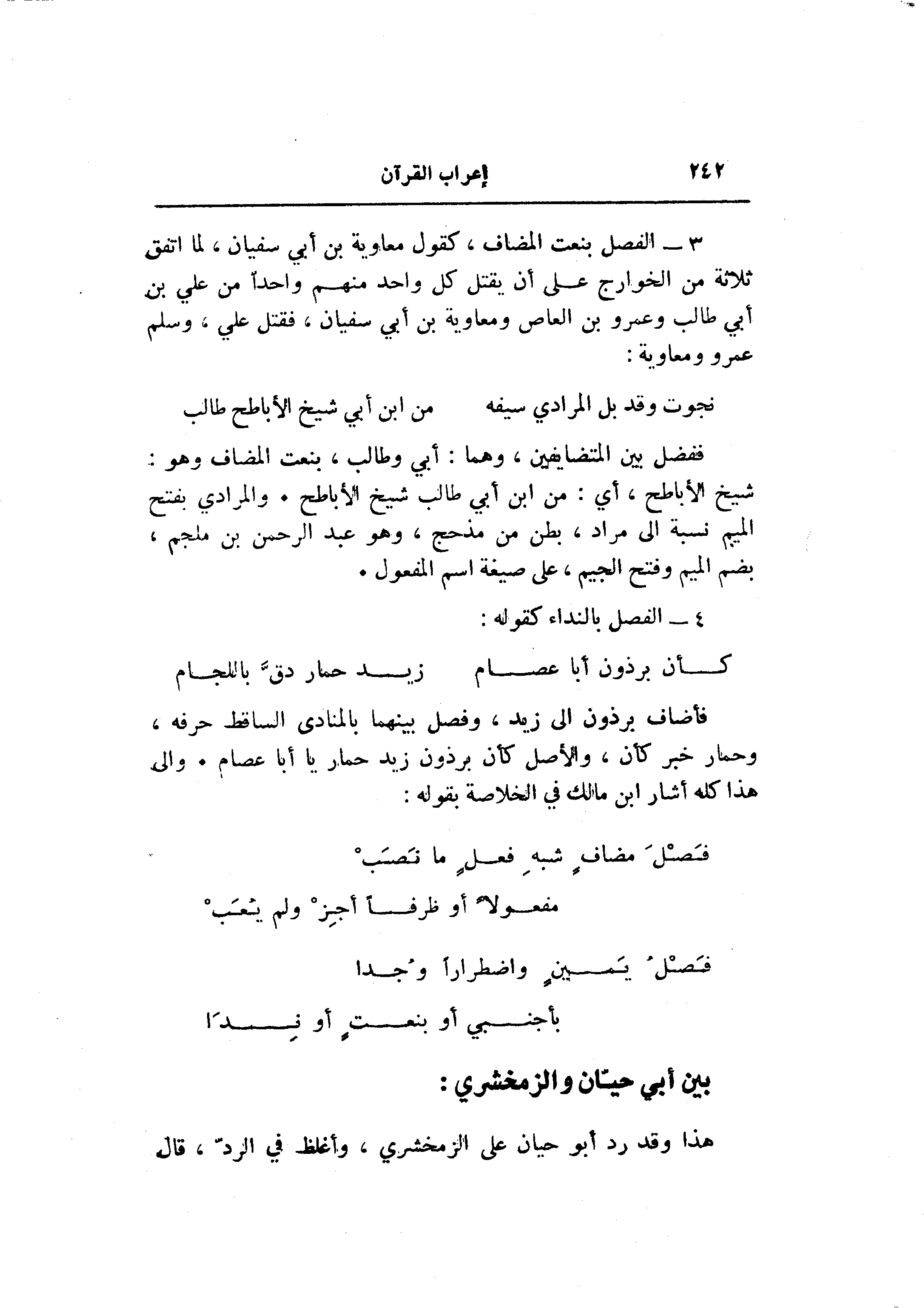 3- الفصل بنعت المضاف، بنعت المضاف، كقول معاوية بن أبي سفيان، لما اتفق ثلاثة من الخوارج على أن يقتل كل واحد منهم واحدا من علي بن أبي طالب وعمرو بن العاص ومعاوية بن أبي سفيان، فقتل علي، وسلم عمرو ومعاوية: