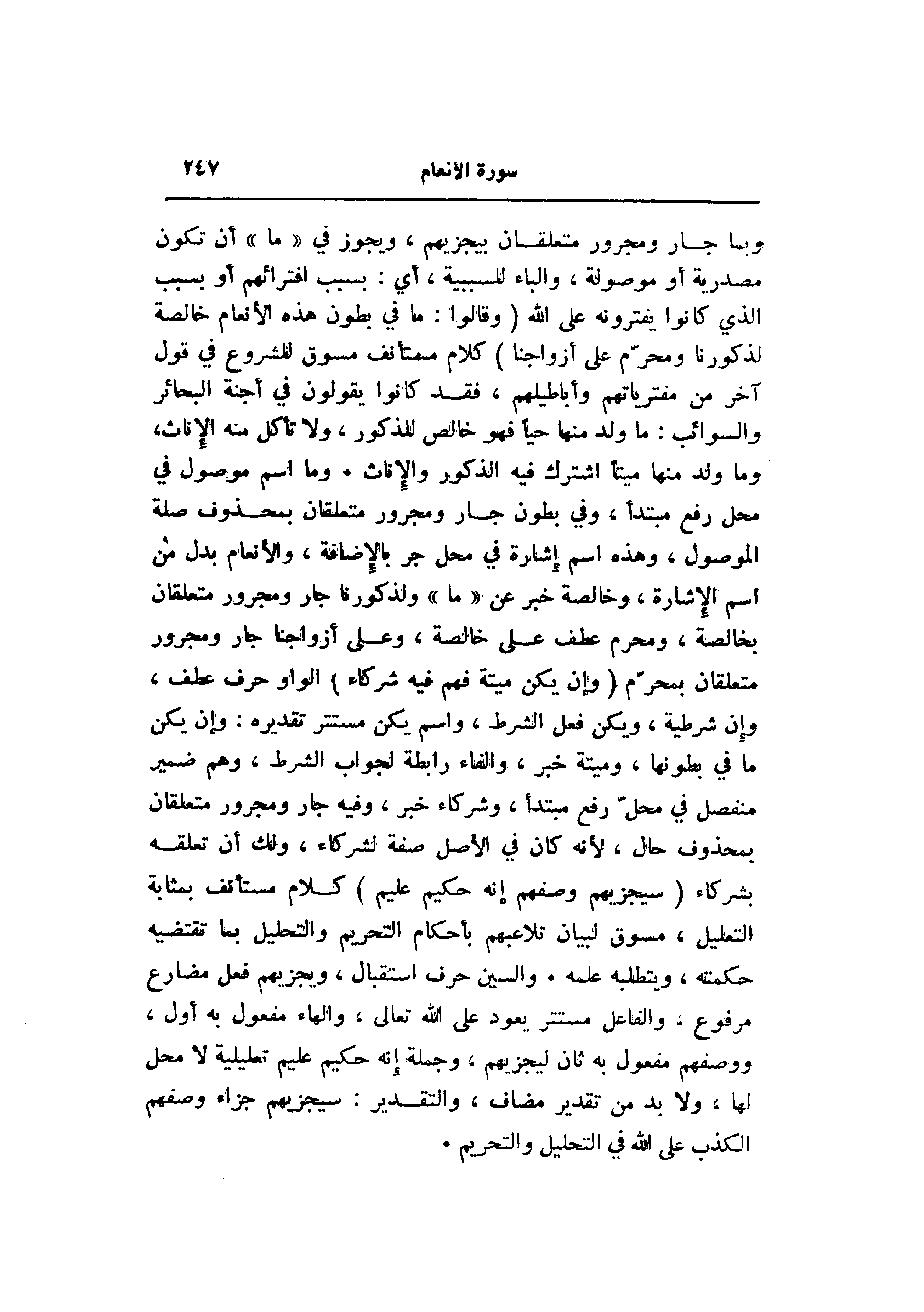 وبما جار ومجرور متعلقان بيجزيهم، ويجوز في «ما» أن تكون مصدرية أو موصولة، والباء للسببية، أي: بسبب افترائهم أو بسبب الذي كانوا يفترونه على الله (وَقالُوا: ما فِي بُطُونِ هذِهِ الْأَنْعامِ خالِصَةٌ لِذُكُورِنا وَمُحَرَّمٌ عَلى أَزْواجِنا) كلام مستأنف مسوق للشروع في قول آخر من مفترياتهم وأباطيلهم، فقد كانوا يقولون في أجنة البحائر والسوائب: ما ولد منها حيا فهو خالص للذكور، ولا تأكل منه الإناث، وما ولد منها ميتا اشترك فيه الذكور والإناث. وما اسم موصول في محل رفع مبتدأ، وفي بطون جار ومجرور متعلقان بمحذوف صلة الموصول، وهذه اسم إشارة في محل جر بالإضافة، والأنعام بدل من اسم الإشارة، وخالصة خبر عن «ما» ولذكورنا جار ومجرور متعلقان بخالصة، ومحرم عطف على خالصة، وعلى أزواجنا جار ومجرور متعلقان بمحرّم (وَإِنْ يَكُنْ مَيْتَةً فَهُمْ فِيهِ شُرَكاءُ) الواو حرف عطف، وإن شرطية، ويكن فعل الشرط، واسم يكن مستتر تقديره: وإن يكن ما في بطونها، وميتة خبر، والفاء رابطة لجواب الشرط، وهم ضمير منفصل في محلّ رفع مبتدأ، وشركاء خبر، وفيه جار ومجرور متعلقان بمحذوف حال، لأنه كان في الأصل صفة لشركاء، ولك أن تعلقه بشركاء (سَيَجْزِيهِمْ وَصْفَهُمْ إِنَّهُ حَكِيمٌ عَلِيمٌ) كلام مستأنف بمثابة التعليل، مسوق لبيان تلاعبهم بأحكام التحريم والتحليل بما تقتضيه حكمته، ويتطلبه علمه. والسين حرف استقبال، ويجزيهم فعل مضارع مرفوع، والفاعل مستتر يعود على الله تعالى، والهاء مفعول به أول، ووصفهم مفعول به ثان ليجزيهم، وجملة إنه حكيم عليم تعليلية لا محل لها، ولا بد من تقدير مضاف، والتقدير: سيجزيهم جزاء وصفهم الكذب على الله في التحليل والتحريم.