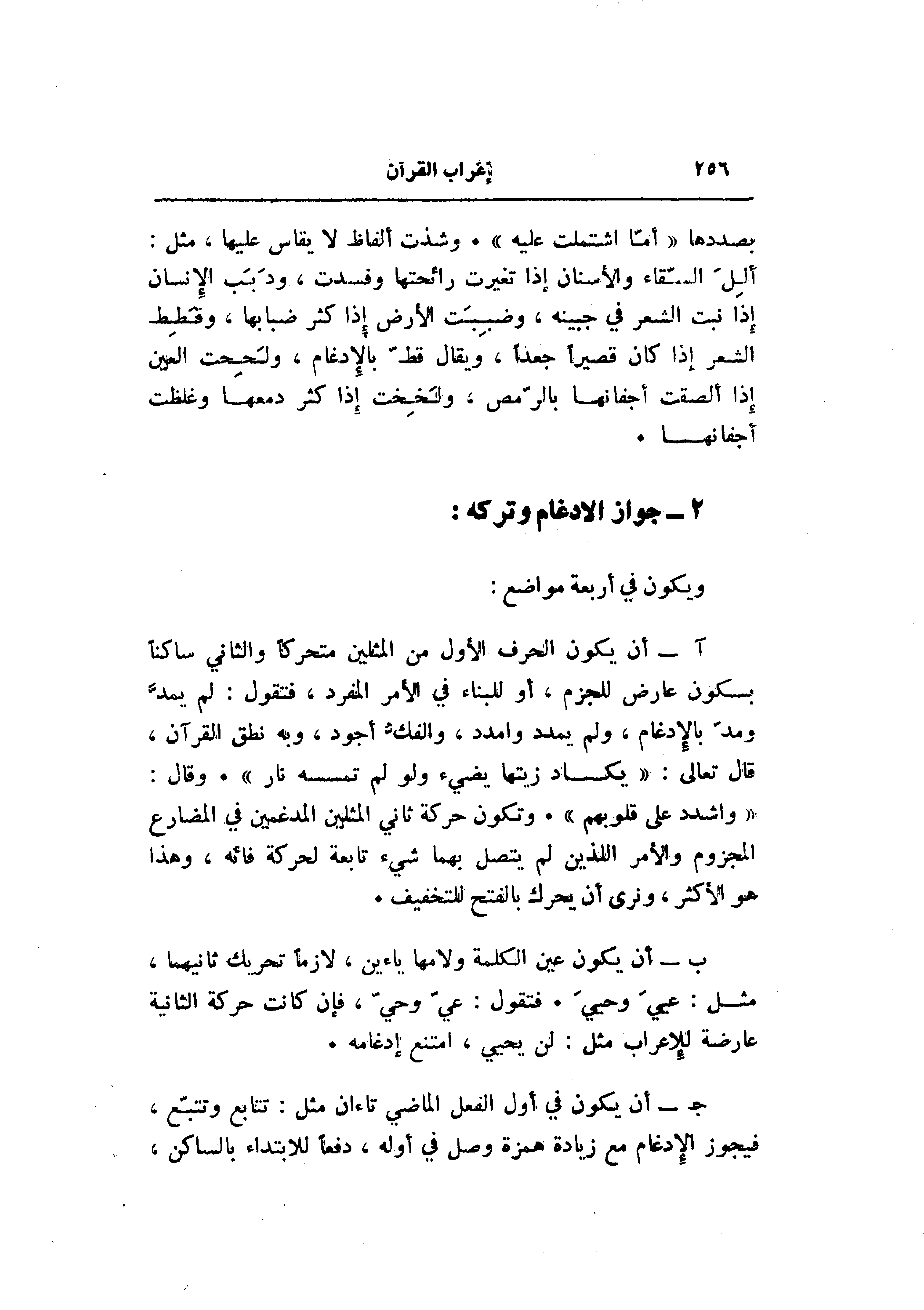 «واشدد على قلوبهم» . وتكون حركة ثاني المثلين المدغمين في المضارع المجزوم والأمر اللذين لم يتصل بهما شيء تابعة لحركة فائه، وهذا هو الأكثر، ونرى أن يحرك بالفتح للتخفيف.