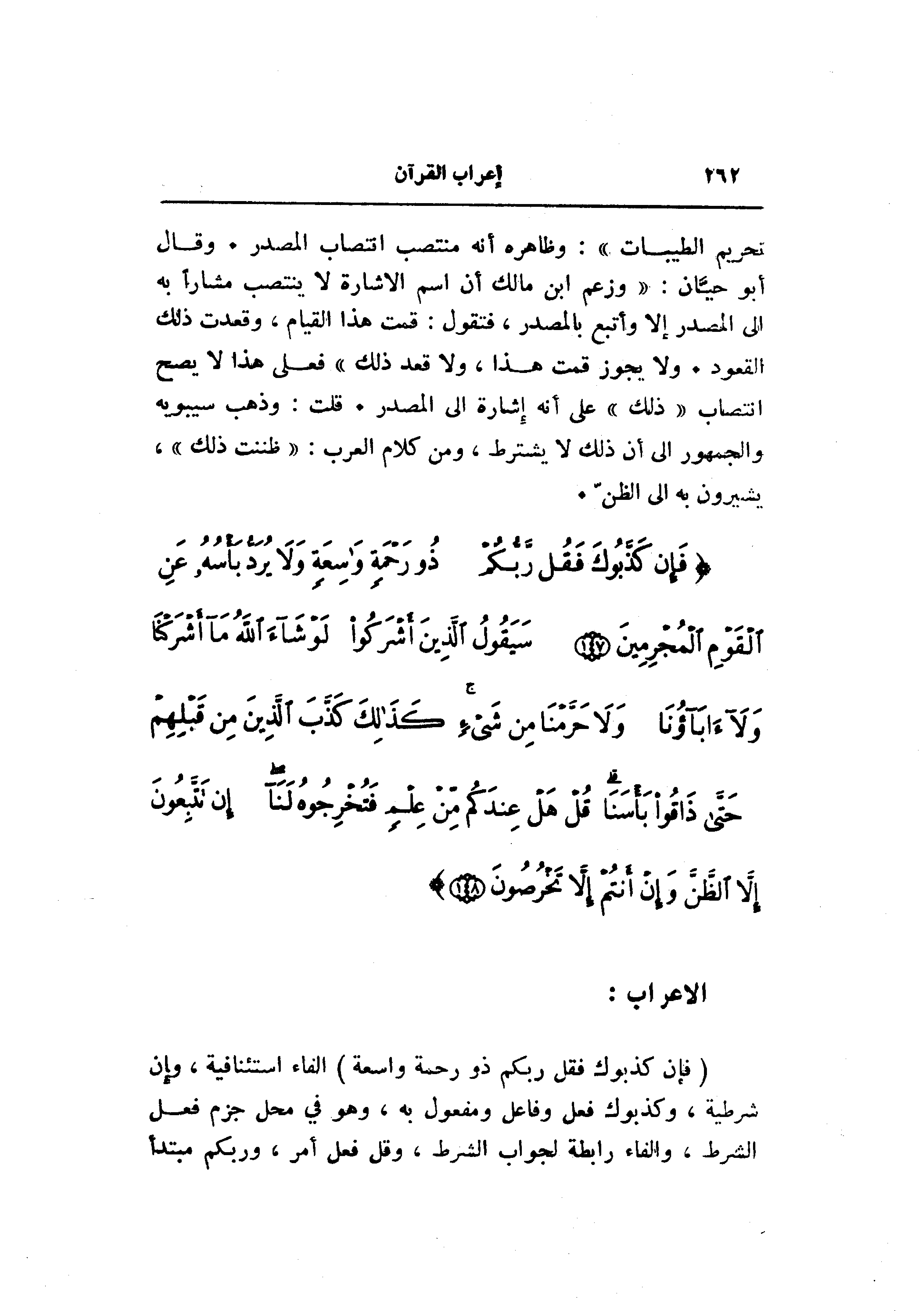 تحريم الطيبات» : وظاهره أنه منتصب انتصاب المصدر. وقال أبو حيّان: «وزعم ابن مالك أن اسم الاشارة لا ينتصب مشارا به الى المصدر إلا وأتبع بالمصدر، فتقول: قمت هذا القيام، وقعدت ذلك القعود. ولا يجوز قمت هذا، ولا قعد ذلك» فعلى هذا لا يصح انتصاب «ذلك» على أنه إشارة الى المصدر. قلت: وذهب سيبويه والجمهور الى أن ذلك لا يشترط، ومن كلام العرب: «ظننت ذلك» ، يشيرون به الى الظنّ.