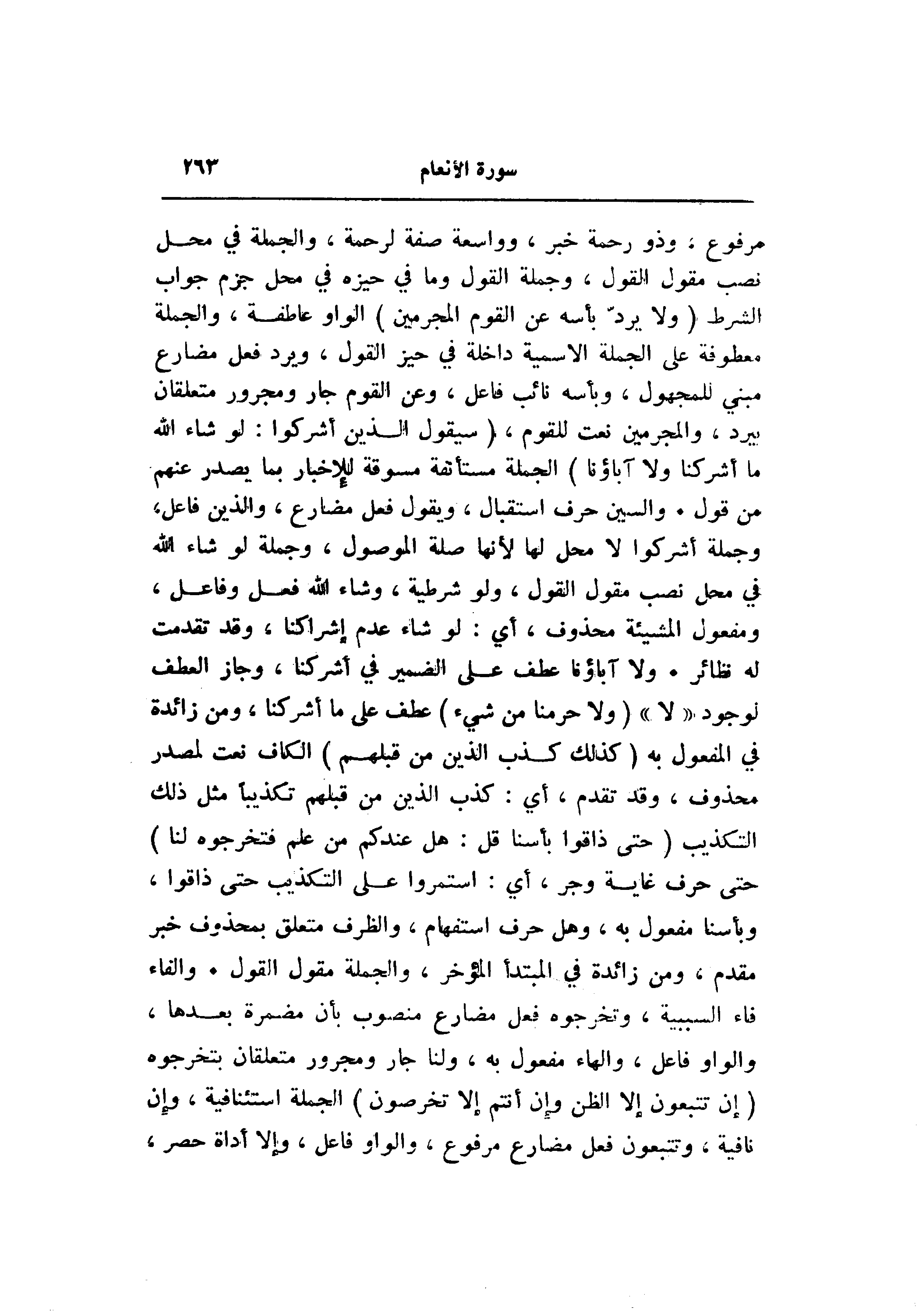 مرفوع، وذو رحمة خبر، وواسعة صفة لرحمة، والجملة في محل نصب مقول القول، وجملة القول وما في حيزه في محل جزم جواب الشرط (وَلا يُرَدُّ بَأْسُهُ عَنِ الْقَوْمِ الْمُجْرِمِينَ) الواو عاطفة، والجملة معطوفة على الجملة الاسمية داخلة في حيز القول، ويرد فعل مضارع مبني للمجهول، وبأسه نائب فاعل، وعن القوم جار ومجرور متعلقان بيرد، والمجرمين نعت للقوم، (سَيَقُولُ الَّذِينَ أَشْرَكُوا: لَوْ شاءَ اللَّهُ ما أَشْرَكْنا وَلا آباؤُنا) الجملة مستأنفة مسوقة للإخبار بما يصدر عنهم من قول. والسين حرف استقبال، ويقول فعل مضارع، والذين فاعل، وجملة أشركوا لا محل لها لأنها صلة الموصول، وجملة لو شاء الله في محل نصب مقول القول، ولو شرطية، وشاء الله فعل وفاعل، ومفعول المشيئة محذوف، أي: لو شاء عدم إشراكنا، وقد تقدمت له نظائر. ولا آباؤنا عطف على الضمير في أشركنا، وجاز العطف لوجود «لا» (وَلا حَرَّمْنا مِنْ شَيْءٍ) عطف على ما أشركنا، ومن زائدة في المفعول به (كَذلِكَ كَذَّبَ الَّذِينَ مِنْ قَبْلِهِمْ) الكاف نعت لمصدر محذوف، وقد تقدم، أي: كذب الذين من قبلهم تكذيبا مثل ذلك التكذيب (حَتَّى ذاقُوا بَأْسَنا قُلْ: هَلْ عِنْدَكُمْ مِنْ عِلْمٍ فَتُخْرِجُوهُ لَنا) حتى حرف غاية وجر، أي: استمروا على التكذيب حتى ذاقوا، وبأسنا مفعول به، وهل حرف استفهام، والظرف متعلق بمحذوف خبر مقدم، ومن زائدة في المبتدأ المؤخر، والجملة مقول القول. والفاء فاء السببية، وتخرجوه فعل مضارع منصوب بأن مضمرة بعدها، والواو فاعل، والهاء مفعول به، ولنا جار ومجرور متعلقان بتخرجوه (إِنْ تَتَّبِعُونَ إِلَّا الظَّنَّ وَإِنْ أَنْتُمْ إِلَّا تَخْرُصُونَ) الجملة استئنافية، وإن نافية، وتتبعون فعل مضارع مرفوع، والواو فاعل، وإلا أداة حصر،