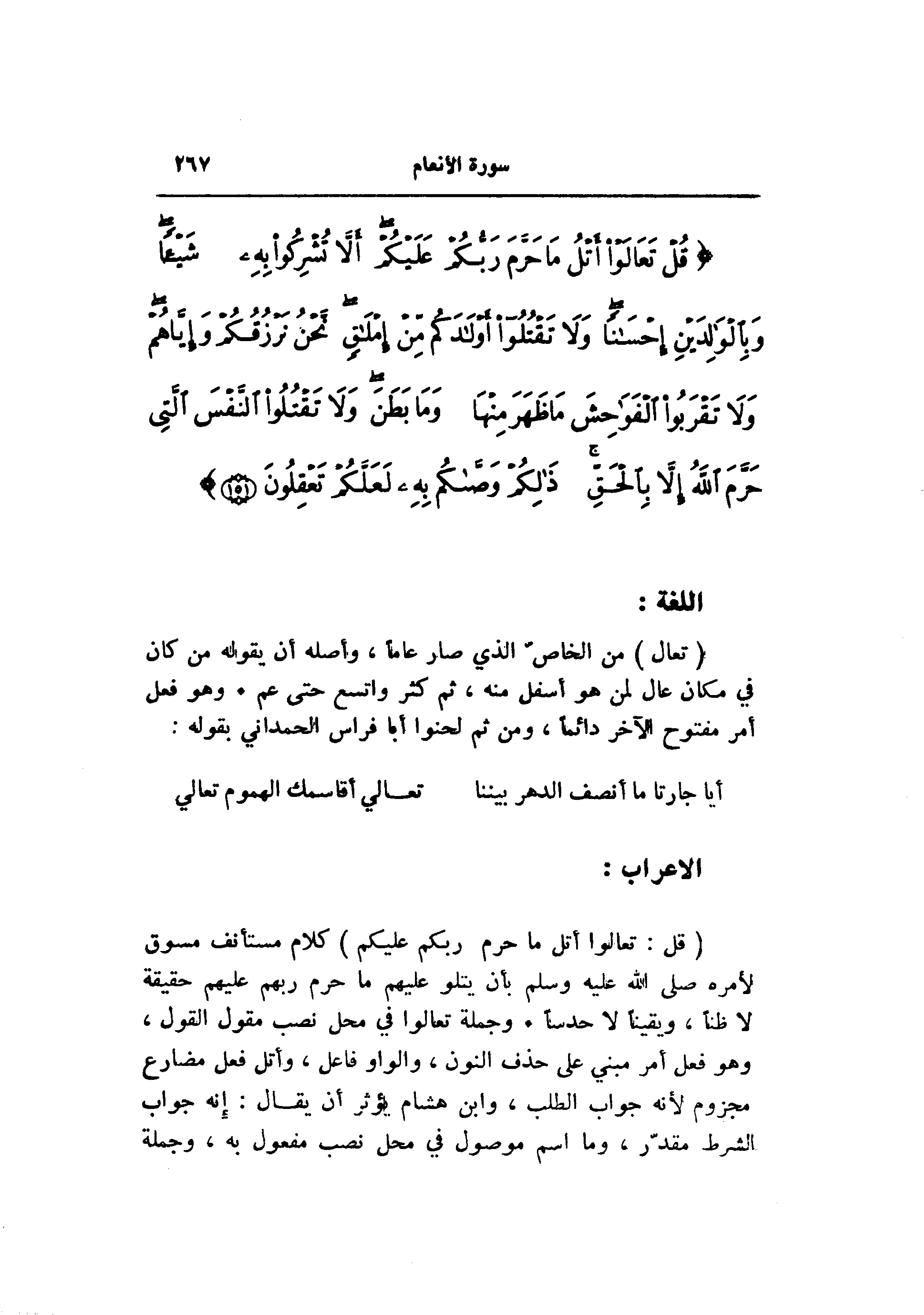 (قُلْ: تَعالَوْا أَتْلُ ما حَرَّمَ رَبُّكُمْ عَلَيْكُمْ) كلام مستأنف مسوق لأمره صلى الله عليه وسلم بأن يتلو عليهم ما حرم ربهم عليهم حقيقة لا ظنا، ويقينا لا حدسا. وجملة تعالوا في محل نصب مقول القول، وهو فعل أمر مبني على حذف النون، والواو فاعل، وأتل فعل مضارع مجزوم لأنه جواب الطلب، وابن هشام يؤثر أن يقال: إنه جواب الشرط مقدّر، وما اسم موصول في محل نصب مفعول به، وجملة