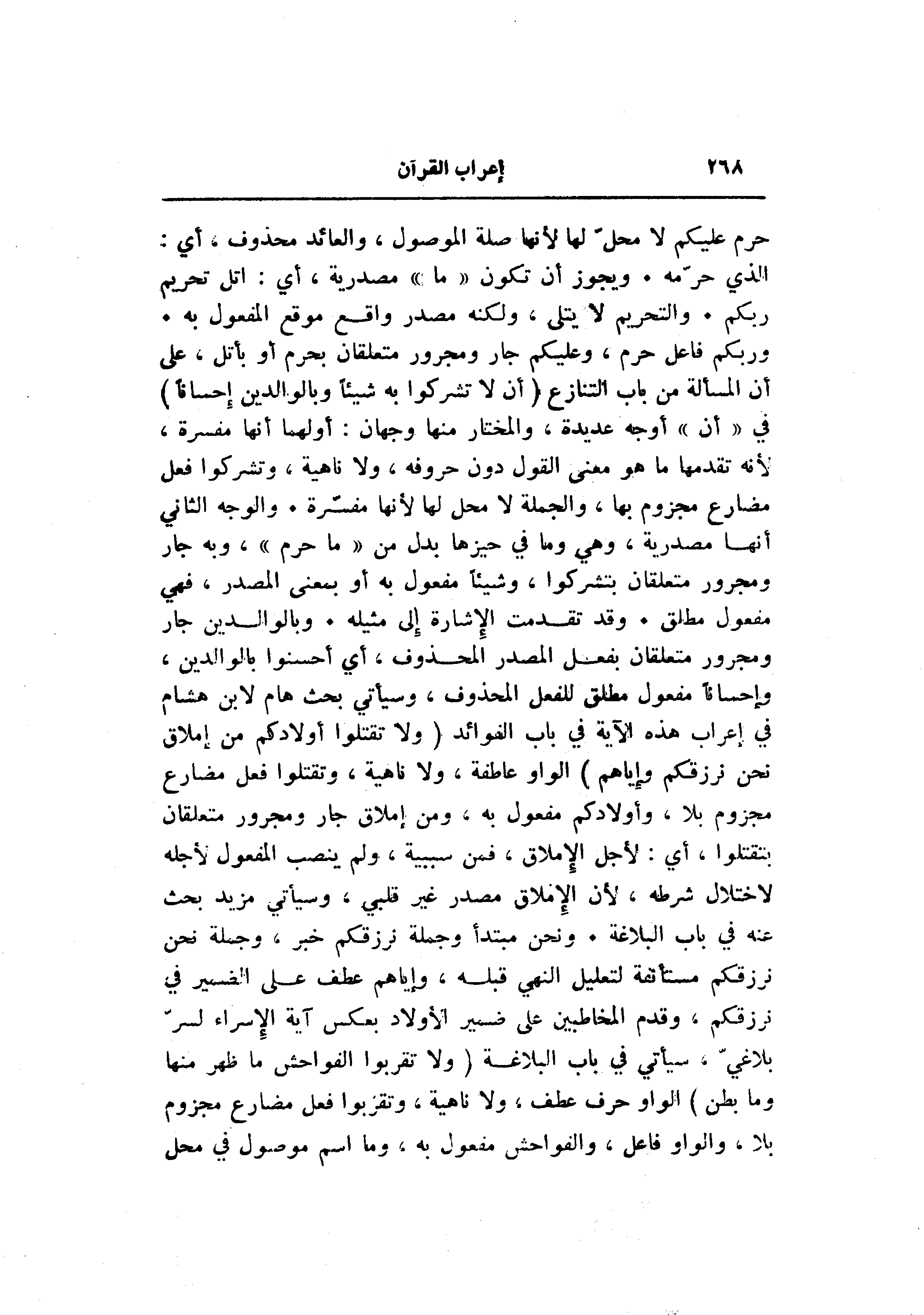 وربكم فاعل حرم، وعليكم جار ومجرور متعلقان بحرم أو بأتل، على أن المسألة من باب التنازع (أَلَّا تُشْرِكُوا بِهِ شَيْئاً وَبِالْوالِدَيْنِ إِحْساناً) في «أن» أوجه عديدة، والمختار منها وجهان: أولهما أنها مفسرة، لأنه تقدمها ما هو معنى القول دون حروفه، ولا ناهية، وتشركوا فعل مضارع مجزوم بها، والجملة لا محل لها لأنها مفسّرة. والوجه الثاني أنها مصدرية، وهي وما في حيزها بدل من «ما حرم» ، وبه جار ومجرور متعلقان بتشركوا، وشيئا مفعول به أو بمعنى المصدر، فهي مفعول مطلق. وقد تقدمت الإشارة إلى مثيله. وبالوالدين جار ومجرور متعلقان بفعل المصدر المحذوف، أي أحسنوا بالوالدين، وإحسانا مفعول مطلق للفعل المحذوف، وسيأتي بحث هام لابن هشام في إعراب هذه الآية في باب الفوائد (وَلا تَقْتُلُوا أَوْلادَكُمْ مِنْ إِمْلاقٍ نَحْنُ نَرْزُقُكُمْ وَإِيَّاهُمْ) الواو عاطفة، ولا ناهية، وتقتلوا فعل مضارع مجزوم بلا، وأولادكم مفعول به، ومن إملاق جار ومجرور متعلقان بتقتلوا، أي: لأجل الإملاق، فمن سببية، ولم ينصب المفعول لأجله لاختلال شرطه، لأن الإملاق مصدر غير قلبي، وسيأتي مزيد بحث عنه في باب البلاغة. ونحن مبتدأ وجملة نرزقكم خبر، وجملة نحن نرزقكم مستأنفة لتعليل النهي قبله، وإياهم عطف على الضمير في نرزقكم، وقدم المخاطبين على ضمير الأولاد بعكس آية الإسراء لسرّ بلاغي، سيأتي في باب البلاغة (وَلا تَقْرَبُوا الْفَواحِشَ ما ظَهَرَ مِنْها وَما بَطَنَ) الواو حرف عطف، ولا ناهية، وتقربوا فعل مضارع مجزوم بلا، والواو فاعل، والفواحش مفعول به، وما اسم موصول في محل