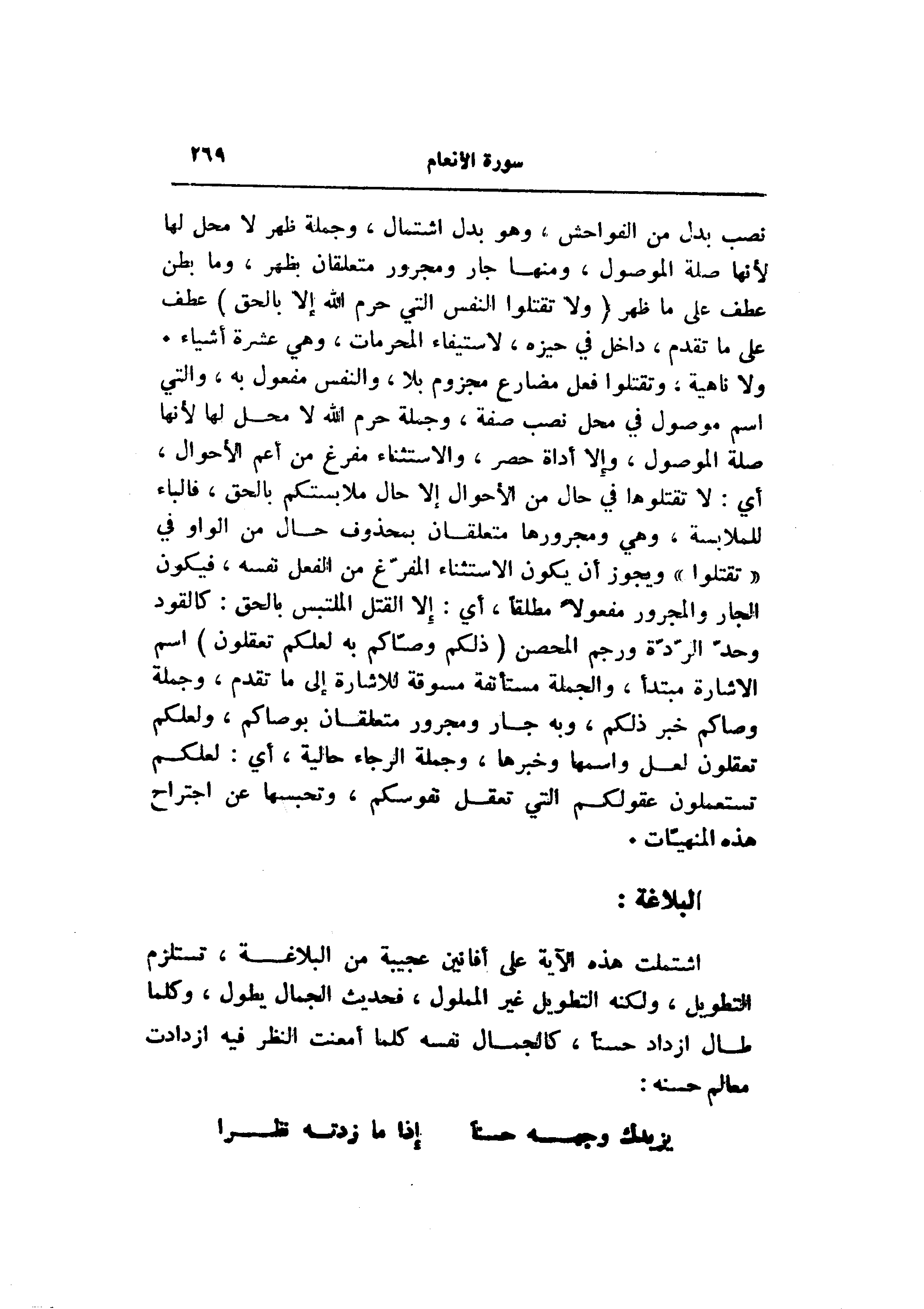نصب بدل من الفواحش، وهو بدل اشتمال، وجملة ظهر لا محل لها لأنها صلة الموصول، ومنها جار ومجرور متعلقان بظهر، وما بطن عطف على ما ظهر (وَلا تَقْتُلُوا النَّفْسَ الَّتِي حَرَّمَ اللَّهُ إِلَّا بِالْحَقِّ) عطف على ما تقدم، داخل في حيزه، لاستيفاء المحرمات، وهي عشرة أشياء.