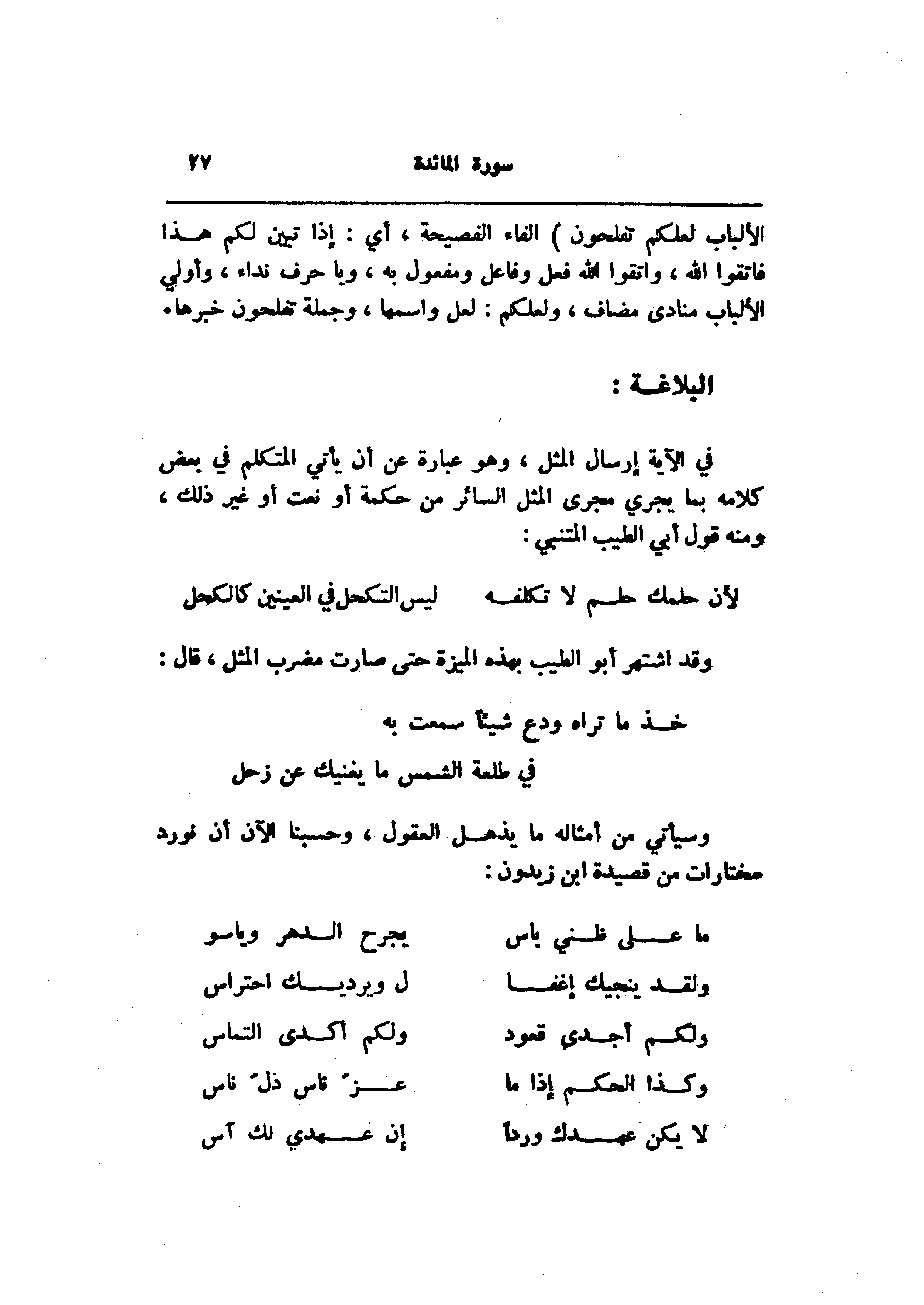 في الآية إرسال المثل، وهو عبارة عن أن يأتي المتكلم في بعض كلامه بما يجري مجرى المثل السائر من حكمة أو نعت أو غير ذلك، ومنه قول أبي الطيب المتنبي:
