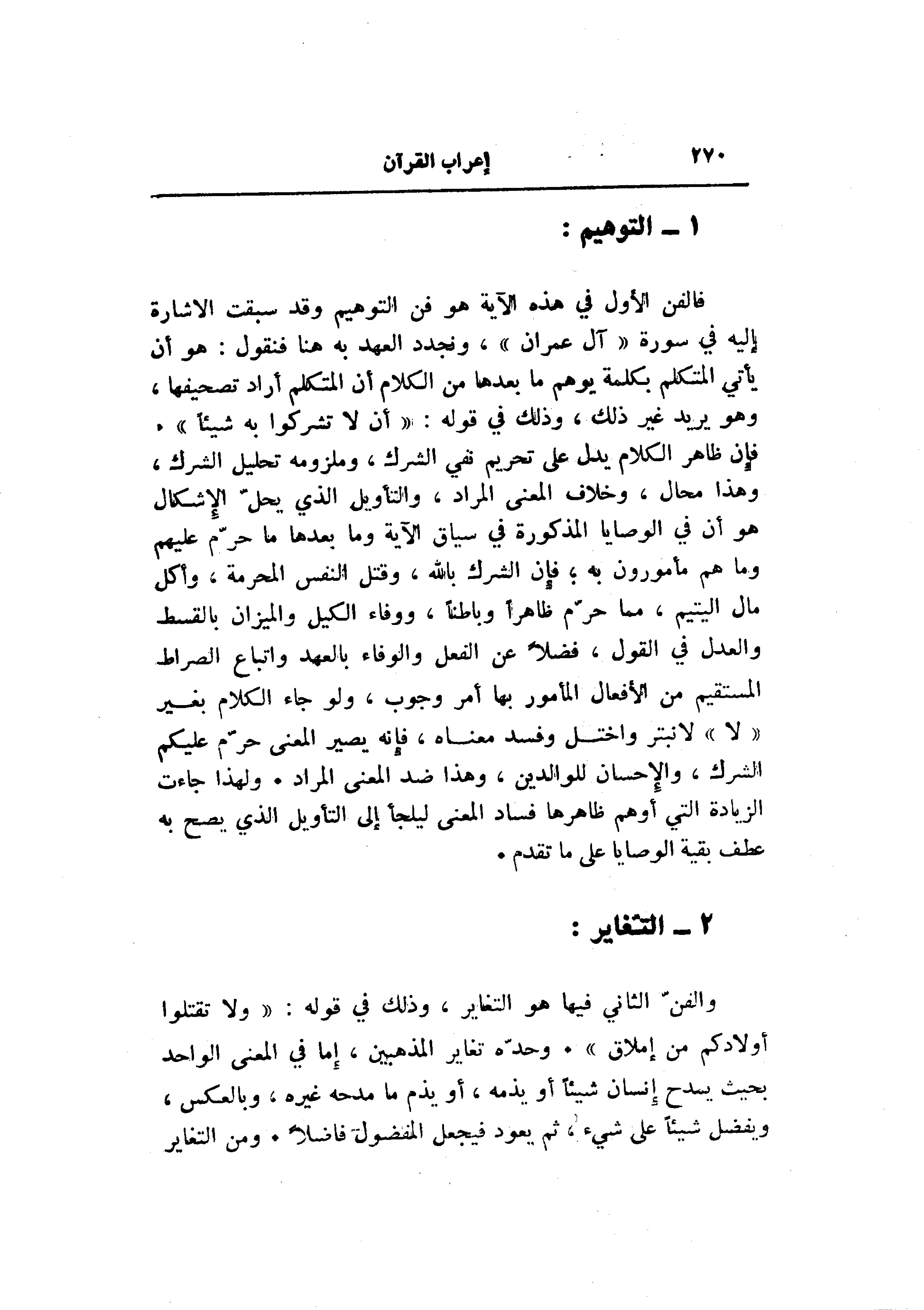 فالفن الأول في هذه الآية هو فن التوهيم وقد سبقت الاشارة إليه في سورة «آل عمران» ، ونجدد العهد به هنا فنقول: هو أن يأتي المتكلم بكلمة يوهم ما بعدها من الكلام أن المتكلم أراد تصحيفها، وهو يريد غير ذلك، وذلك في قوله: «أن لا تشركوا به شيئا» .