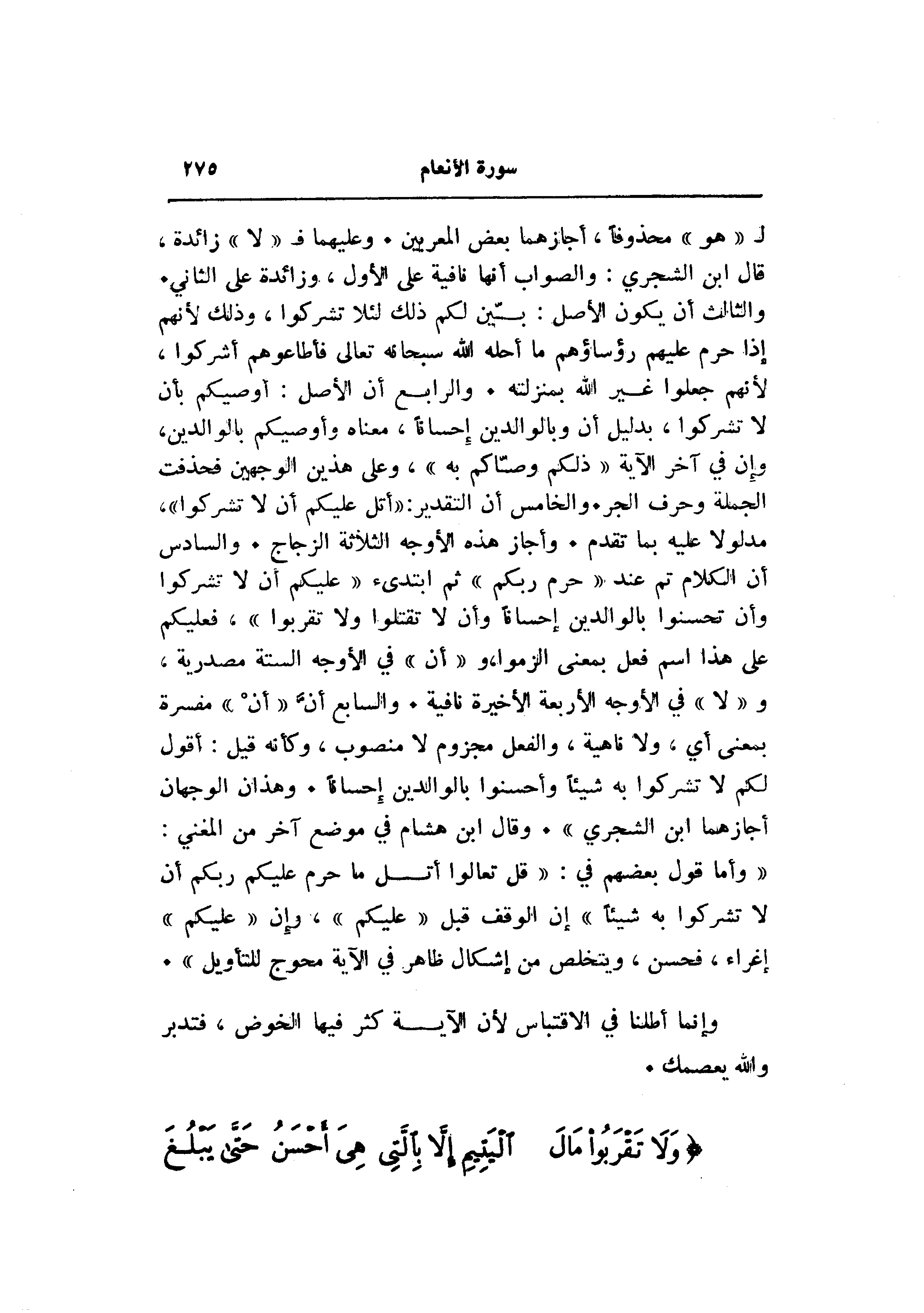 والثالث أن يكون الأصل: بيّن لكم ذلك لئلا تشركوا، وذلك لأنهم إذا حرم عليهم رؤساؤهم ما أحله الله سبحانه تعالى فأطاعوهم أشركوا، لأنهم جعلوا غير الله بمنزلته. والرابع أن الأصل: أوصيكم بأن لا تشركوا، بدليل أن وبالوالدين إحسانا، معناه وأوصيكم بالوالدين، وإن في آخر الآية «ذلكم وصّاكم به» ، وعلى هذين الوجهين فحذفت الجملة وحرف الجر. والخامس أن التقدير: «أتل عليكم أن لا تشركوا» ، مدلولا عليه بما تقدم. وأجاز هذه الأوجه الثلاثة الزجاج. والسادس أن الكلام تم عند «حرم ربكم» ثم ابتدئ «عليكم أن لا تشركوا وأن تحسنوا بالوالدين إحسانا وأن لا تقتلوا ولا تقربوا» ، فعليكم على هذا اسم فعل بمعنى الزموا، و «أن» في الأوجه الستة مصدرية، و «لا» في الأوجه الأربعة الأخيرة نافية. والسابع أنّ «أن» مفسرة بمعنى أي، ولا ناهية، والفعل مجزوم لا منصوب، وكأنه قيل: أقول لكم لا تشركوا به شيئا وأحسنوا بالوالدين إحسانا. وهذان الوجهان أجازهما ابن الشجري» . وقال ابن هشام في موضع آخر من المغني: