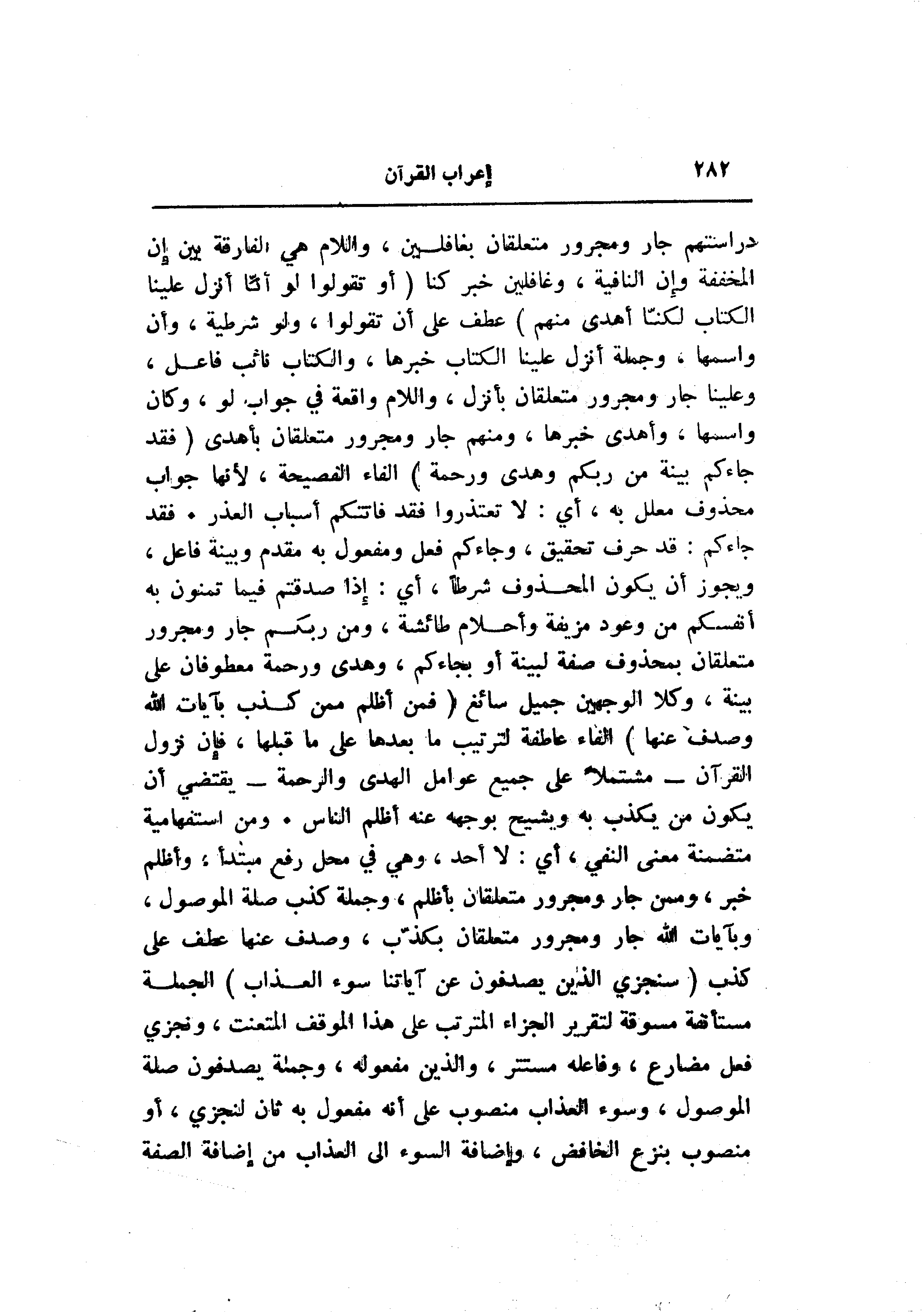 دراستهم جار ومجرور متعلقان بغافلين، واللام هي الفارقة بين إن المخففة وإن النافية، وغافلين خبر كنا (أَوْ تَقُولُوا لَوْ أَنَّا أُنْزِلَ عَلَيْنَا الْكِتابُ لَكُنَّا أَهْدى مِنْهُمْ) عطف على أن تقولوا، ولو شرطية، وأن واسمها، وجملة أنزل علينا الكتاب خبرها، والكتاب نائب فاعل، وعلينا جار ومجرور متعلقان بأنزل، واللام واقعة في جواب لو، وكان واسمها، وأهدى خبرها، ومنهم جار ومجرور متعلقان بأهدى (فَقَدْ جاءَكُمْ بَيِّنَةٌ مِنْ رَبِّكُمْ وَهُدىً وَرَحْمَةٌ) الفاء الفصيحة، لأنها جواب محذوف معلل به، أي: لا تعتذروا فقد فاتتكم أسباب العذر. فقد جاءكم: قد حرف تحقيق، وجاءكم فعل ومفعول به مقدم وبينة فاعل، ويجوز أن يكون المحذوف شرطا، أي: إذا صدقتم فيما تمنون به أنفسكم من وعود مزيفة وأحلام طائشة، ومن ربكم جار ومجرور متعلقان بمحذوف صفة لبينة أو بجاءكم، وهدى ورحمة معطوفان على بينة، وكلا الوجهين جميل سائغ (فَمَنْ أَظْلَمُ مِمَّنْ كَذَّبَ بِآياتِ اللَّهِ وَصَدَفَ عَنْها) الفاء عاطفة لترتيب ما بعدها على ما قبلها، فإن نزول القرآن- مشتملا على جميع عوامل الهدى والرحمة- يقتضي أن يكون من يكذب به ويشيح بوجهه عنه أظلم الناس. ومن استفهامية متضمنة معنى النفي، أي: لا أحد، وهي في محل رفع مبتدأ، وأظلم خبر، وممن جار ومجرور متعلقان بأظلم، وجملة كذب صلة الموصول، وبآيات الله جار ومجرور متعلقان بكذّب، وصدف عنها عطف على كذب (سَنَجْزِي الَّذِينَ يَصْدِفُونَ عَنْ آياتِنا سُوءَ الْعَذابِ) الجملة مستأنفة مسوقة لتقرير الجزاء المترتب على هذا الموقف المتعنت، ونجزي فعل مضارع، وفاعله مستتر، والذين مفعوله، وجملة يصدفون صلة الموصول، وسوء العذاب منصوب على أنه مفعول به ثان لنجزي، أو منصوب بنزع الخافض، وإضافة السوء الى العذاب من إضافة الصفة