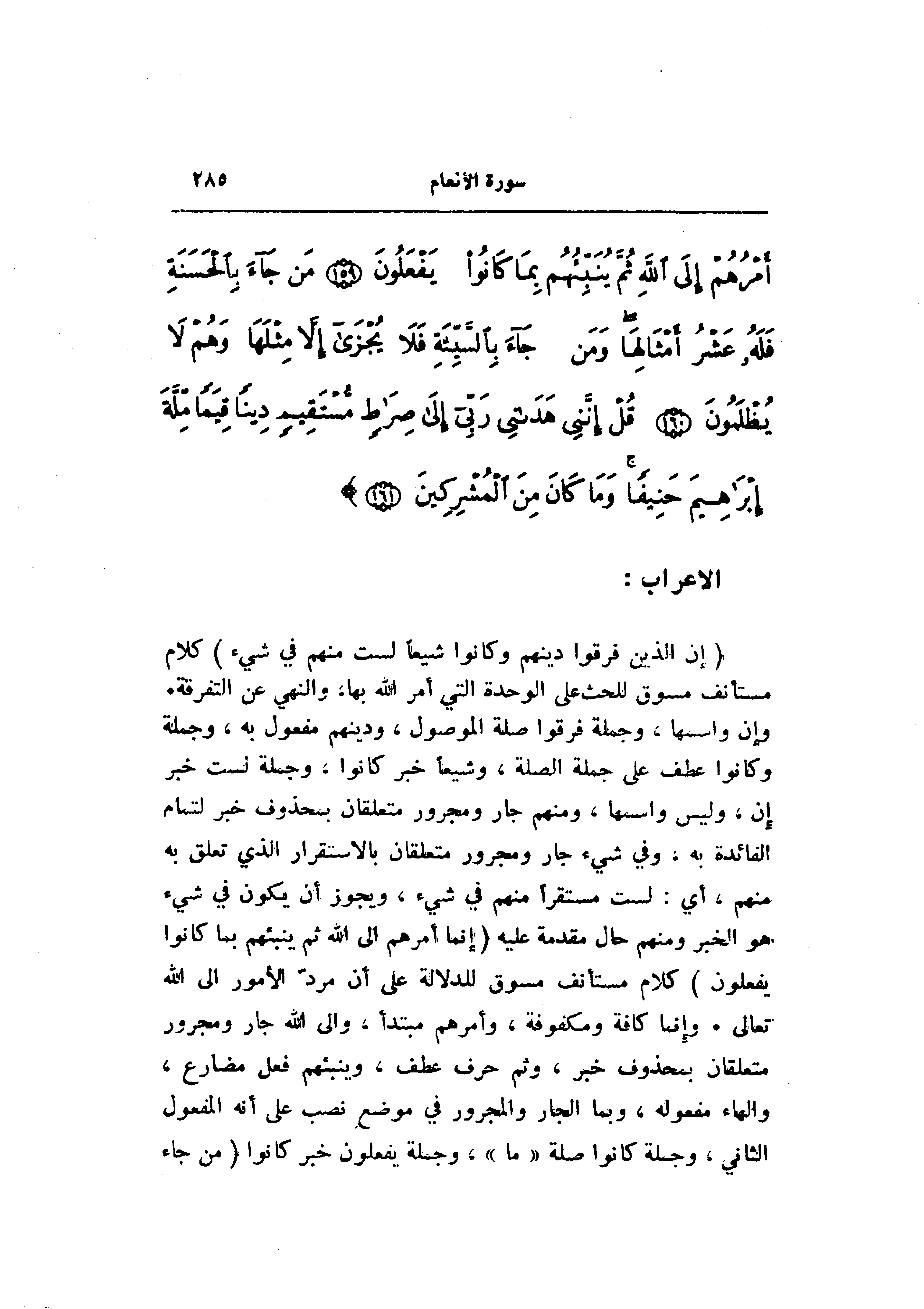 وإن واسمها، وجملة فرقوا صلة الموصول، ودينهم مفعول به، وجملة وكانوا عطف على جملة الصلة، وشيعا خبر كانوا، وجملة لست خبر إن، وليس واسمها، ومنهم جار ومجرور متعلقان بمحذوف خبر لتمام الفائدة به، وفي شيء جار ومجرور متعلقان بالاستقرار الذي تعلق به منهم، أي: لست مستقرا منهم في شيء، ويجوز أن يكون في شيء هو الخبر ومنهم حال مقدمة عليه (إِنَّما أَمْرُهُمْ إِلَى اللَّهِ ثُمَّ يُنَبِّئُهُمْ بِما كانُوا يَفْعَلُونَ) كلام مستأنف مسوق للدلالة على أن مردّ الأمور الى الله تعالى. وإنما كافة ومكفوفة، وأمرهم مبتدأ، والى الله جار ومجرور متعلقان بمحذوف خبر، وثم حرف عطف، وينبئهم فعل مضارع، والهاء مفعوله، وبما الجار والمجرور في موضع نصب على أنه المفعول الثاني، وجملة كانوا صلة «ما» ، وجملة يفعلون خبر كانوا (مَنْ جاءَ