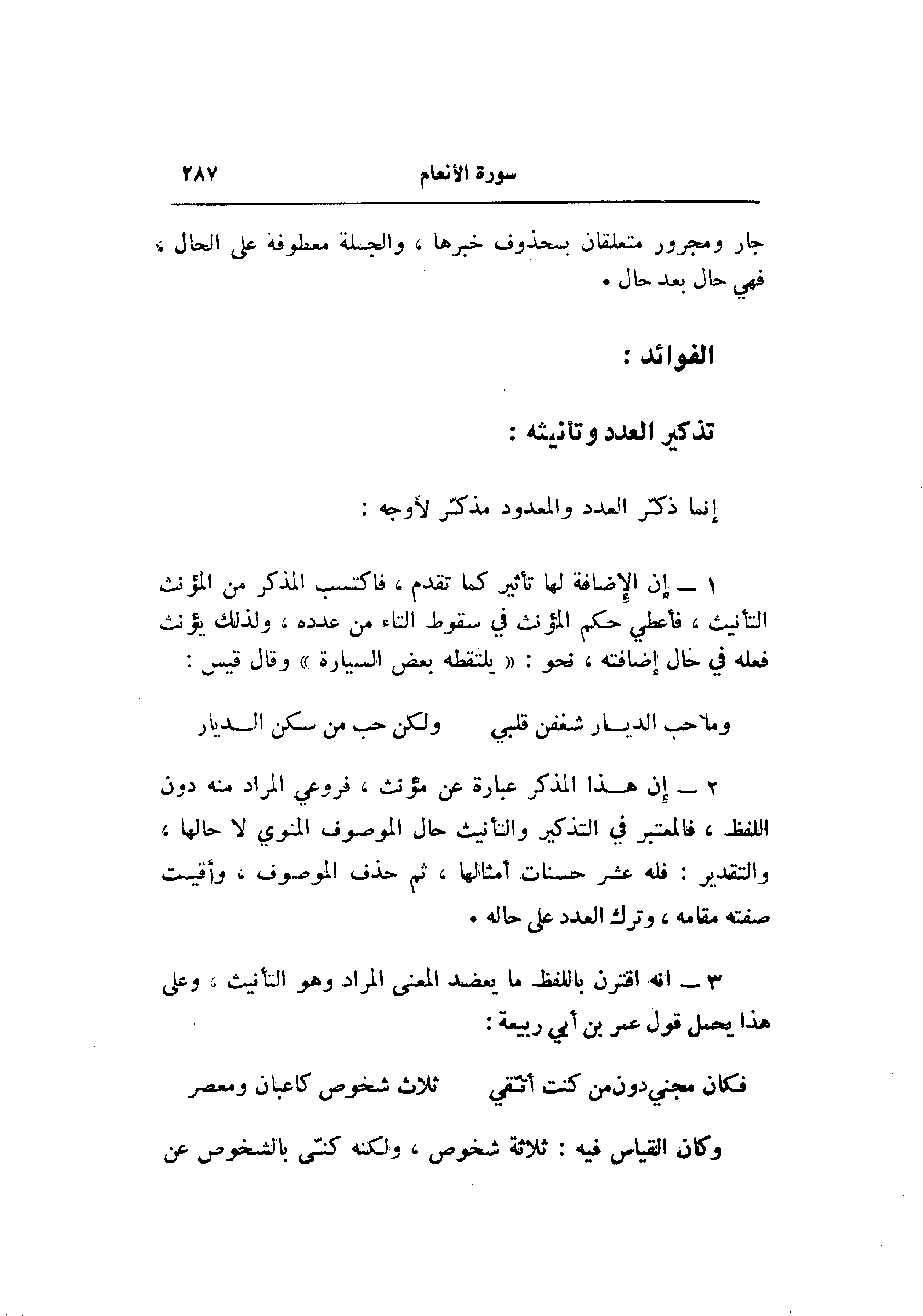 2- إن هذا المذكر عبارة عن مؤنث، فروعي المراد منه دون اللفظ، فالمعتبر في التذكير والتأنيث حال الموصوف المنوي لا حالها، والتقدير: فله عشر حسنات أمثالها، ثم حذف الموصوف، وأقيمت صفته مقامه، وترك العدد على حاله.