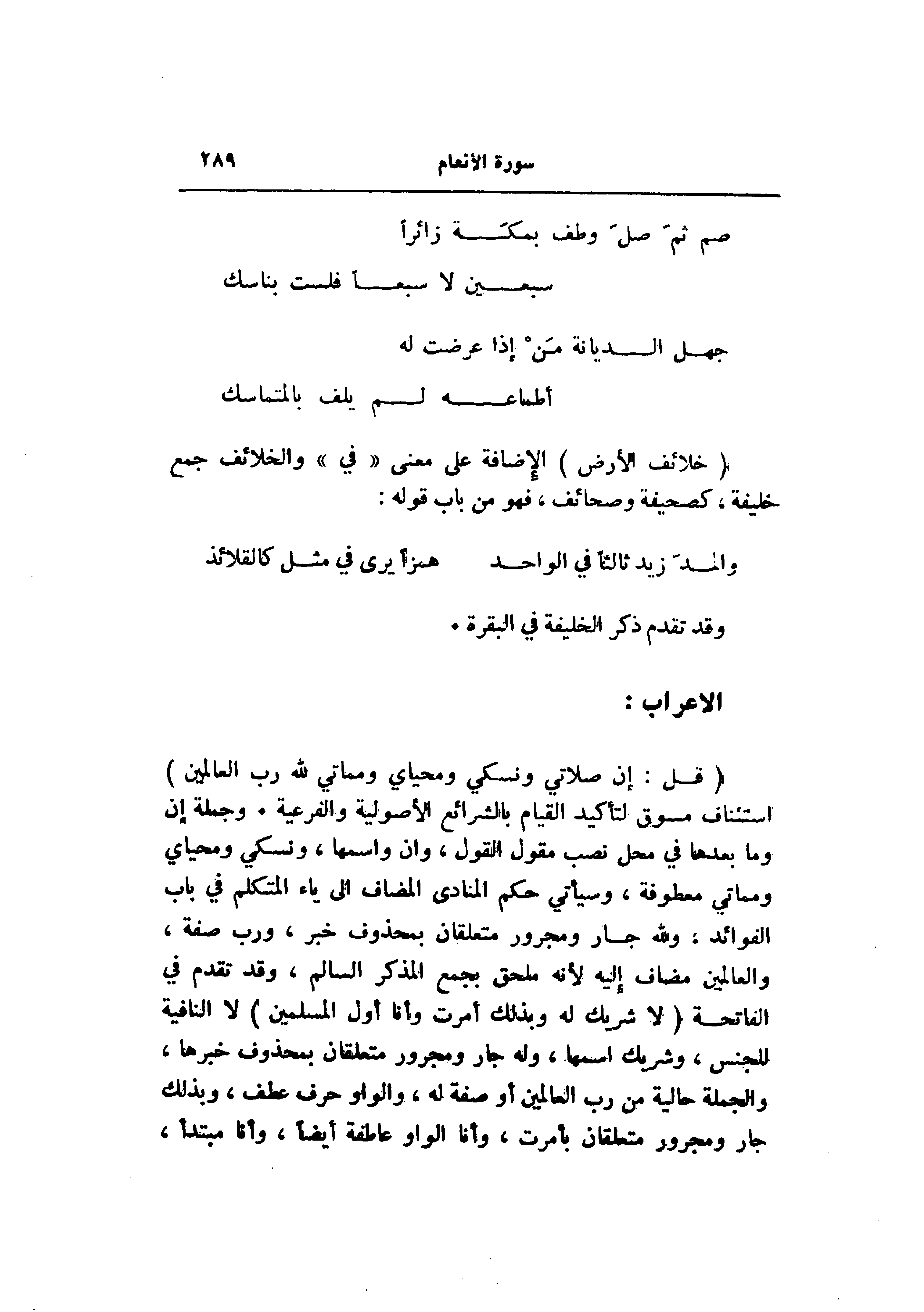 (قُلْ: إِنَّ صَلاتِي وَنُسُكِي وَمَحْيايَ وَمَماتِي لِلَّهِ رَبِّ الْعالَمِينَ) استئناف مسوق لتأكيد القيام بالشرائع الأصولية والفرعية. وجملة إن وما بعدها في محل نصب مقول القول، وان واسمها، ونسكي ومحياي ومماتي معطوفة، وسيأتي حكم المنادى المضاف الى ياء المتكلم في باب الفوائد، ولله جار ومجرور متعلقان بمحذوف خبر، ورب صفة، والعالمين مضاف إليه لأنه ملحق بجمع المذكر السالم، وقد تقدم في الفاتحة (لا شَرِيكَ لَهُ وَبِذلِكَ أُمِرْتُ وَأَنَا أَوَّلُ الْمُسْلِمِينَ) لا النافية للجنس، وشريك اسمها، وله جار ومجرور متعلقان بمحذوف خبرها، والجملة حالية من رب العالمين أو صفة له، والواو حرف عطف، وبذلك جار ومجرور متعلقان بأمرت، وأنا الواو عاطفة أيضا، وأنا مبتدأ،