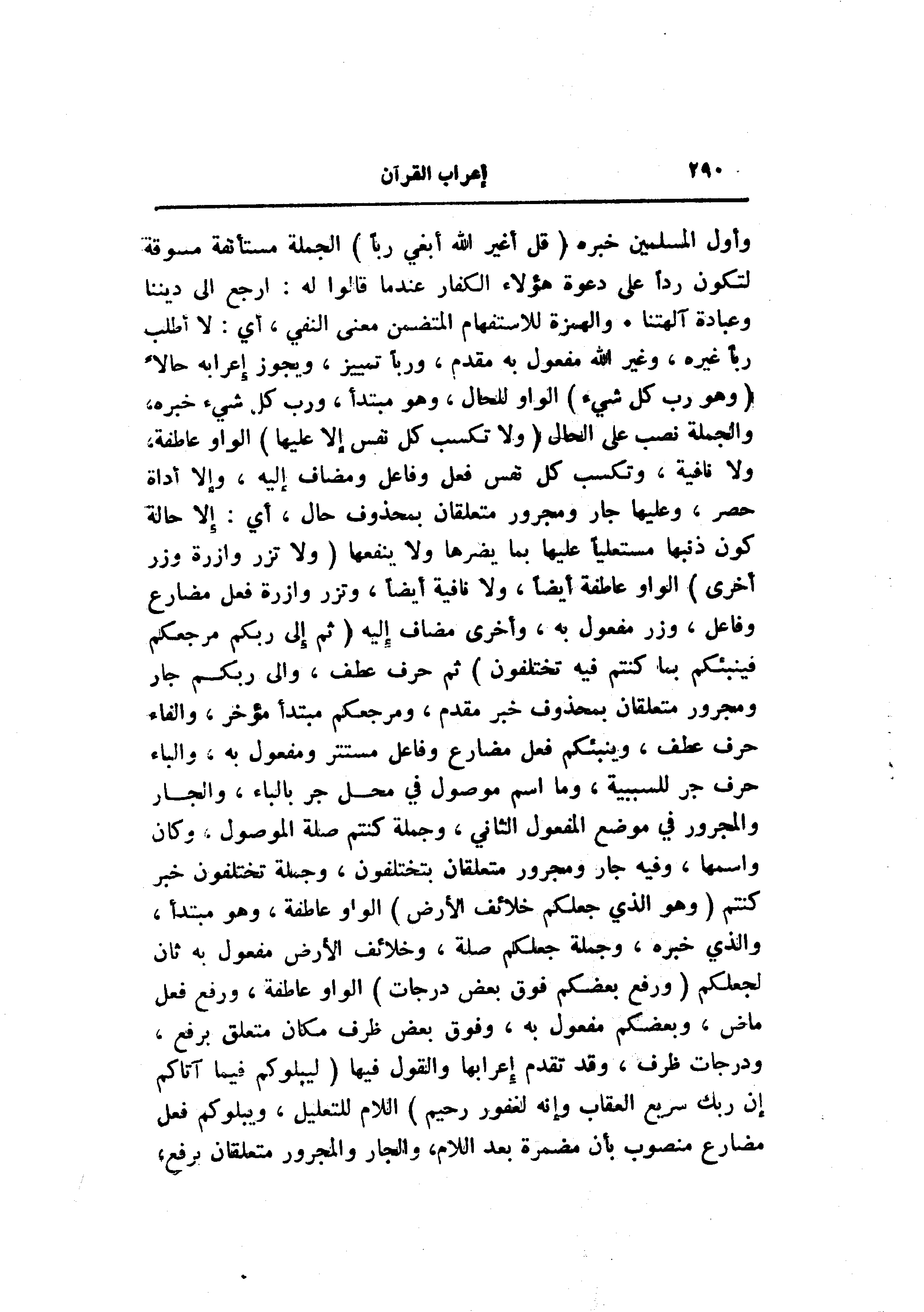 وأول المسلمين خبره (قُلْ أَغَيْرَ اللَّهِ أَبْغِي رَبًّا) الجملة مستأنفة مسوقة لتكون بدا على دعوة هؤلاء الكفار عند ما قالوا له: ارجع إلى ديننا وعبادة آلهتنا. والهمزة للاستفهام المتضمن معنى النفي، أي: لا أطلب ربا غيره، وغير الله مفعول به مقدم، وربا تمييز، ويجوز إعرابه حالا (وَهُوَ رَبُّ كُلِّ شَيْءٍ) الواو للحال، وهو مبتدأ، ورب كل شيء خبره، والجملة نصب على الحال (وَلا تَكْسِبُ كُلُّ نَفْسٍ إِلَّا عَلَيْها) الواو عاطفة، ولا نافية، وتكسب كل نفس فعل وفاعل ومضاف إليه، وإلا أداة حصر، وعليها جار ومجرور متعلقان بمحذوف حال، أي: إلا حالة كون ذنبها مستعليا عليها بما يضرها ولا ينفعها (وَلا تَزِرُ وازِرَةٌ وِزْرَ أُخْرى) الواو عاطفة أيضا، ولا نافية أيضا، وتزر وازرة فعل مضارع وفاعل، وزر مفعول به، وأخرى مضاف إليه (ثُمَّ إِلى رَبِّكُمْ مَرْجِعُكُمْ فَيُنَبِّئُكُمْ بِما كُنْتُمْ فِيهِ تَخْتَلِفُونَ) ثم حرف عطف، وإلى ربكم جار ومجرور متعلقان بمحذوف خبر مقدم، ومرجعكم مبتدأ مؤخر، والفاء حرف عطف، وينبئكم فعل مضارع وفاعل مستتر ومفعول به، والباء حرف جر للسببية، وما اسم موصول في محل جر بالباء، والجار والمجرور في موضع المفعول الثاني، وجملة كنتم صلة الموصول، وكان واسمها، وفيه جار ومجرور متعلقان بتختلفون، وجملة تختلفون خبر كنتم (وَهُوَ الَّذِي جَعَلَكُمْ خَلائِفَ الْأَرْضِ) الواو عاطفة، وهو مبتدأ، والذي خبره، وجملة جعلكم صلة، وخلائف الأرض مفعول به ثان لجعلكم (وَرَفَعَ بَعْضَكُمْ فَوْقَ بَعْضٍ دَرَجاتٍ) الواو عاطفة، ورفع فعل ماض، وبعضكم مفعول به، وفوق بعض ظرف مكان متعلق برفع، ودرجات ظرف، وقد تقدم إعرابها والقول فيها (لِيَبْلُوَكُمْ فِي ما آتاكُمْ إِنَّ رَبَّكَ سَرِيعُ الْعِقابِ وَإِنَّهُ لَغَفُورٌ رَحِيمٌ) اللام للتعليل، ويبلوكم فعل مضارع منصوب بأن مضمرة بعد اللام، والجار والمجرور متعلقان برفع،