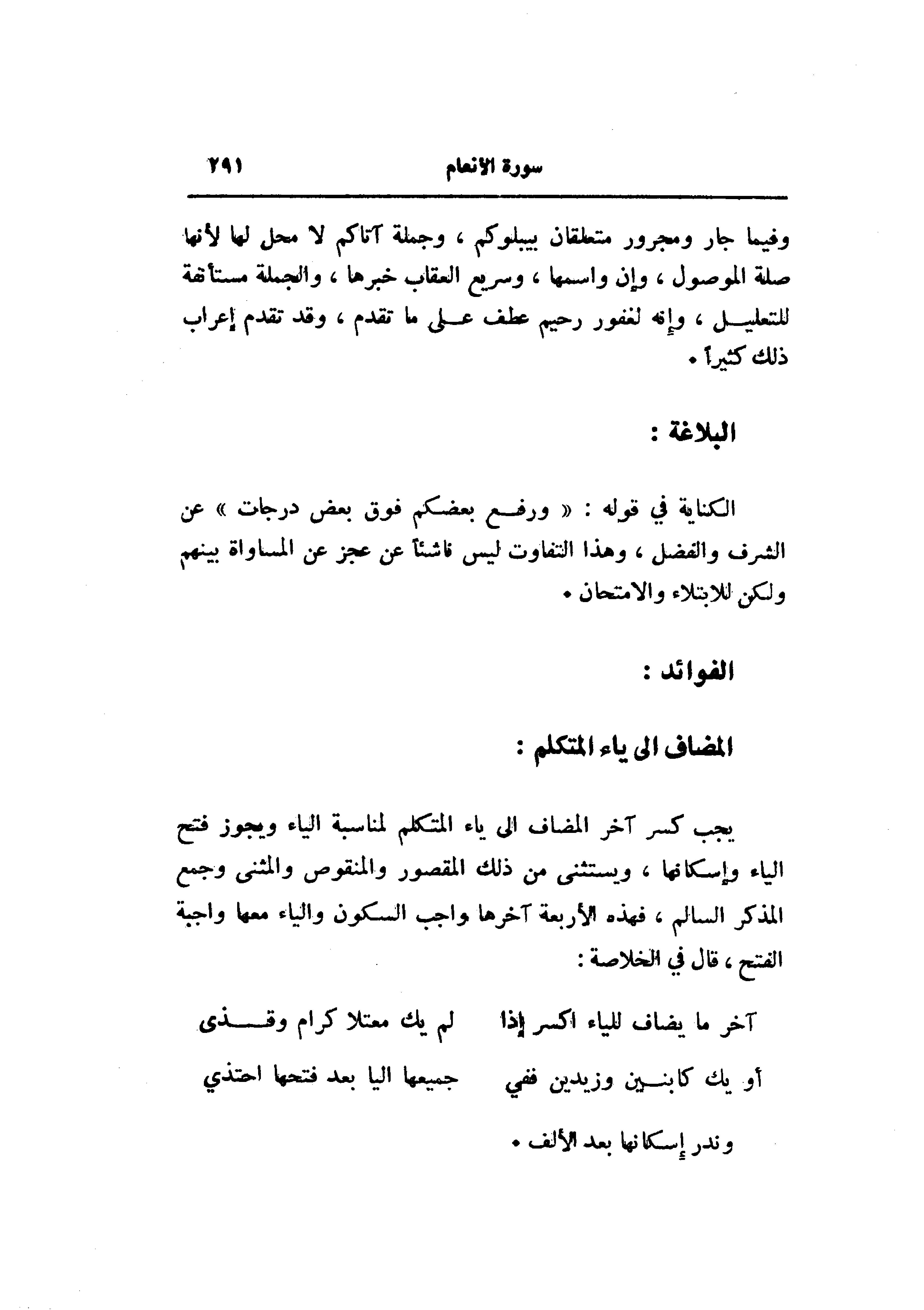 يجب كسر آخر المضاف إلى ياء المتكلم لمناسبة الياء ويجوز فتح الياء وإسكانها، ويستثنى من ذلك المقصور والمنقوص والمثنى وجمع المذكر السالم، فهذه الأربعة آخرها واجب السكون والياء معها واجبة الفتح، قال في الخلاصة: