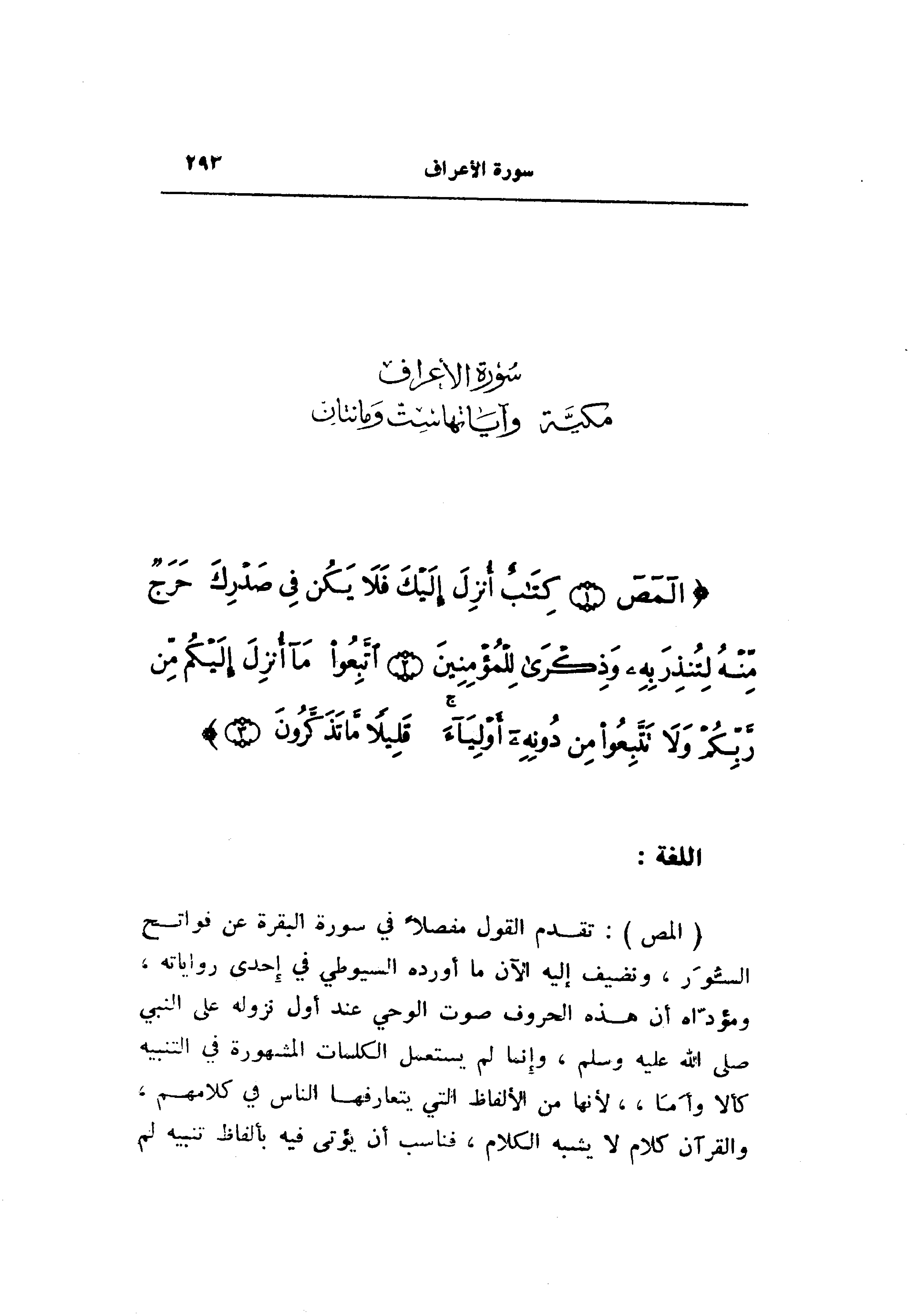 (المص) : تقدم القول مفصلا في سورة البقرة عن فواتح السّور، ونضيف إليه الآن ما أورده السيوطي في إحدى رواياته، ومؤدّاه أن هذه الحروف صوت الوحي عند أول نزوله على النبي صلى الله عليه وسلم، وإنما لم يستعمل الكلمات المشهورة في التنبيه كألا وأما،، لأنها من الألفاظ التي يتعارفها الناس في كلامهم، والقرآن كلام لا يشبه الكلام، فناسب أن يؤتى فيه بألفاظ تنبيه لم